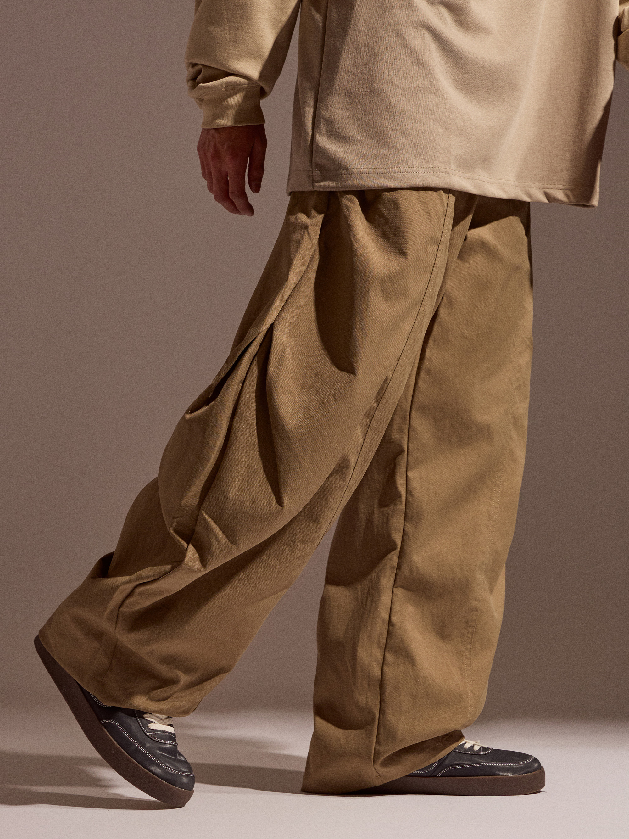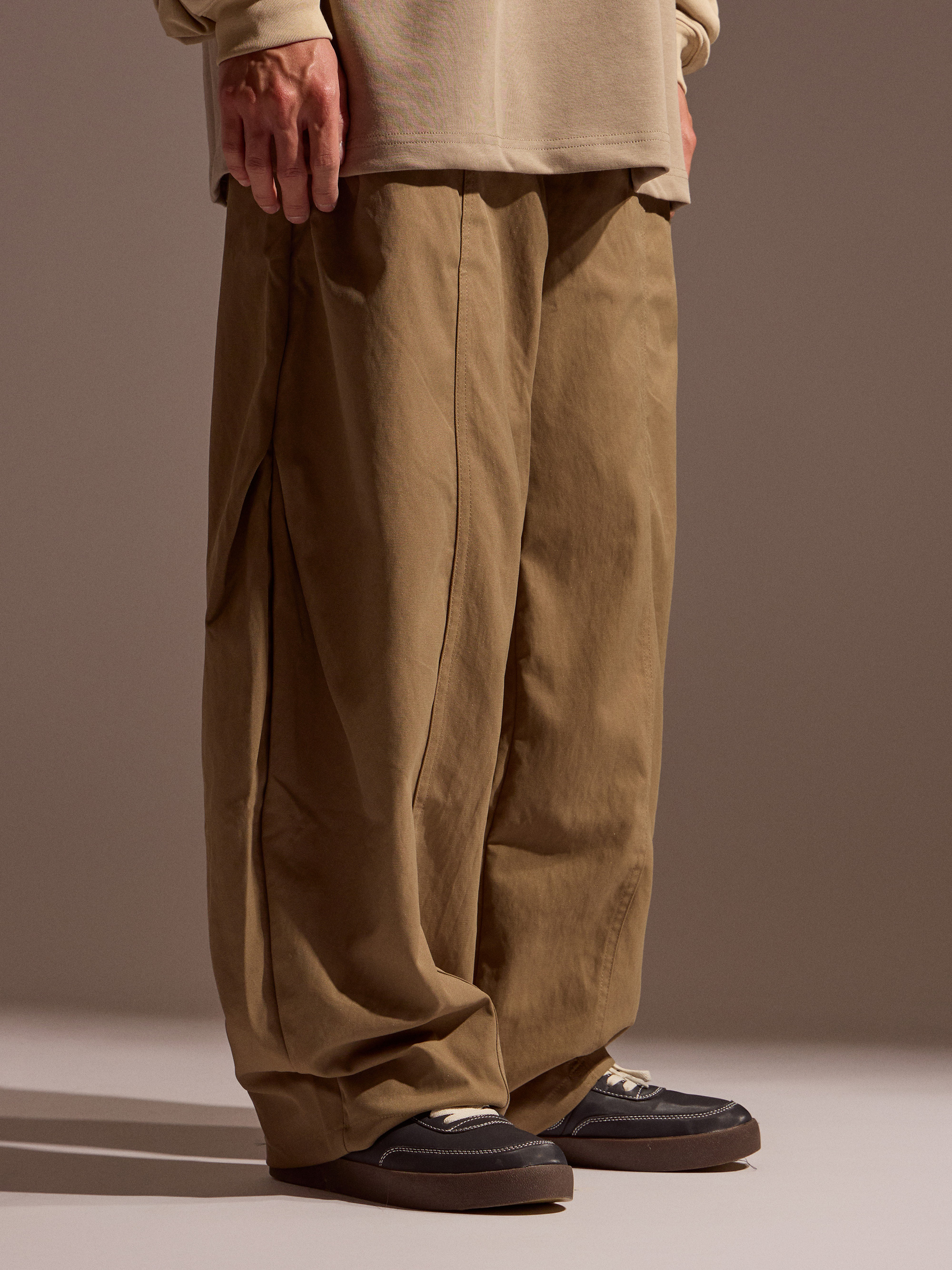 從圖片可見,褲身側邊加入打摺細節,使寬版褲型在行走與活動時形成自然立體感,不會因版型寬鬆而顯得鬆散。這樣的設計讓機能褲在保持活動空間的同時,也能維持俐落輪廓,適合長時間穿著的使用情境。
