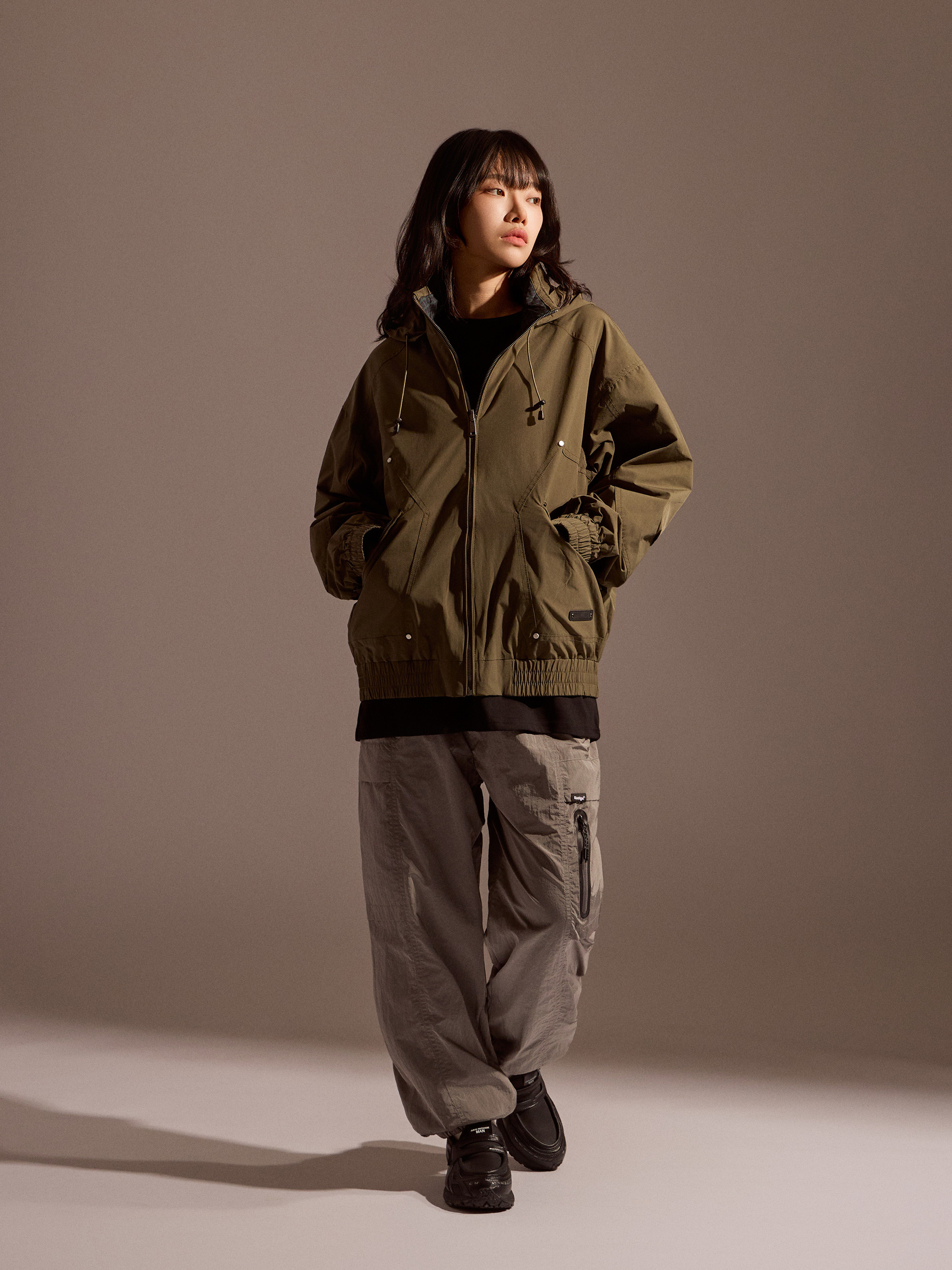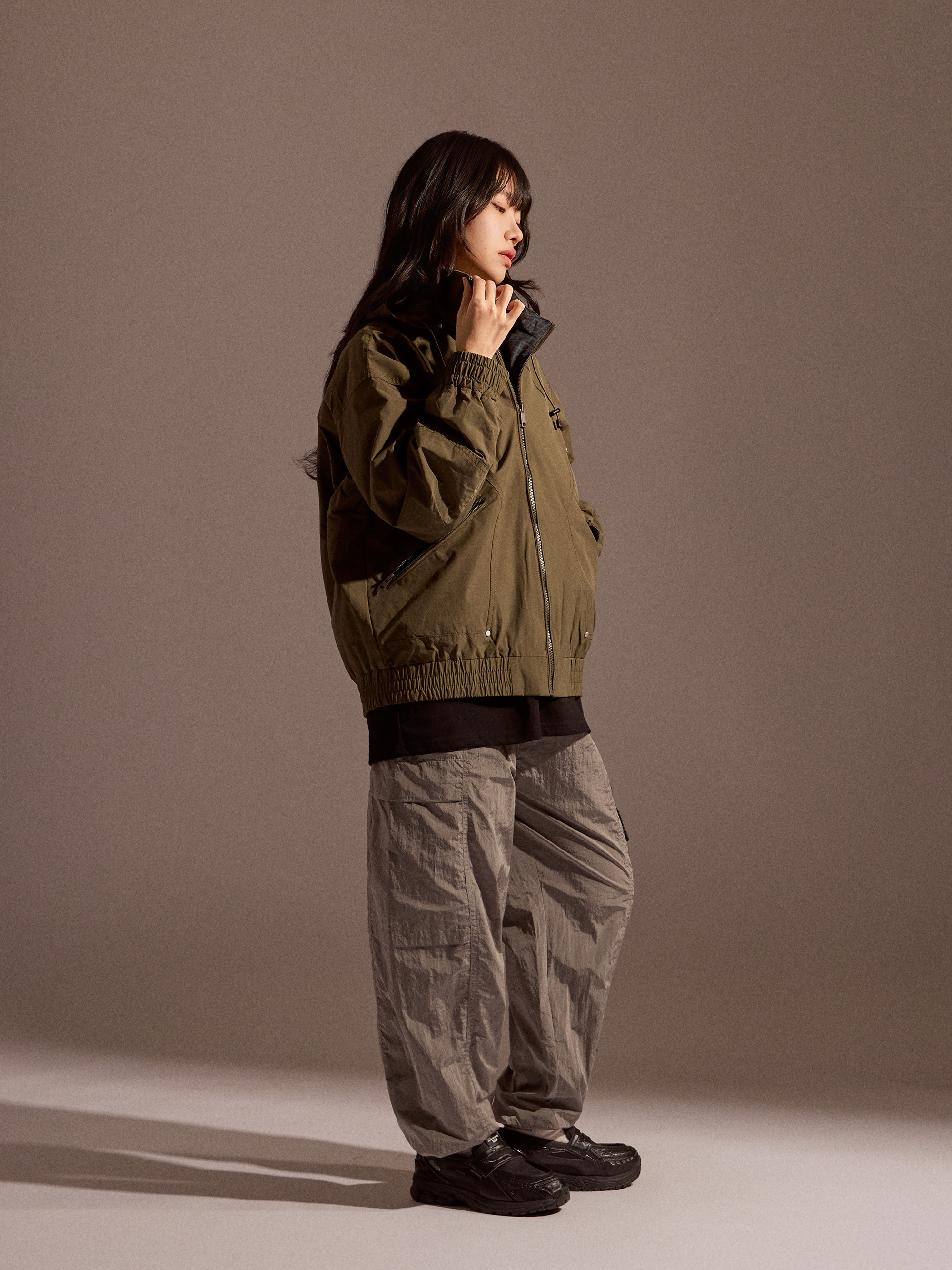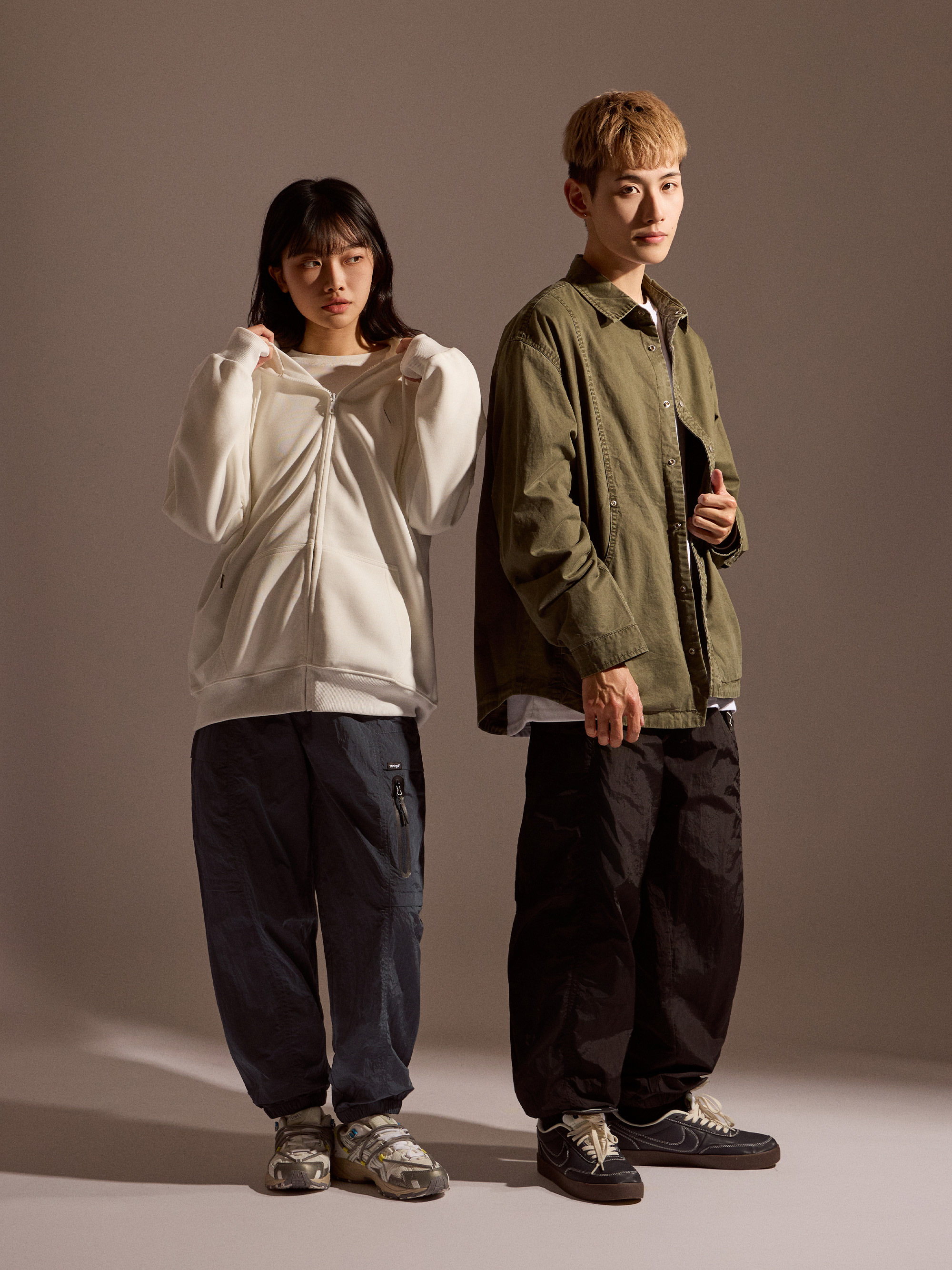 ‧多功能工裝輪廓:Oversize 寬鬆剪裁結合壓膠拉鍊、多口袋與可調式腰帶設計,展現機能工裝風格,實用與造型兼具