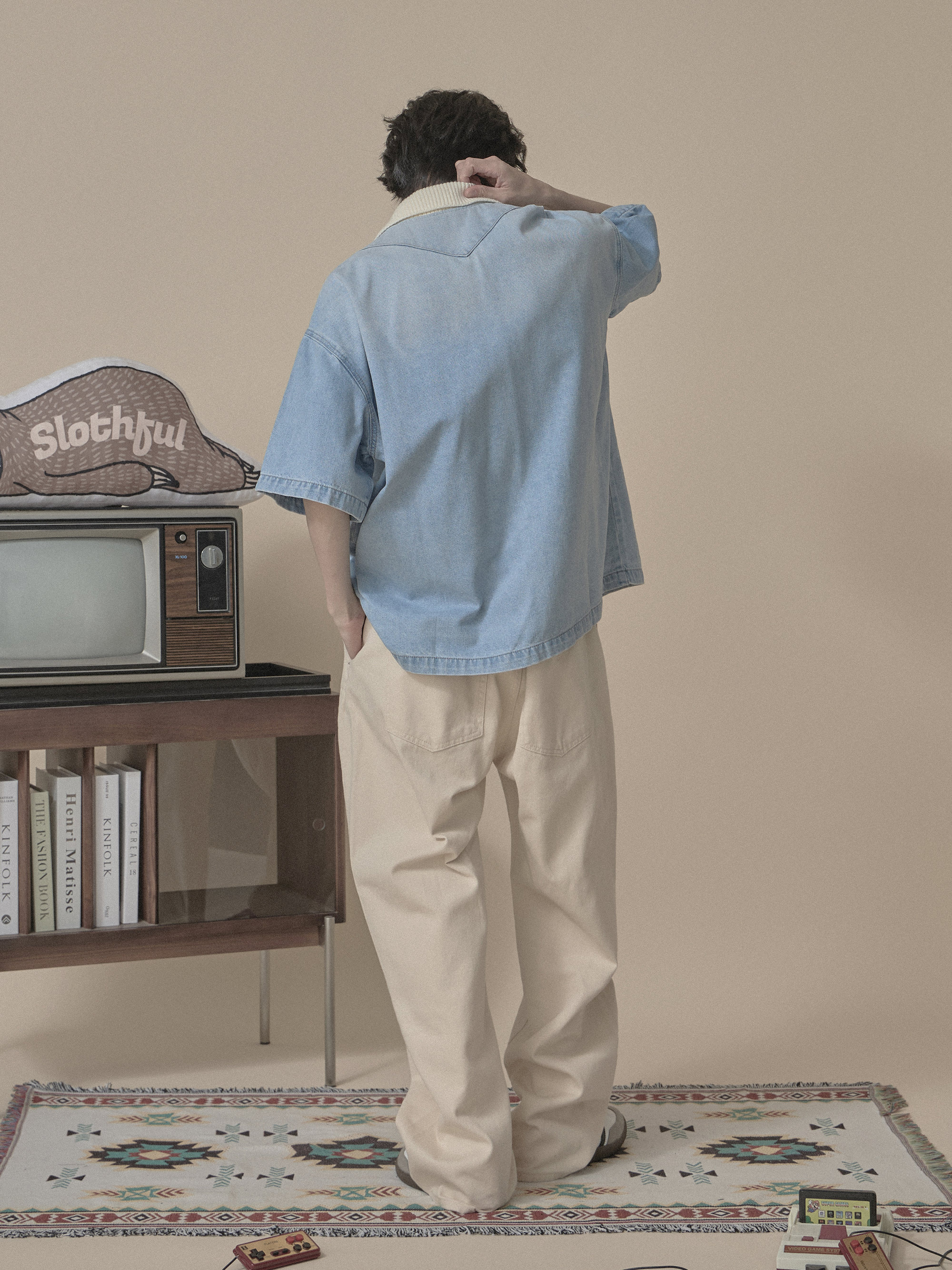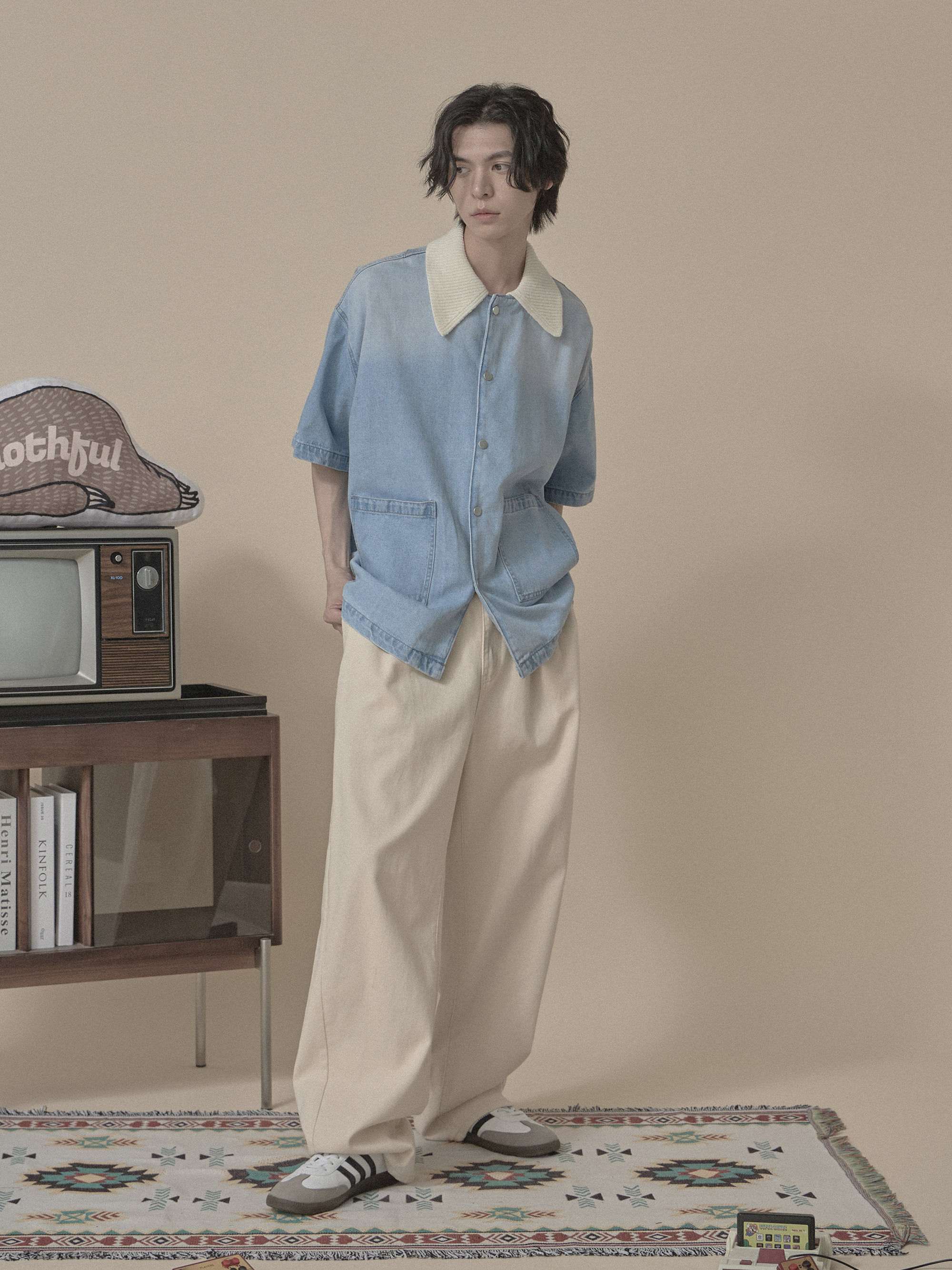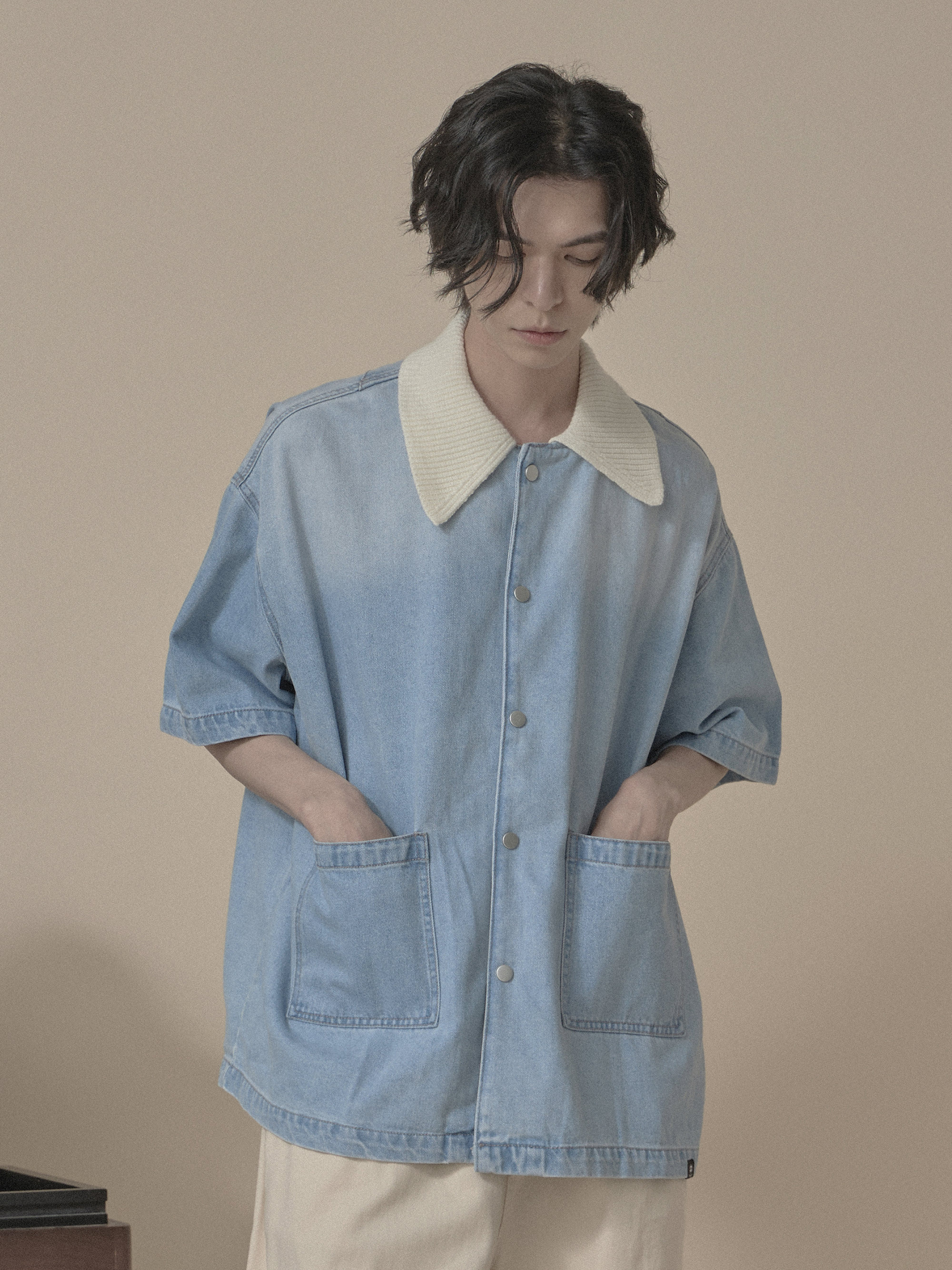 ‧毛料與水洗牛仔的雙面料拼接