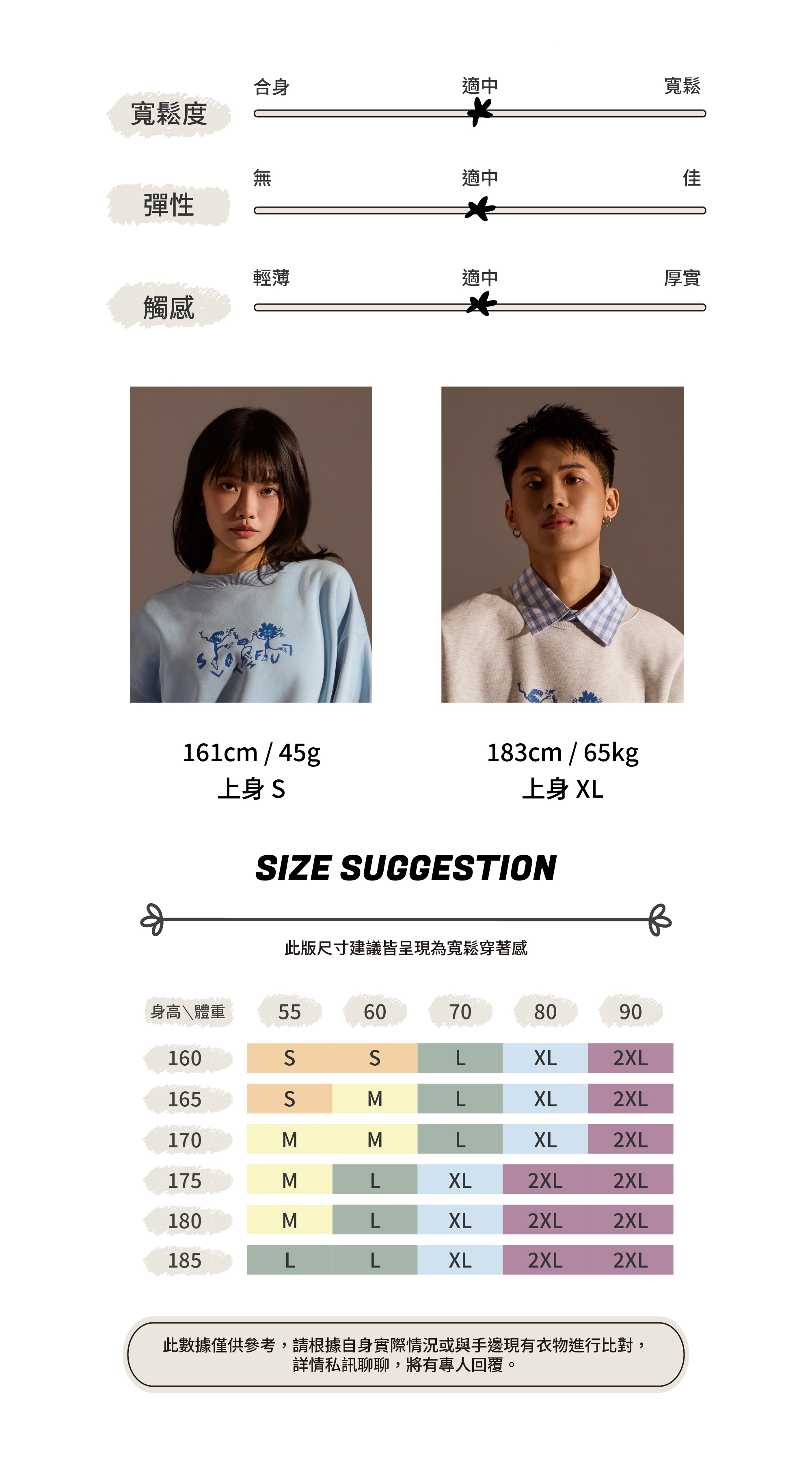 面料選用棉質材質,手感紮實,單穿有型、內搭也能增加層次感;羅紋領口、袖口與下擺結構,則讓整體穿著更穩定耐穿、不易變形。整體定位屬於好搭、耐看、舒適度高,同時帶有角色插畫特色的日常實穿大學T,適合各種休閒與街頭風格穿搭。