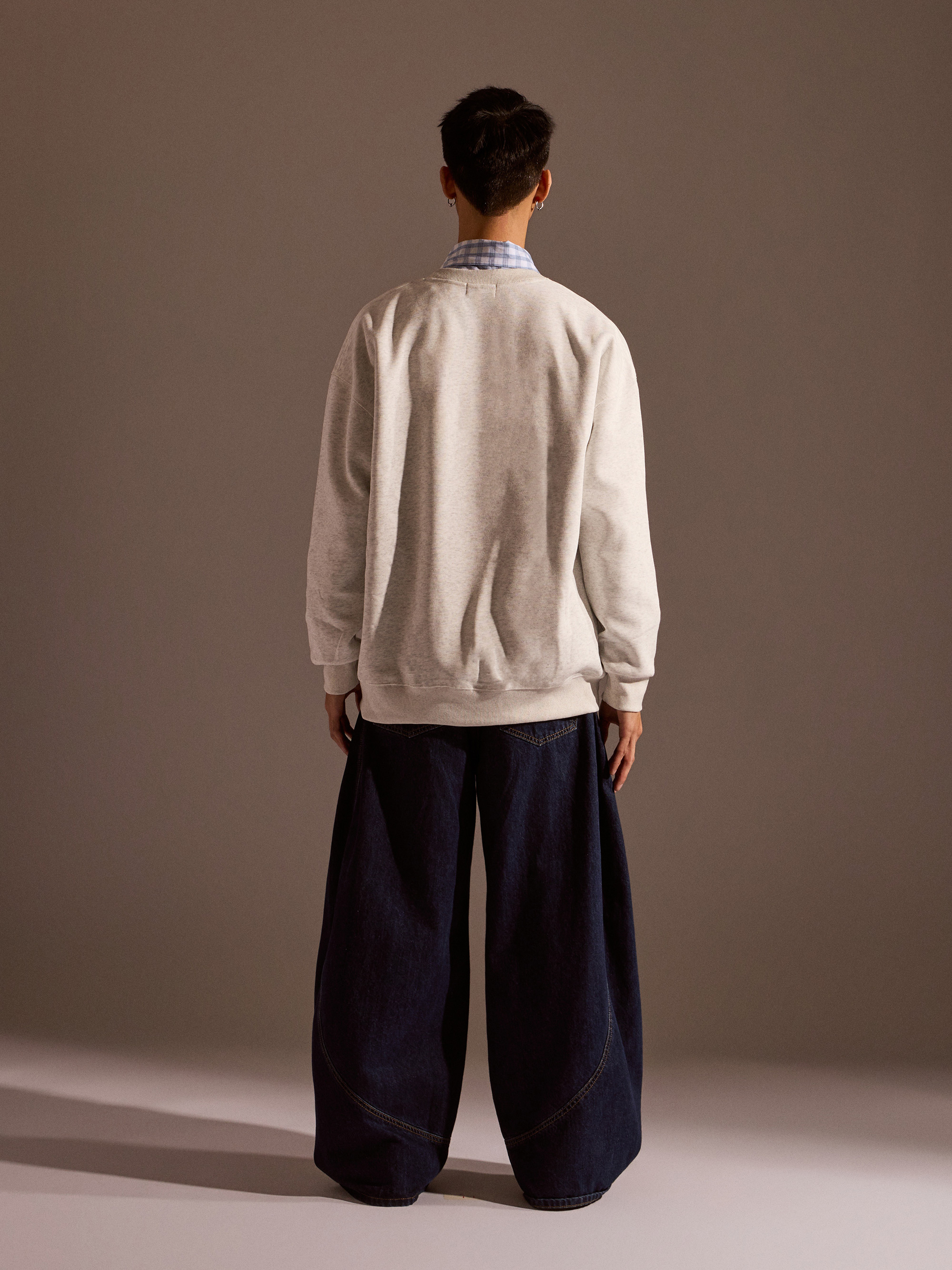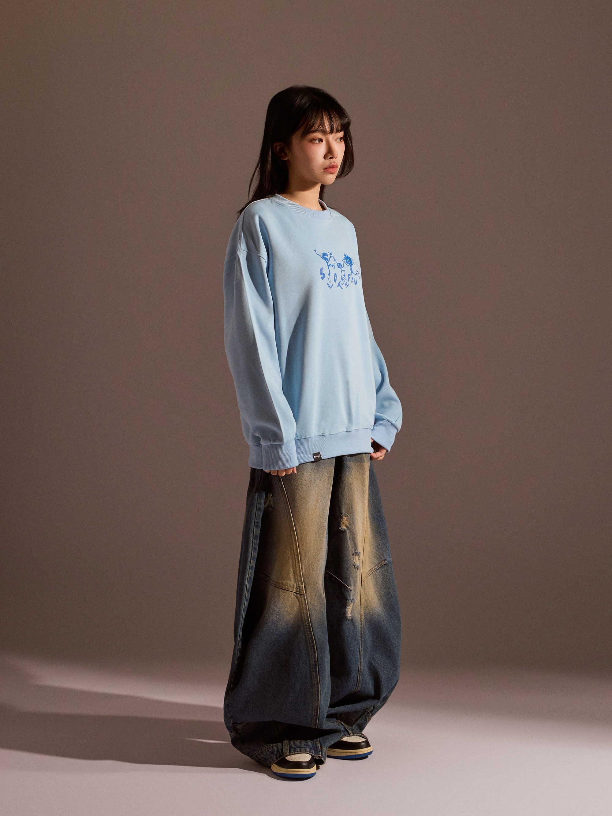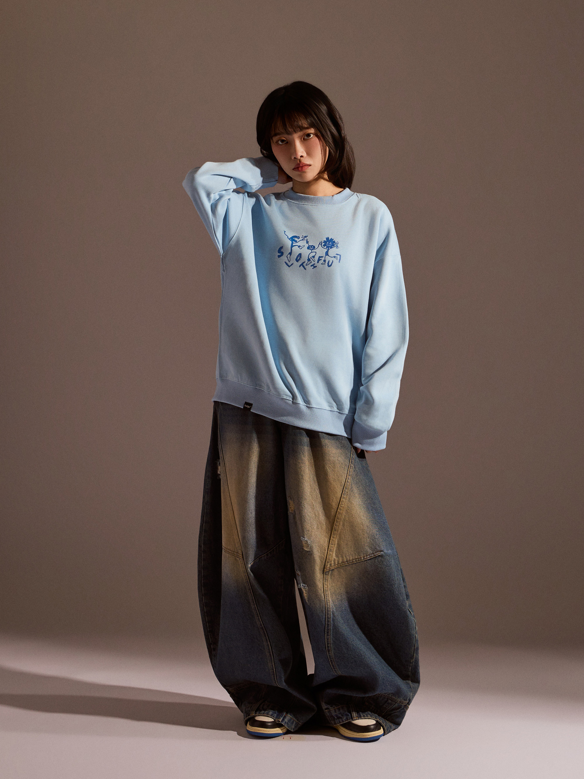 從版型來看,整體採用寬版圓領大學T 輪廓,搭配落肩剪裁,穿起來自然呈現街頭感比例,不論單穿或搭配外套都很好搭。正面印花以塗鴉筆觸呈現花花角色跳舞的畫面,讓整體造型在簡約之中多了一個鮮明又有記憶點的視覺焦點。