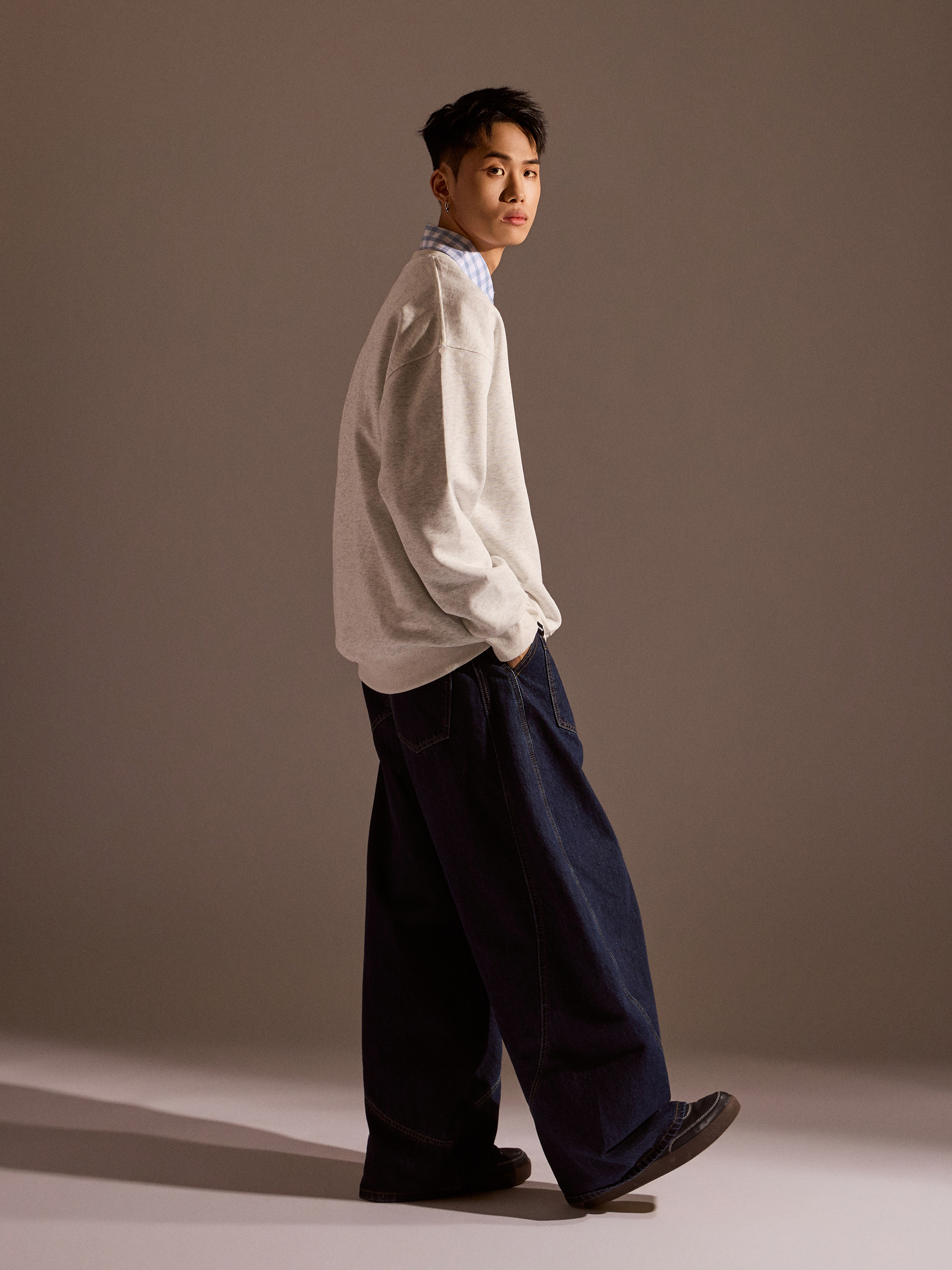 ‧ 寬版圓領大學T輪廓,落肩剪裁打造街頭感穿搭比例