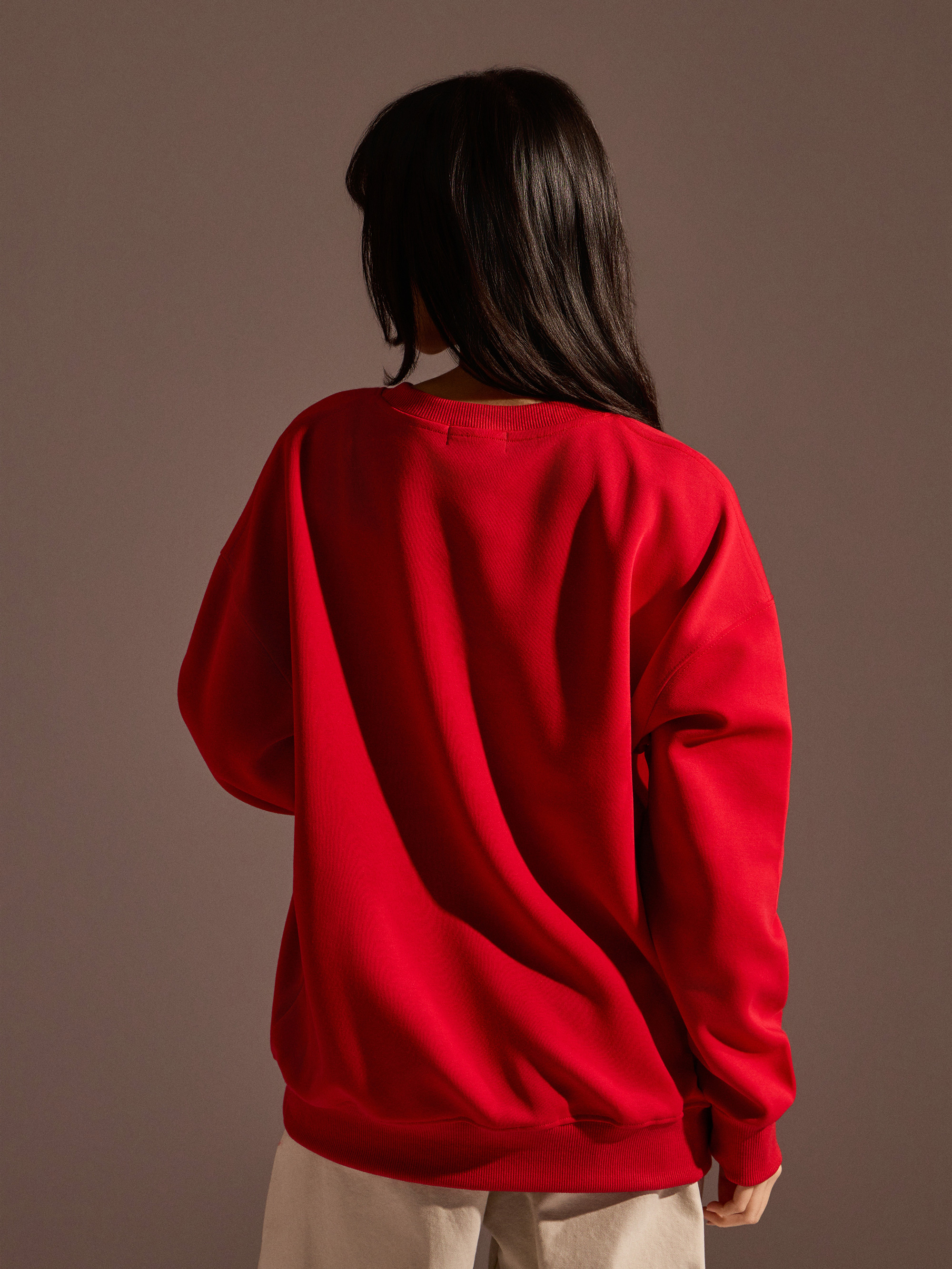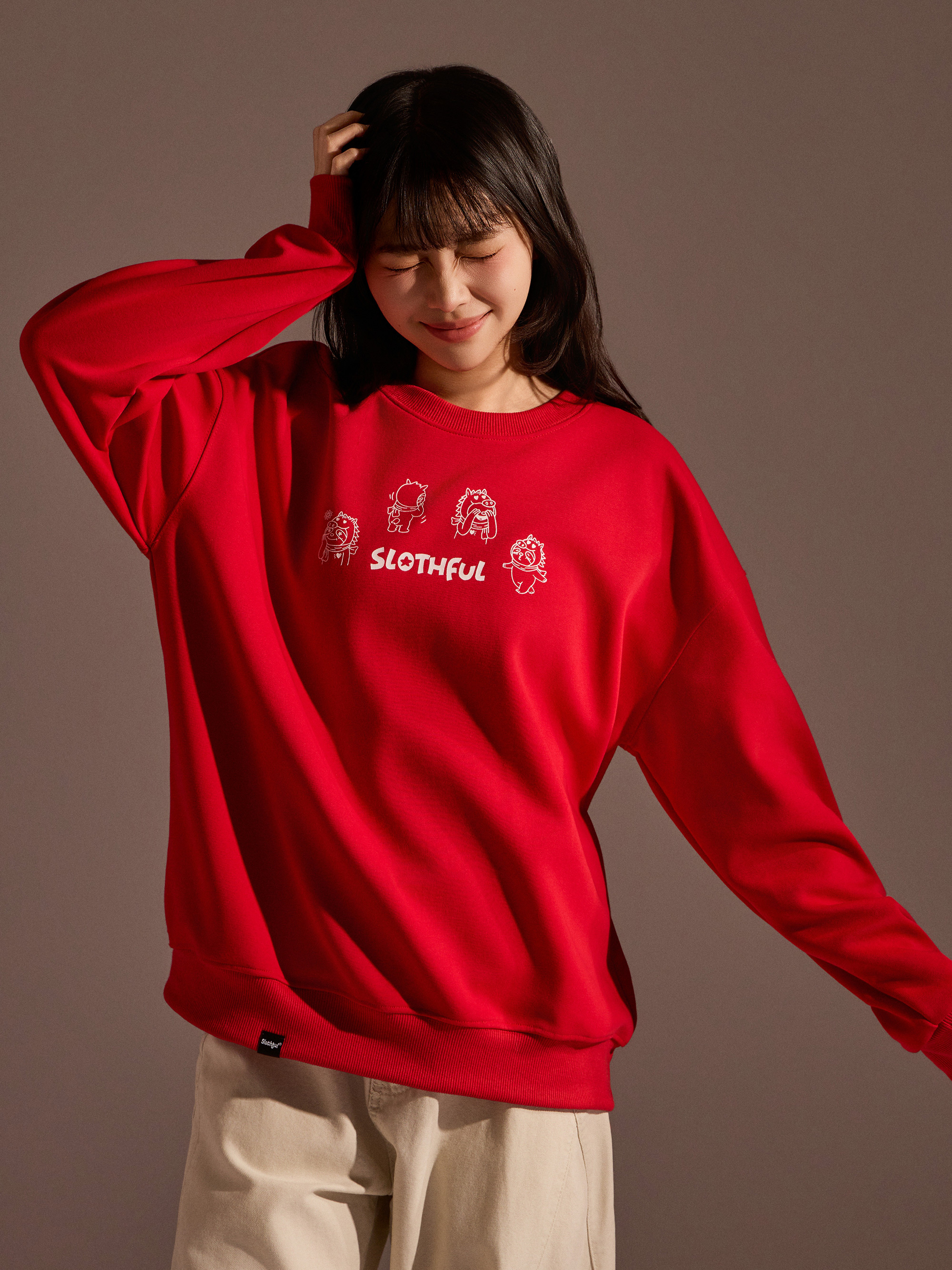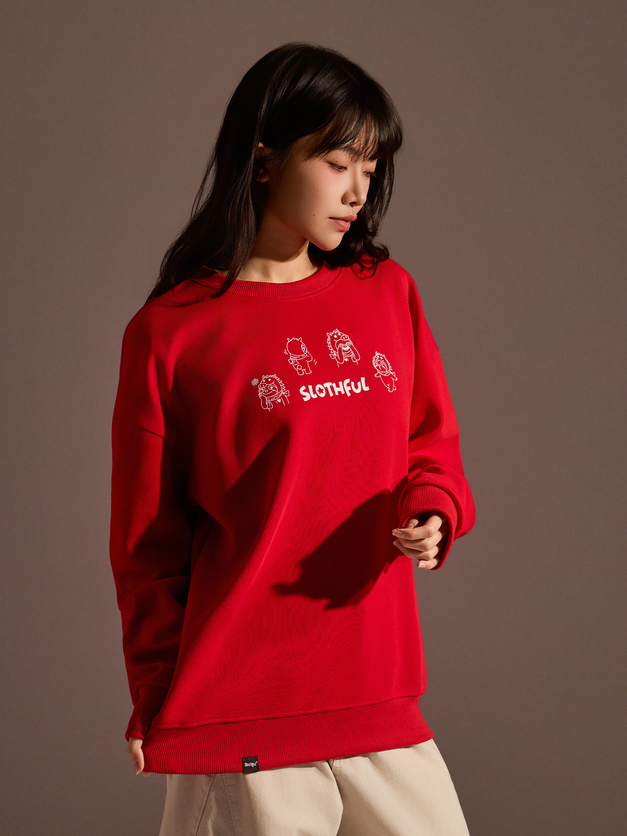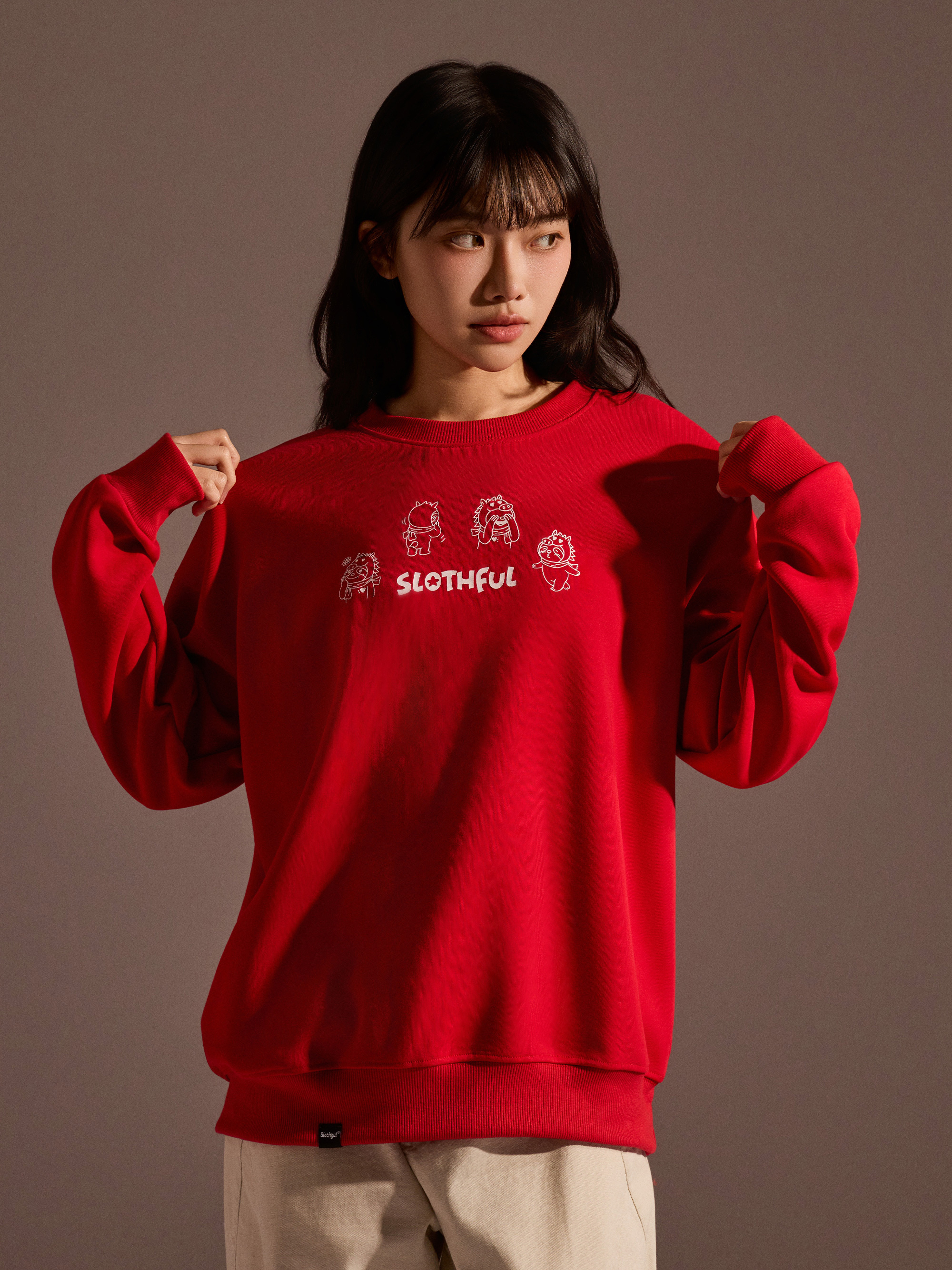 從圖片可見,整體以紅色作為主色調,搭配主題印花,視覺上相當醒目,也符合年節喜氣氛圍。圓領剪裁搭配大學T版型,讓整體穿著感受維持輕鬆與舒適,不會過於厚重,卻依然具備保暖效果。