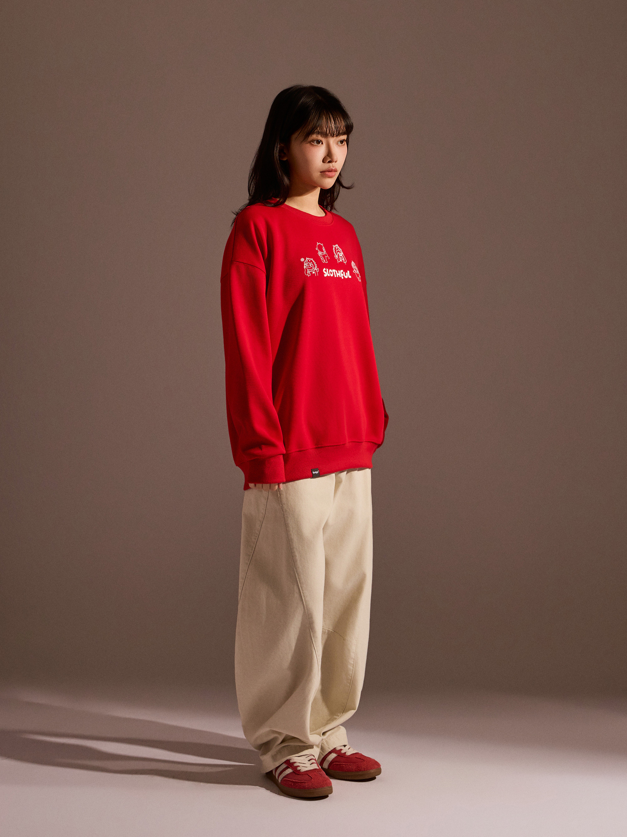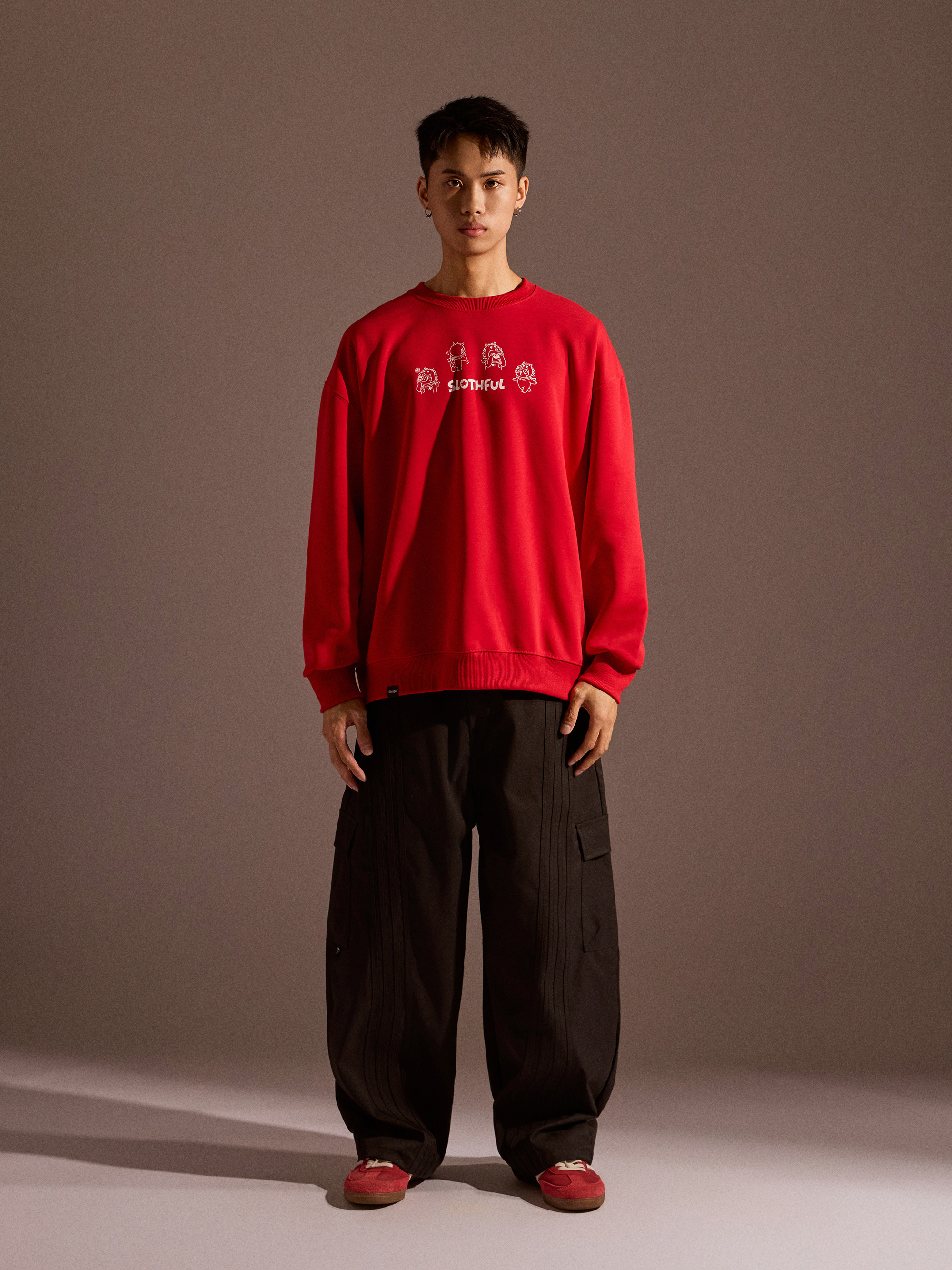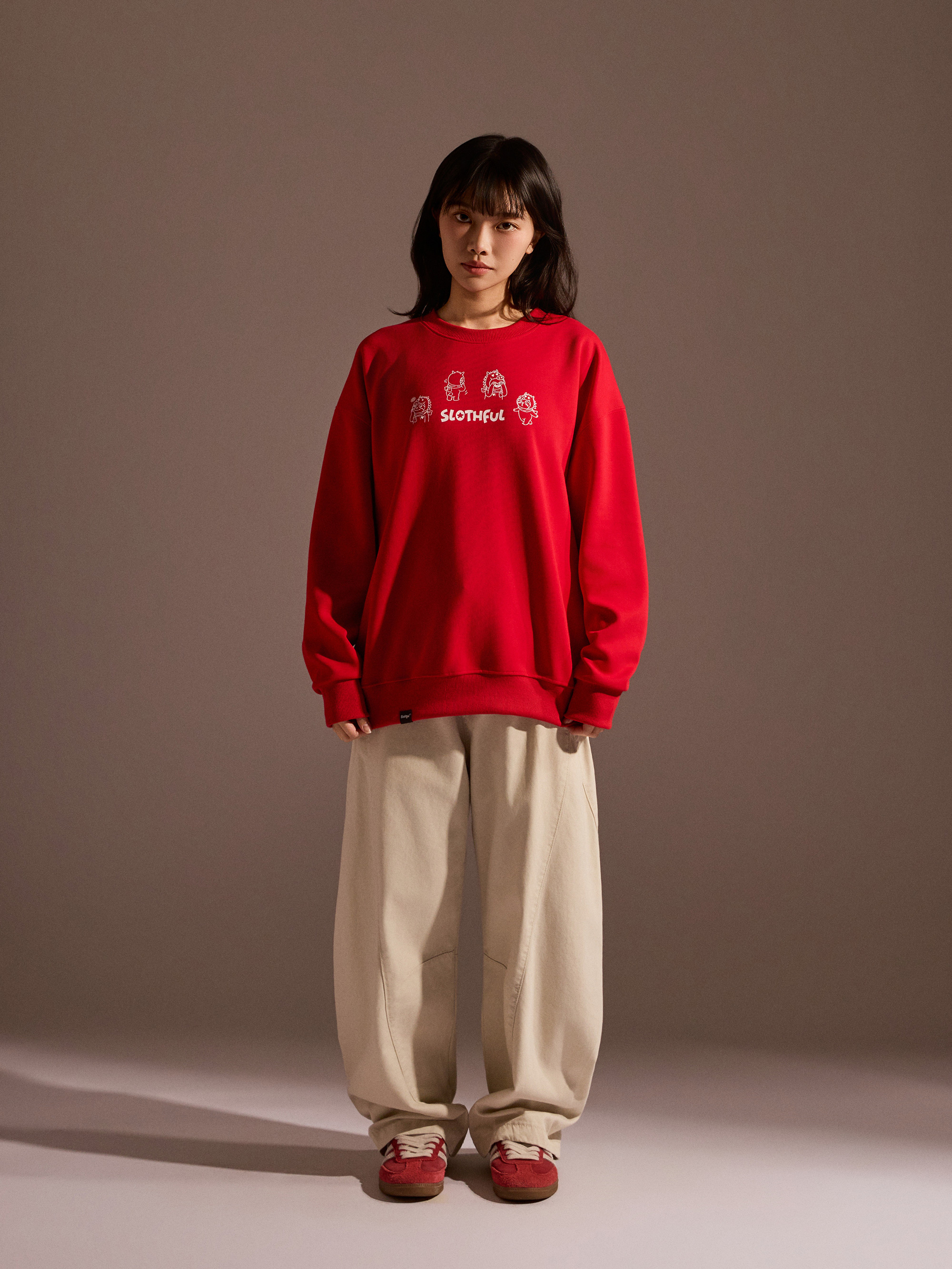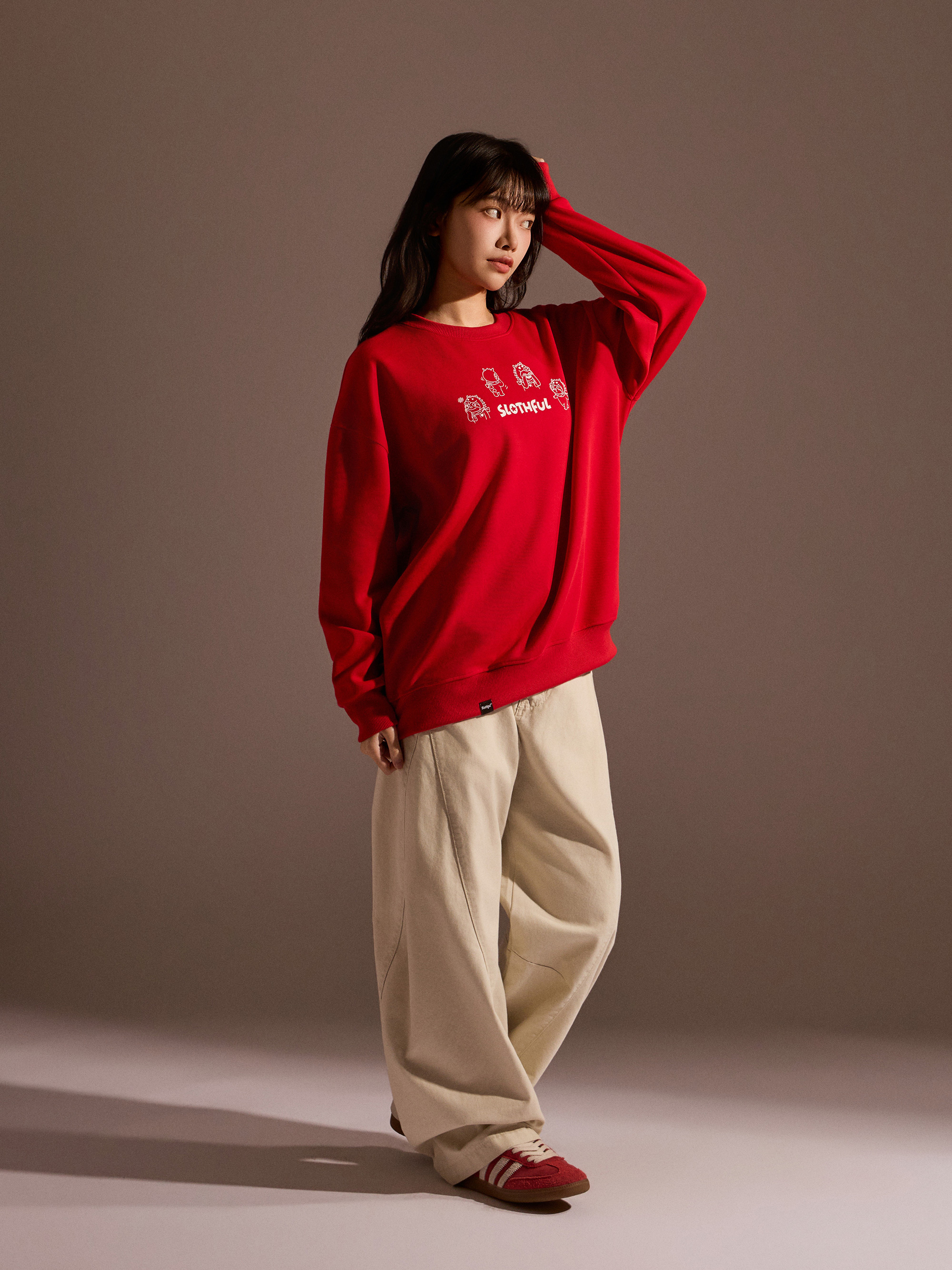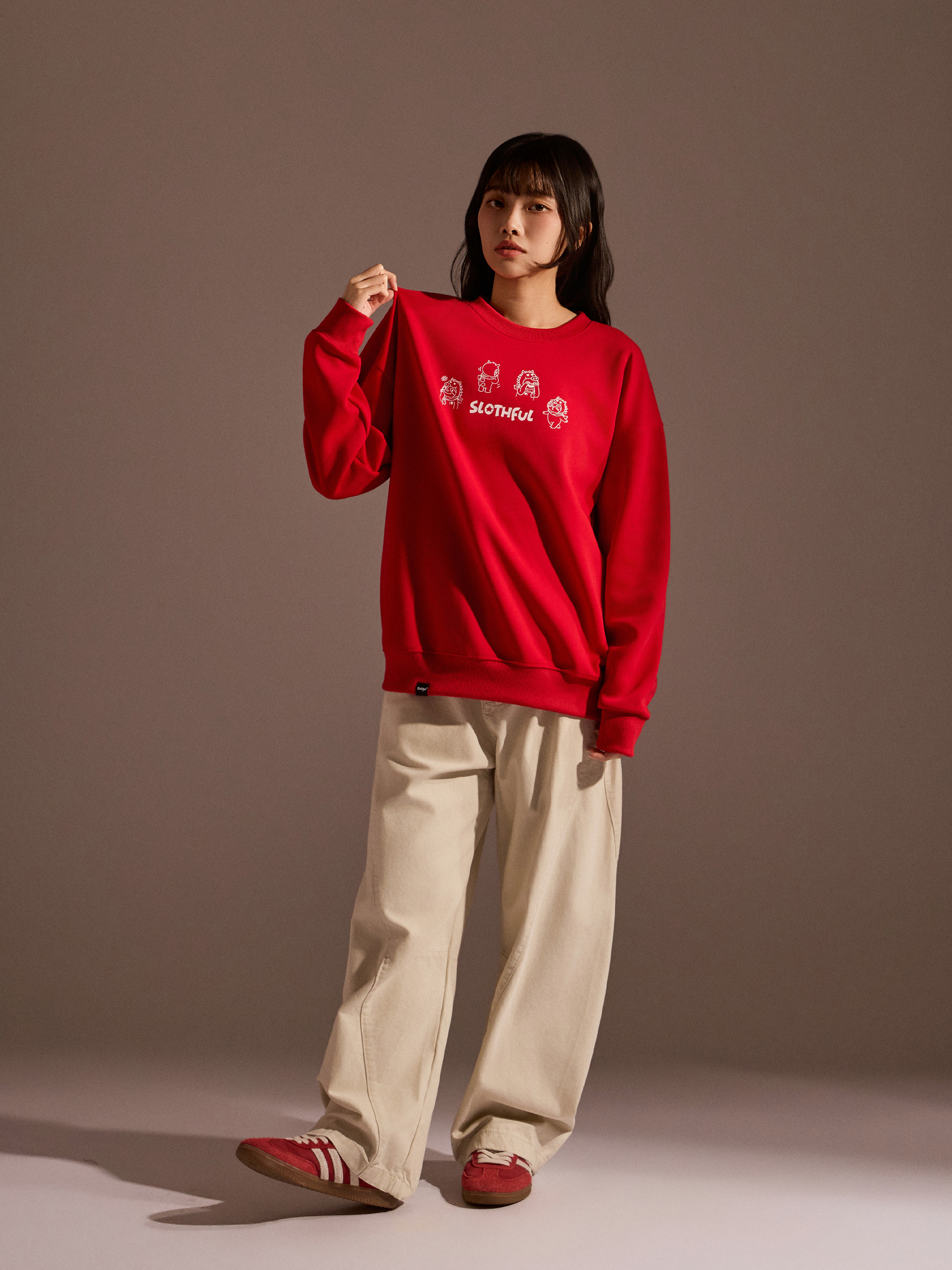 從圖片可見,整體以紅色作為主色調,搭配主題印花,視覺上相當醒目,也符合年節喜氣氛圍。圓領剪裁搭配大學T版型,讓整體穿著感受維持輕鬆與舒適,不會過於厚重,卻依然具備保暖效果。