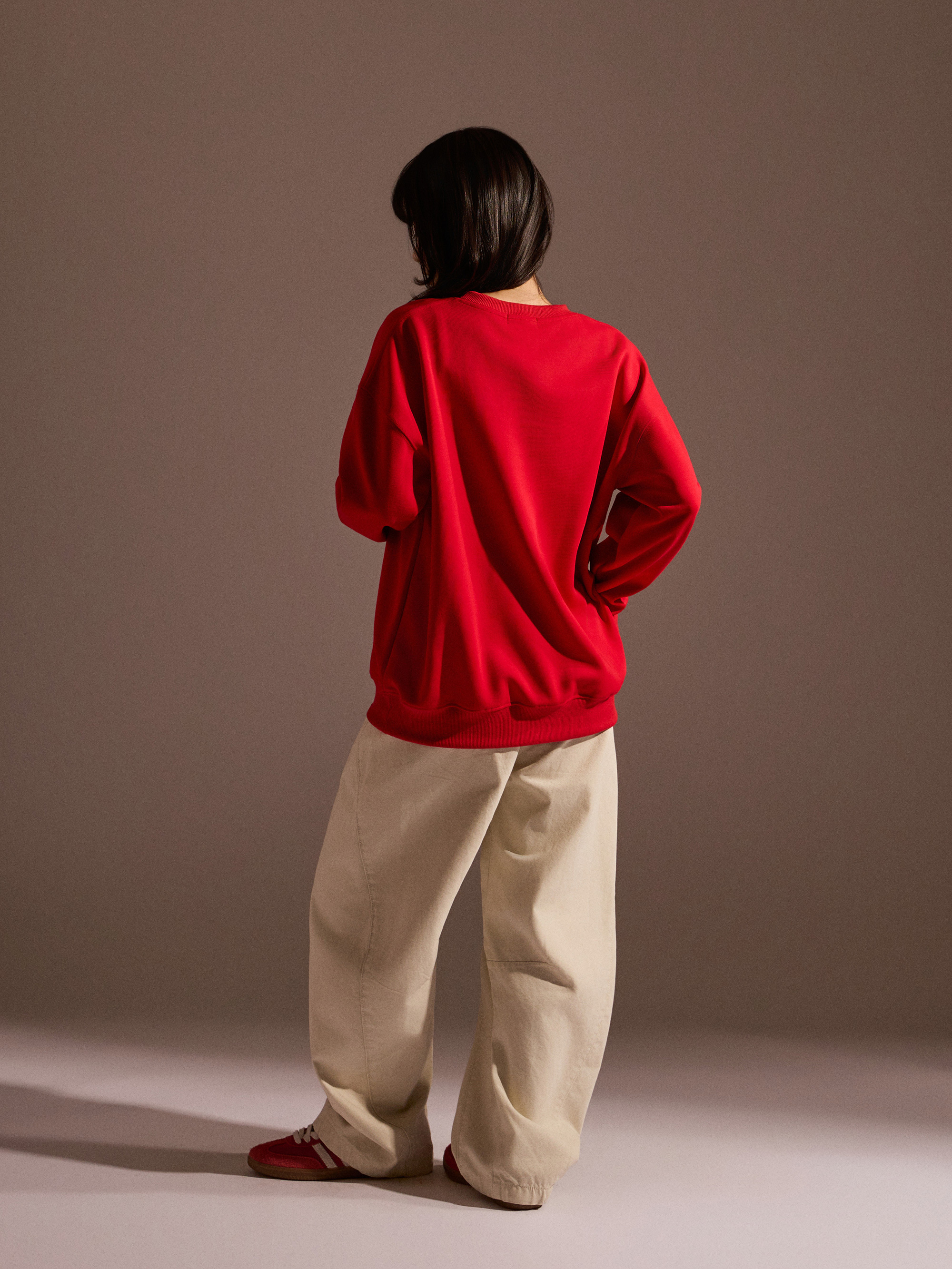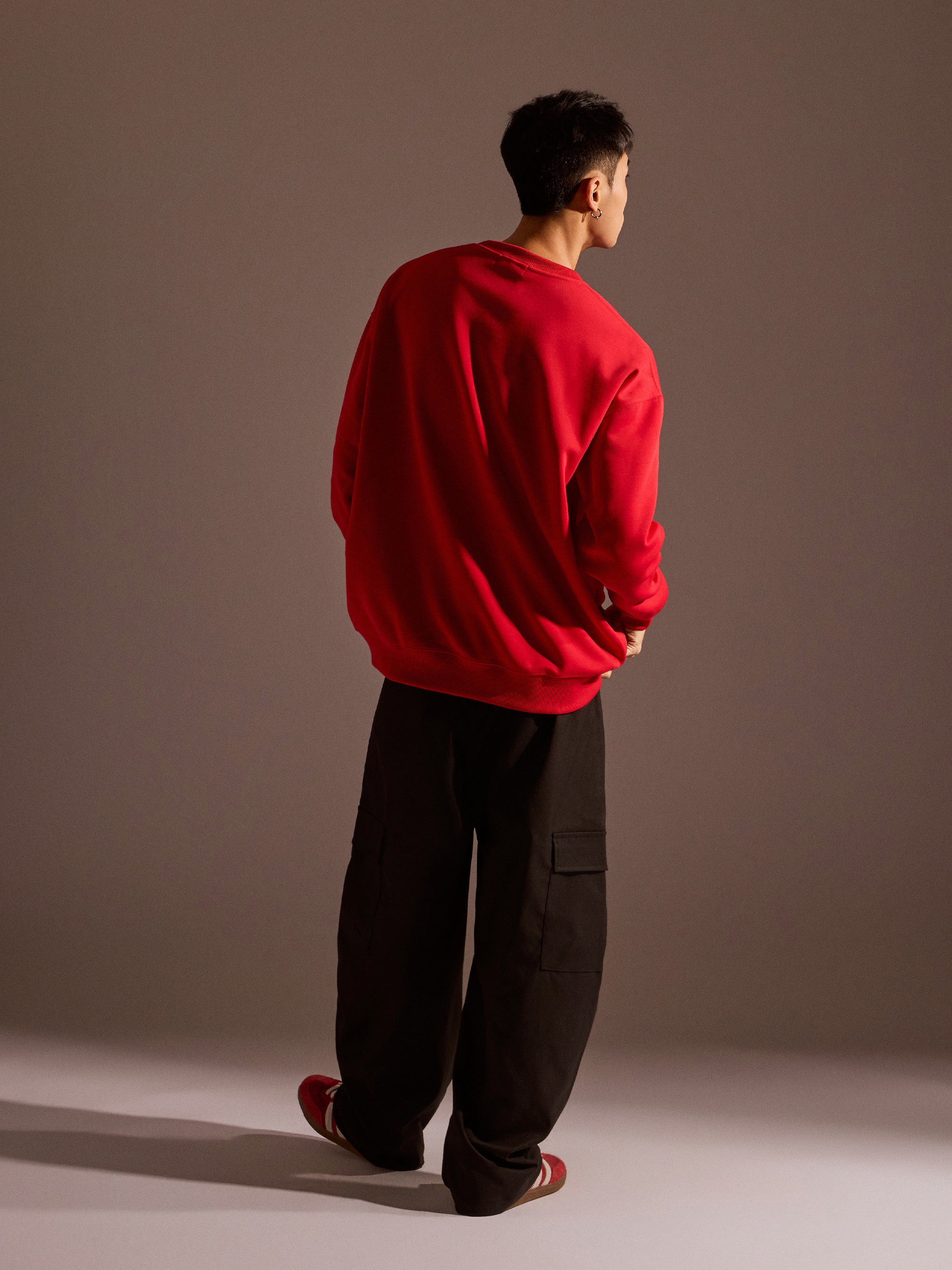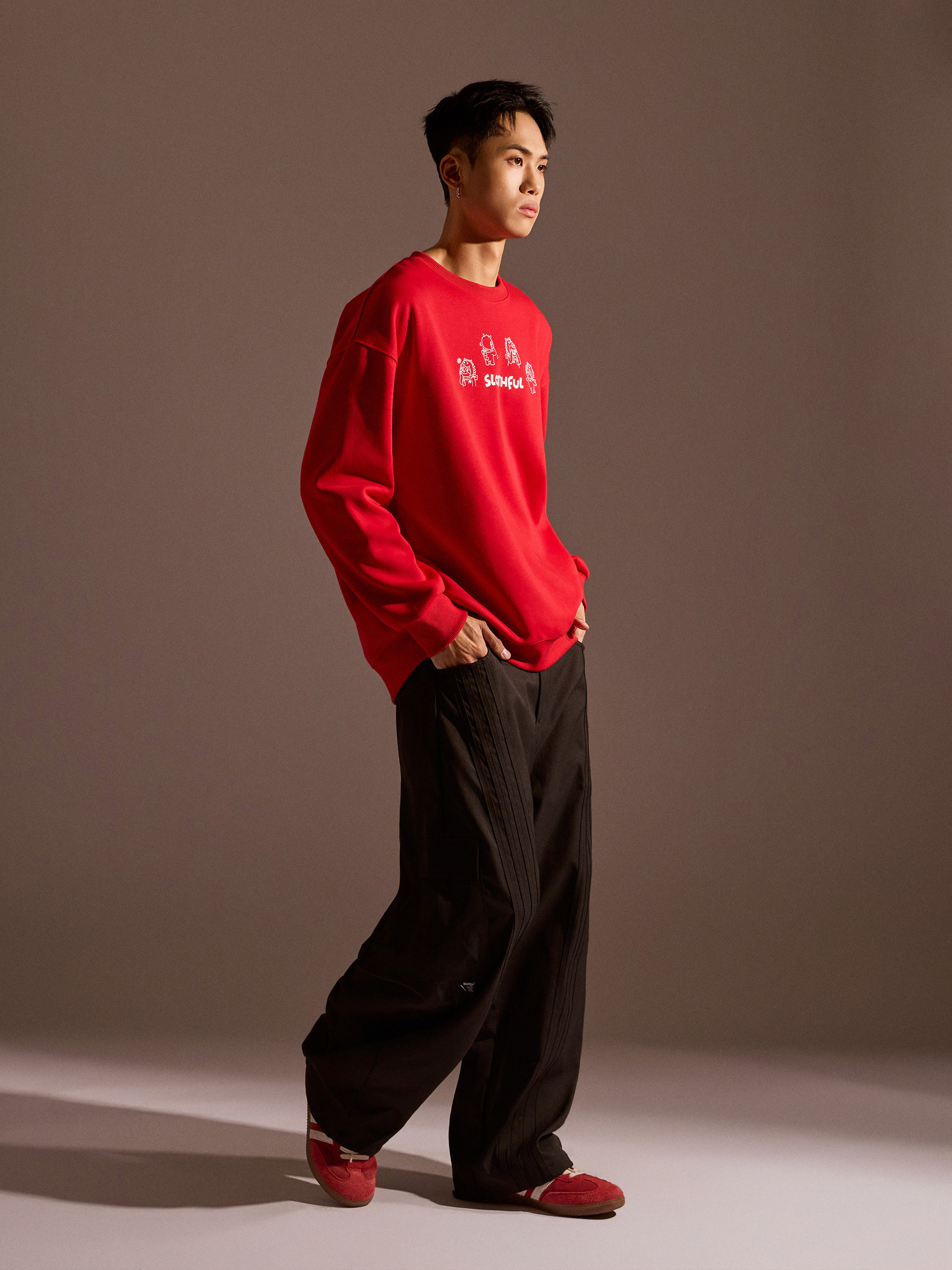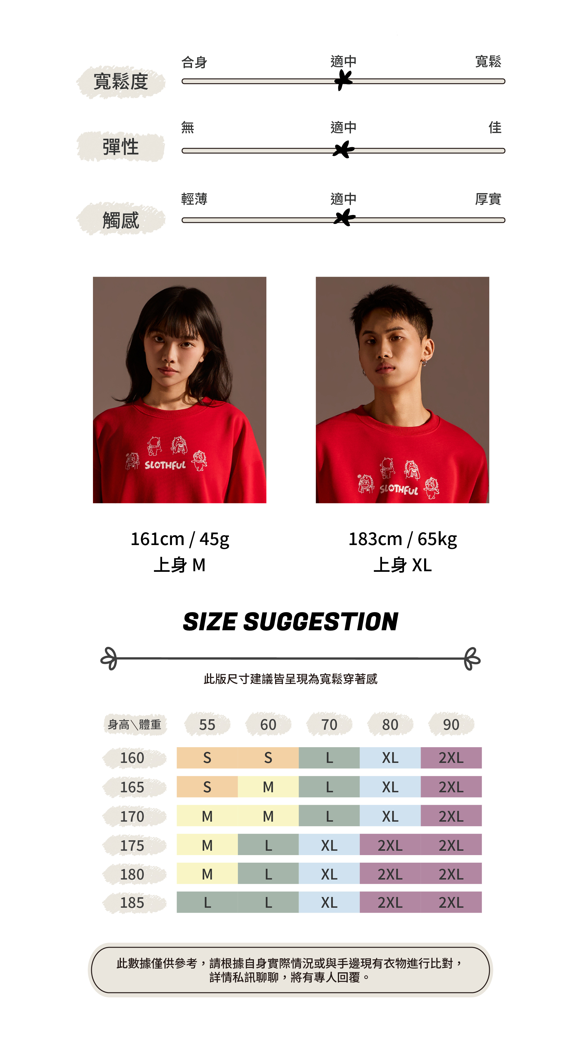 從圖片可見,整體以紅色作為主色調,搭配主題印花,視覺上相當醒目,也符合年節喜氣氛圍。圓領剪裁搭配大學T版型,讓整體穿著感受維持輕鬆與舒適,不會過於厚重,卻依然具備保暖效果。