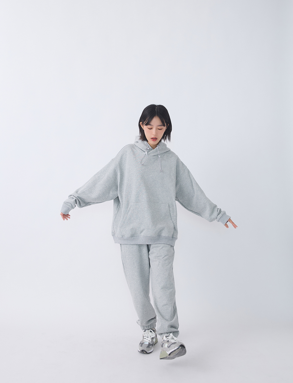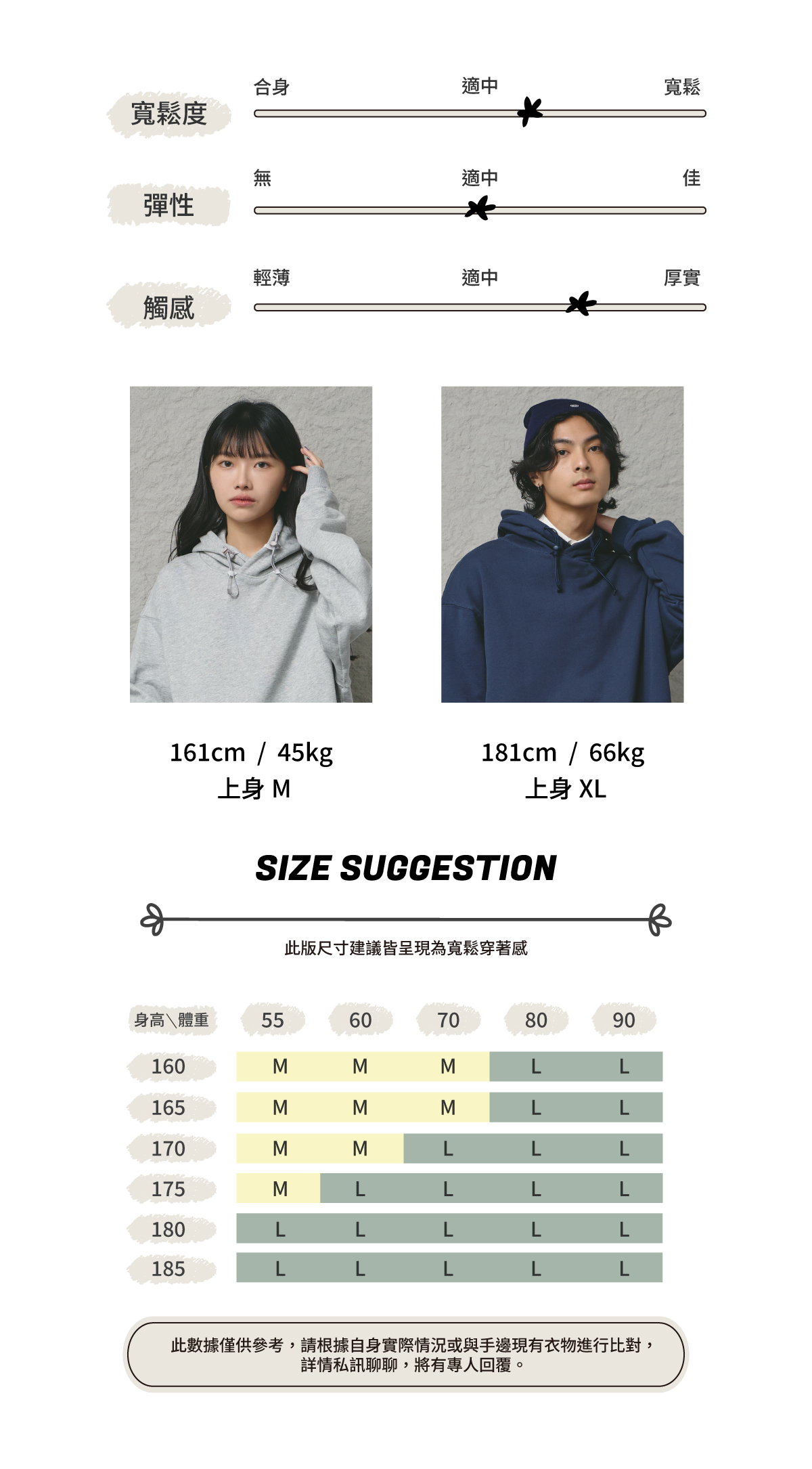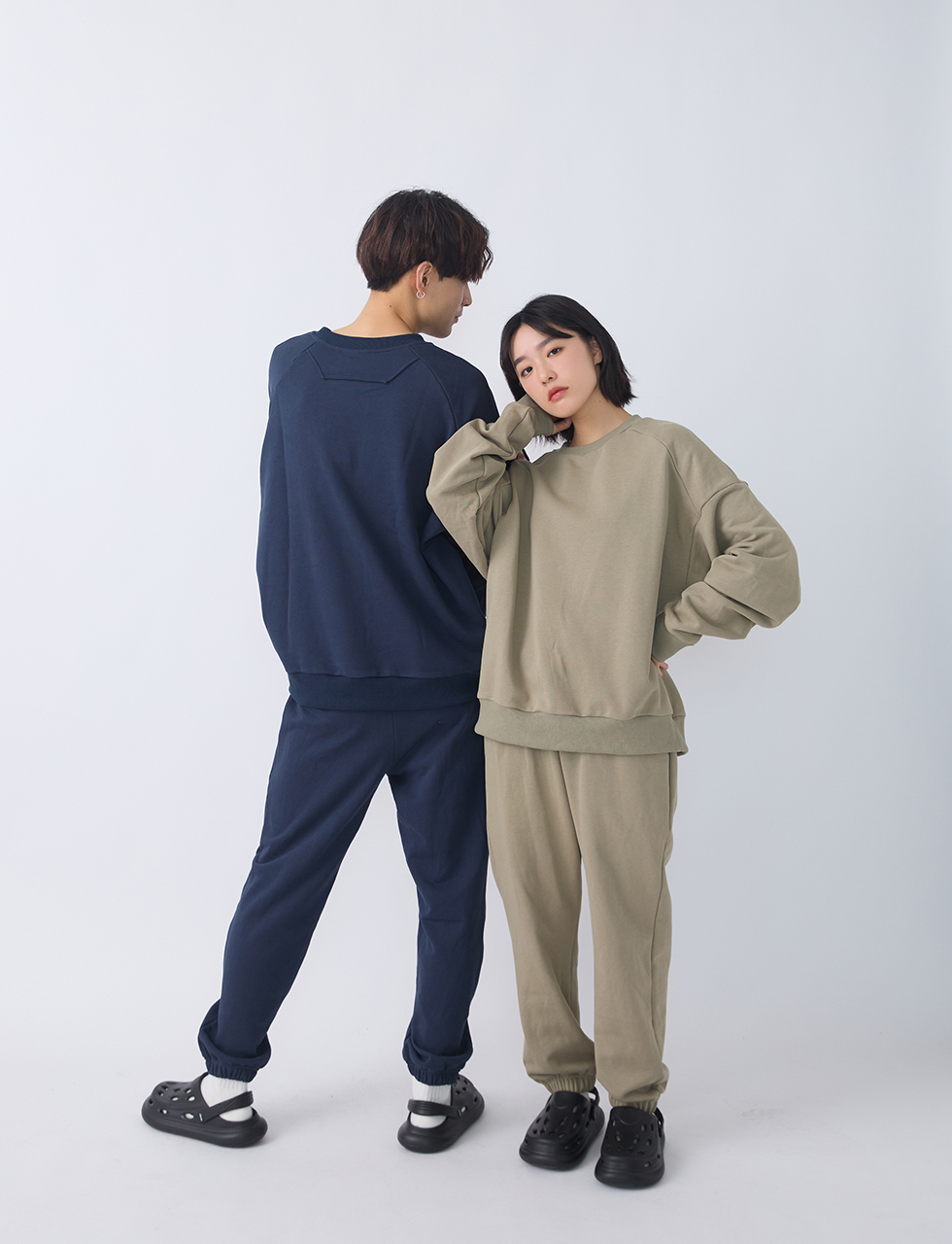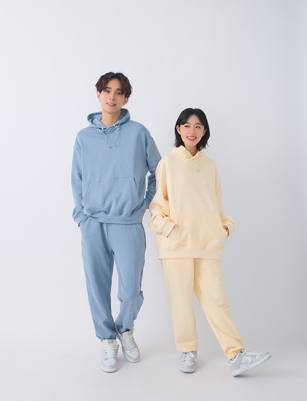 整體採用 100% 純棉毛圈底面設計,觸感親膚透氣,穿著時不悶不厚重,卻保有良好的挺度與垂墜感。上身提供帽T與圓領大學T 兩種選擇,可依穿搭需求與季節自由搭配,下身則為鬆緊抽繩棉褲,穿著舒適、活動自在。