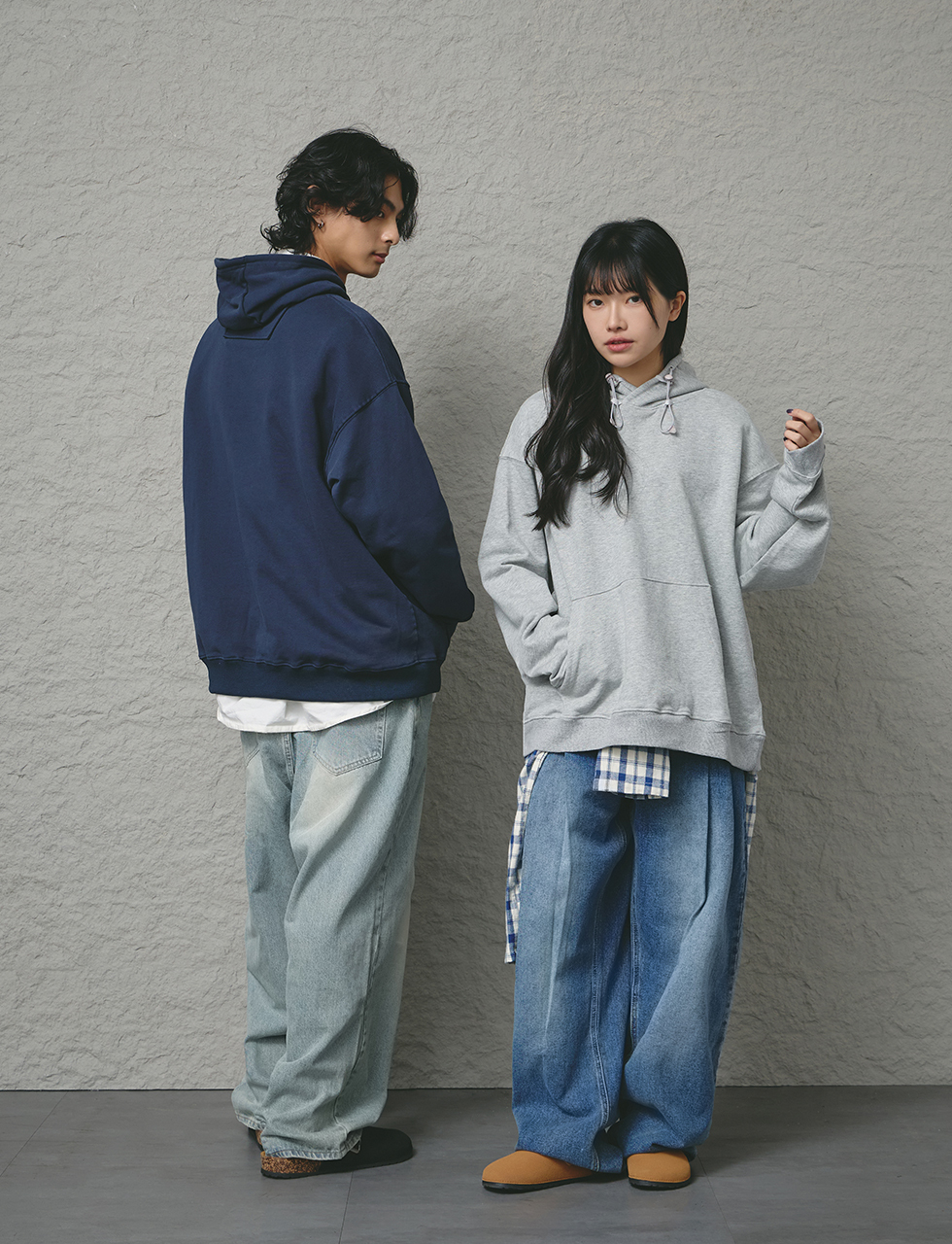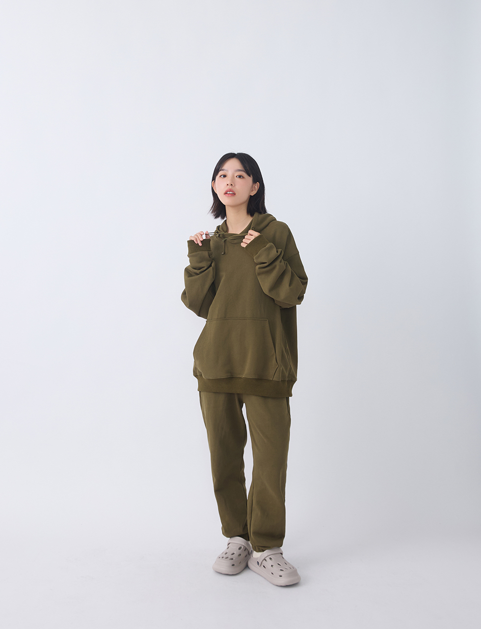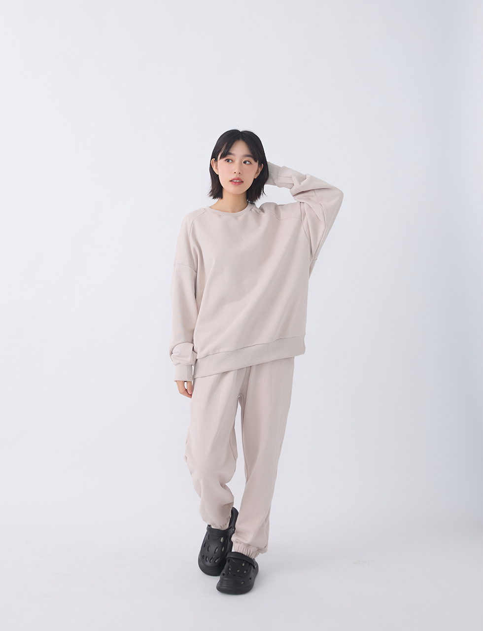 整體採用 100% 純棉毛圈底面設計,觸感親膚透氣,穿著時不悶不厚重,卻保有良好的挺度與垂墜感。上身提供帽T與圓領大學T 兩種選擇,可依穿搭需求與季節自由搭配,下身則為鬆緊抽繩棉褲,穿著舒適、活動自在。