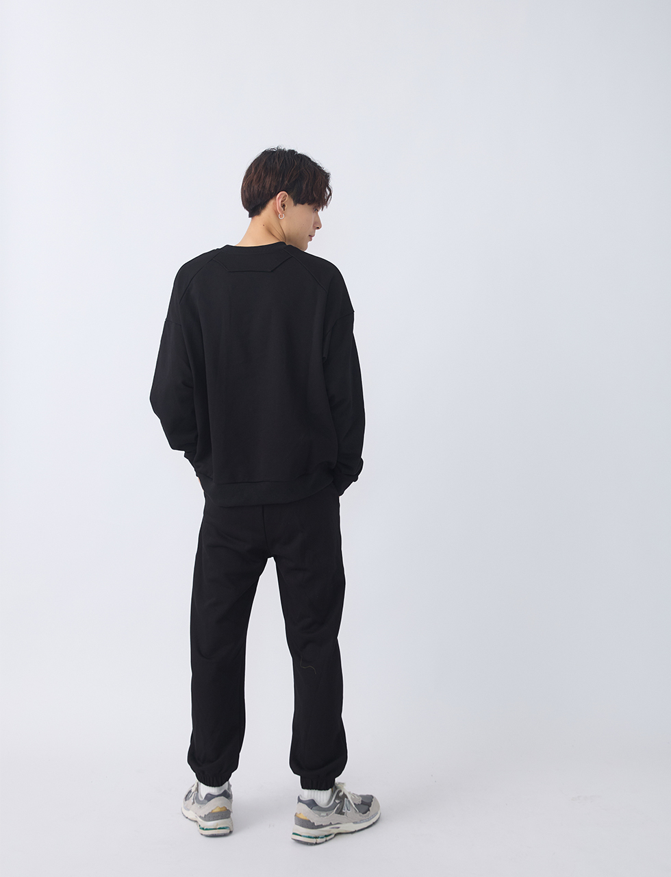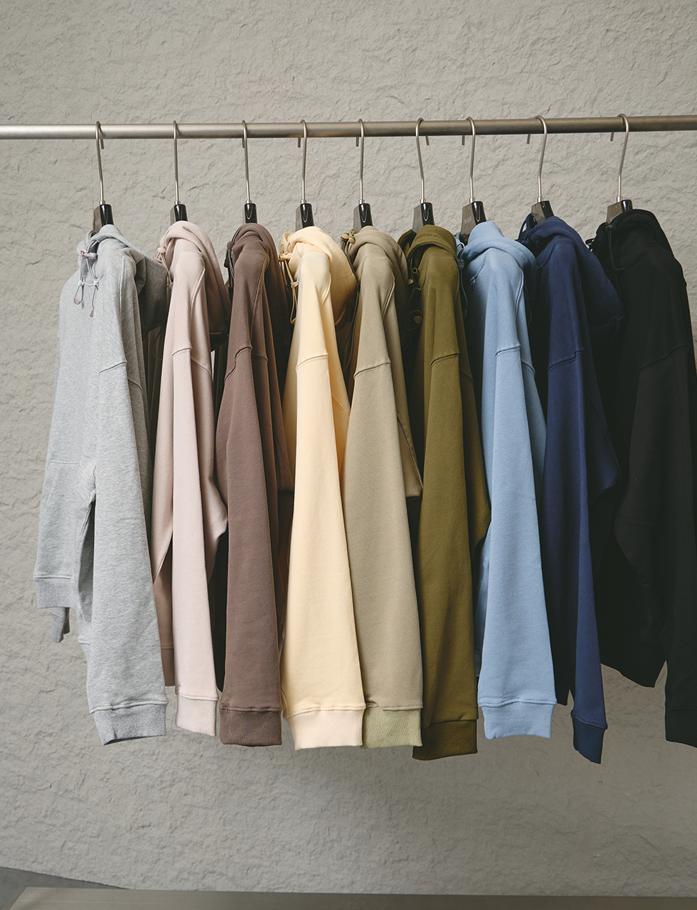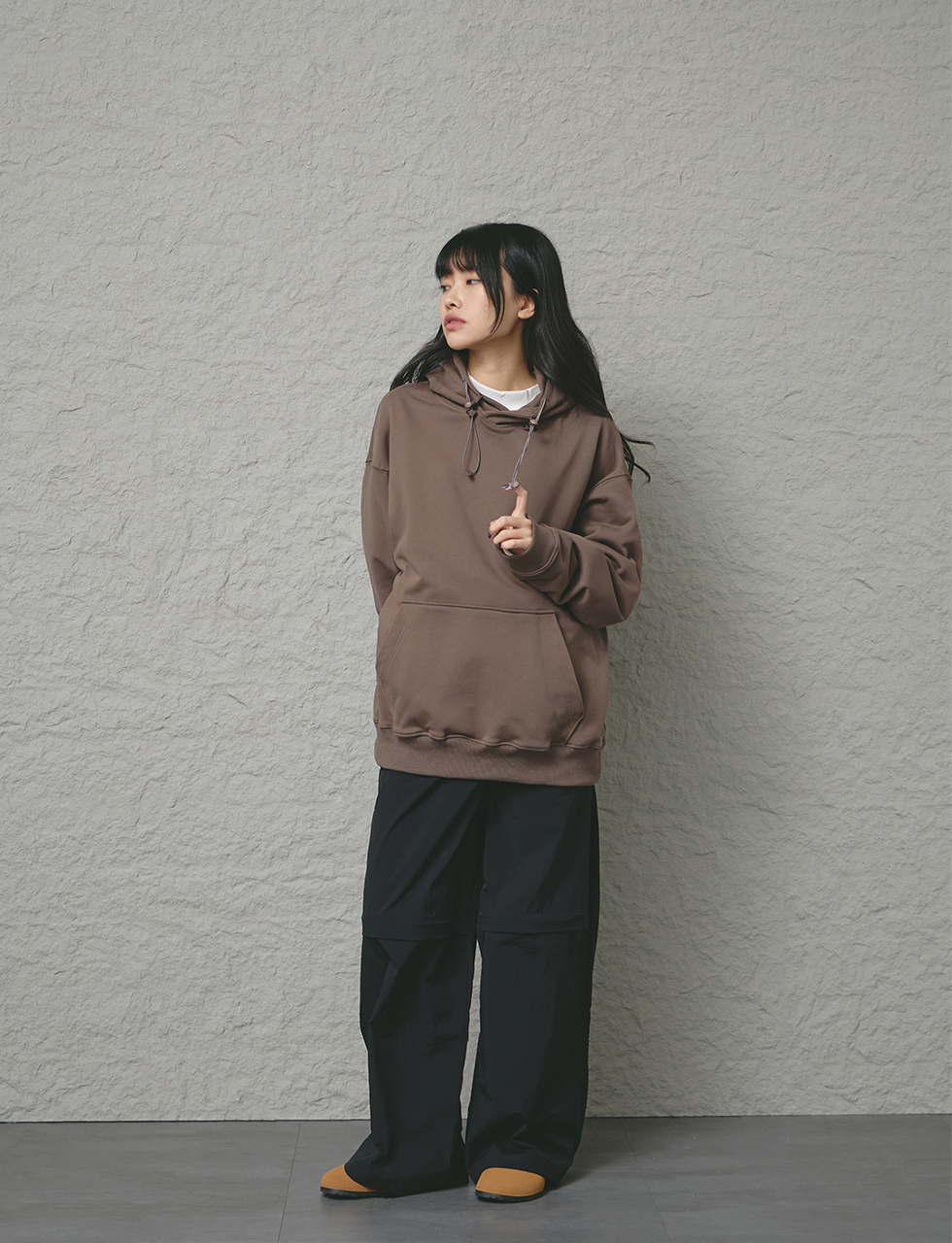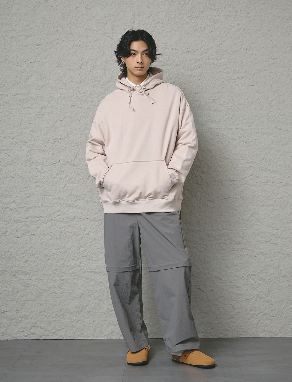 整體採用 100% 純棉毛圈底面設計,觸感親膚透氣,穿著時不悶不厚重,卻保有良好的挺度與垂墜感。上身提供帽T與圓領大學T 兩種選擇,可依穿搭需求與季節自由搭配,下身則為鬆緊抽繩棉褲,穿著舒適、活動自在。