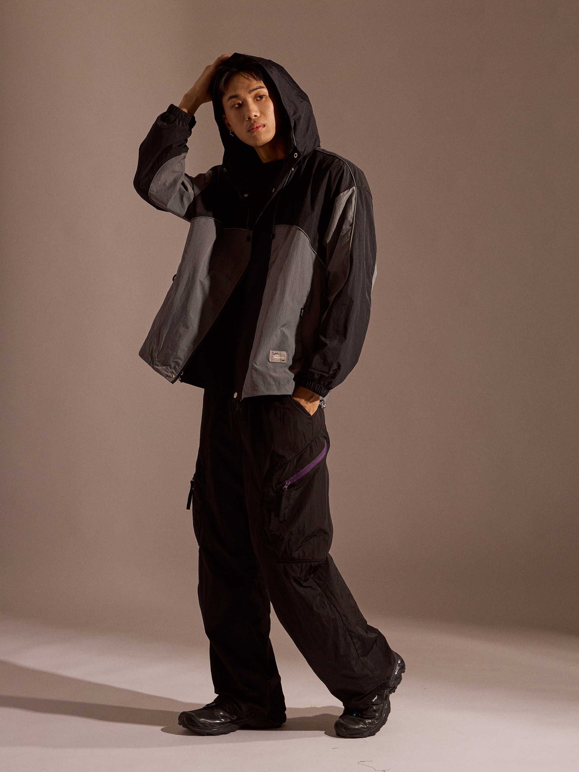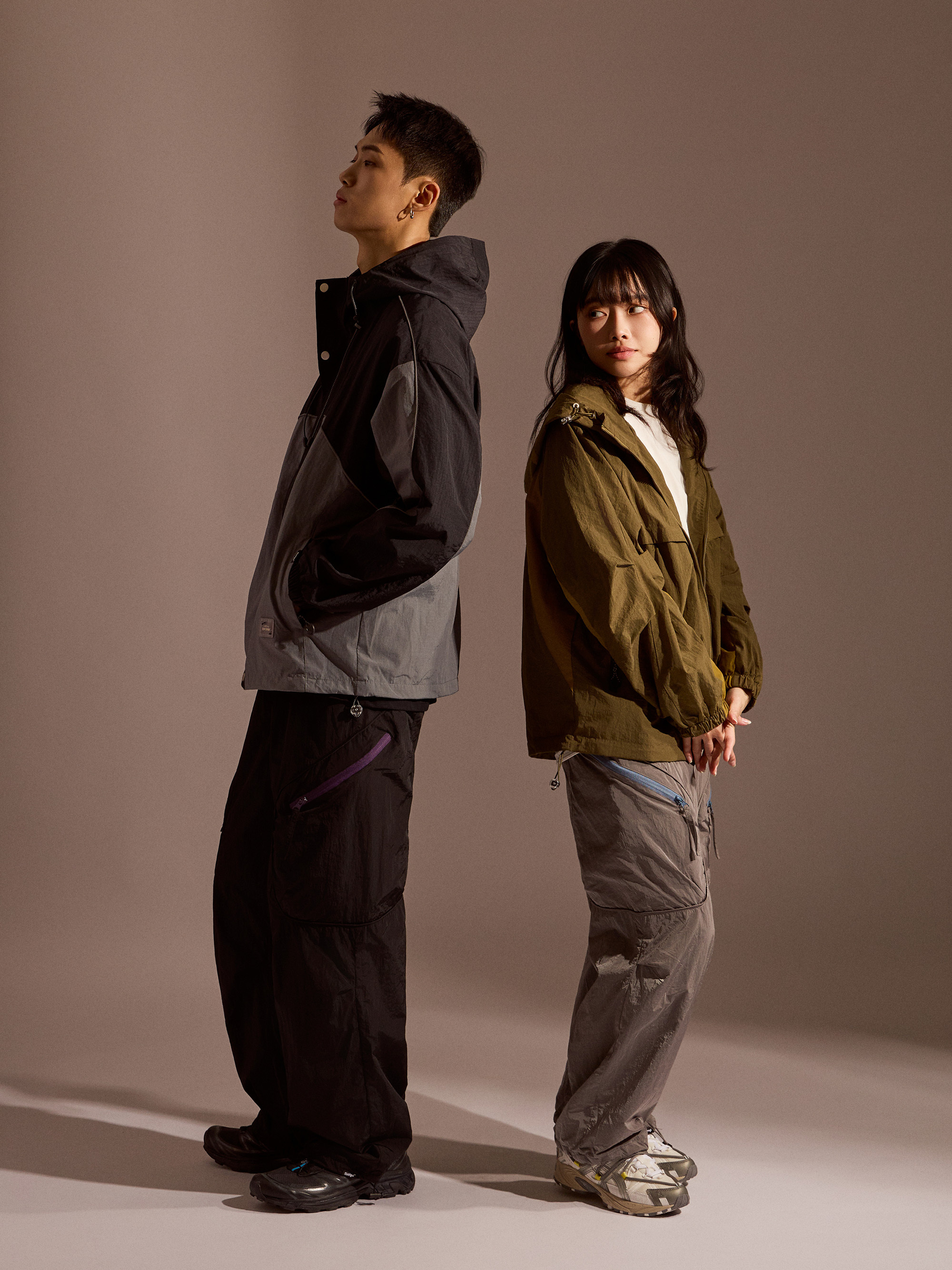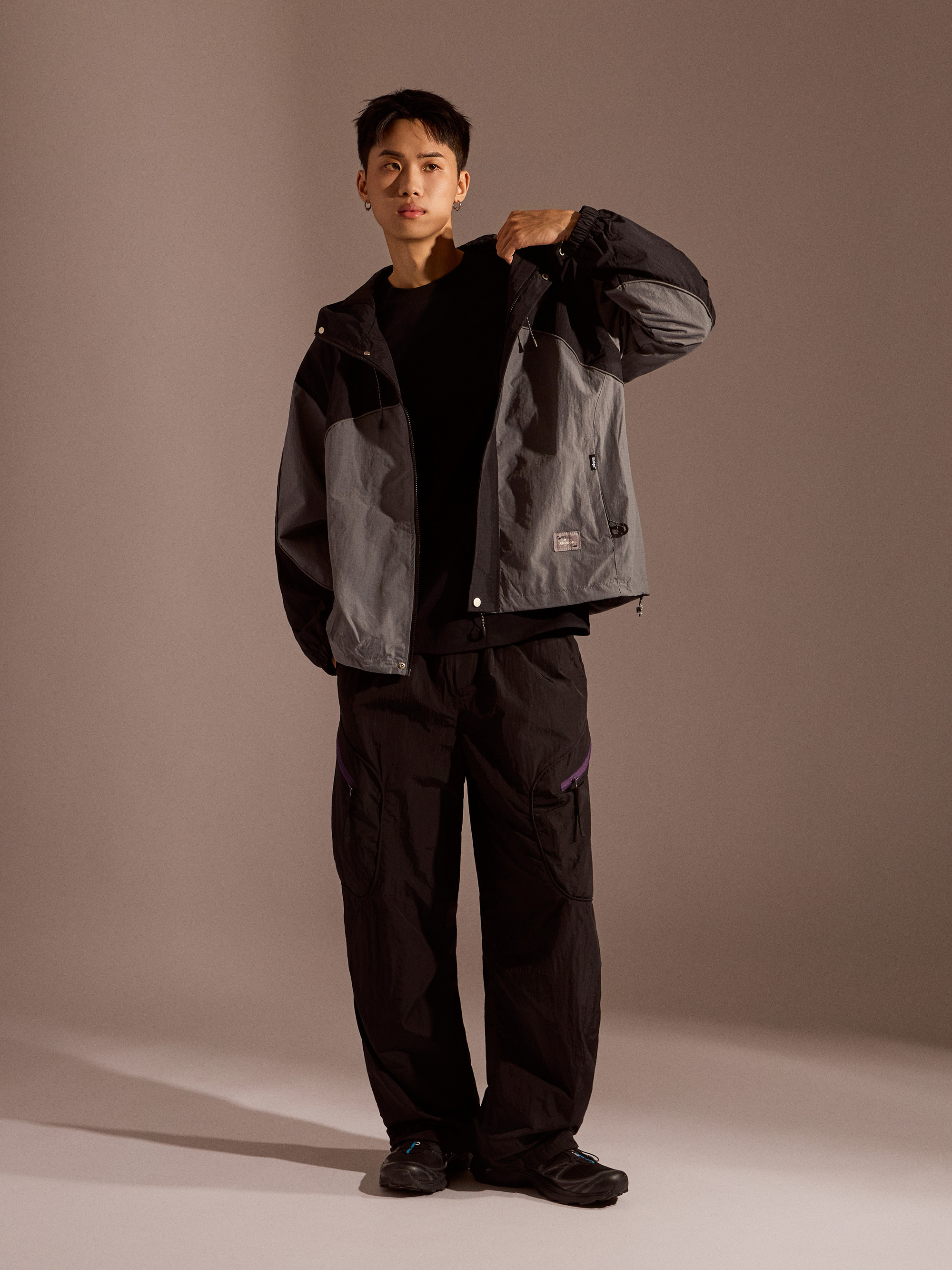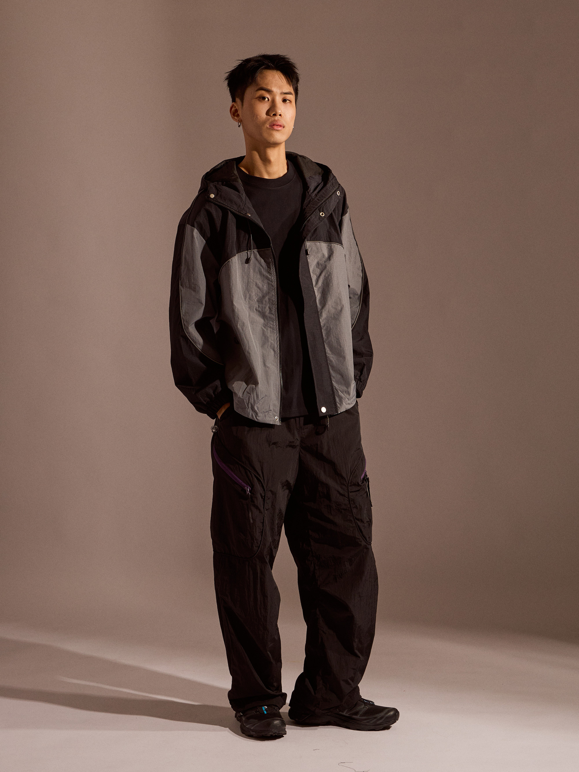 ‧金屬尼龍光感布料:表面微光澤,呈現科技感與街頭氛圍