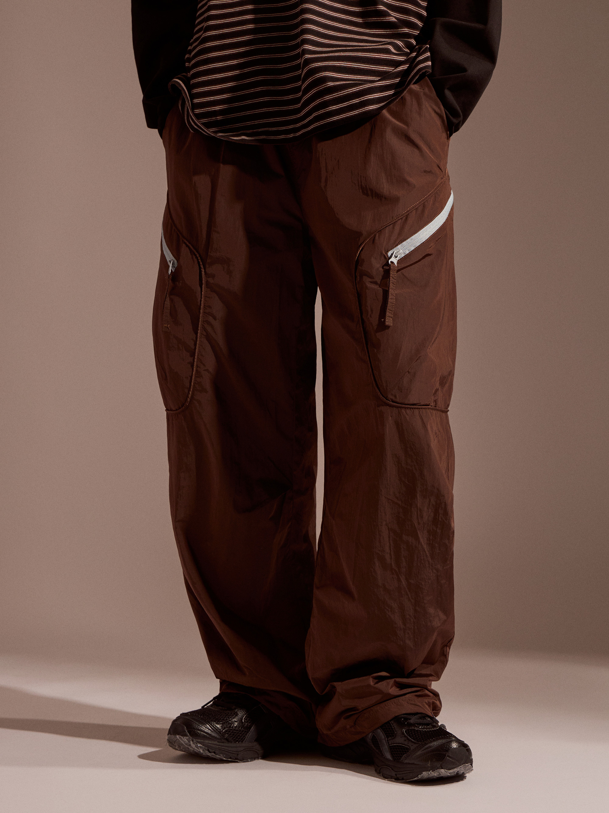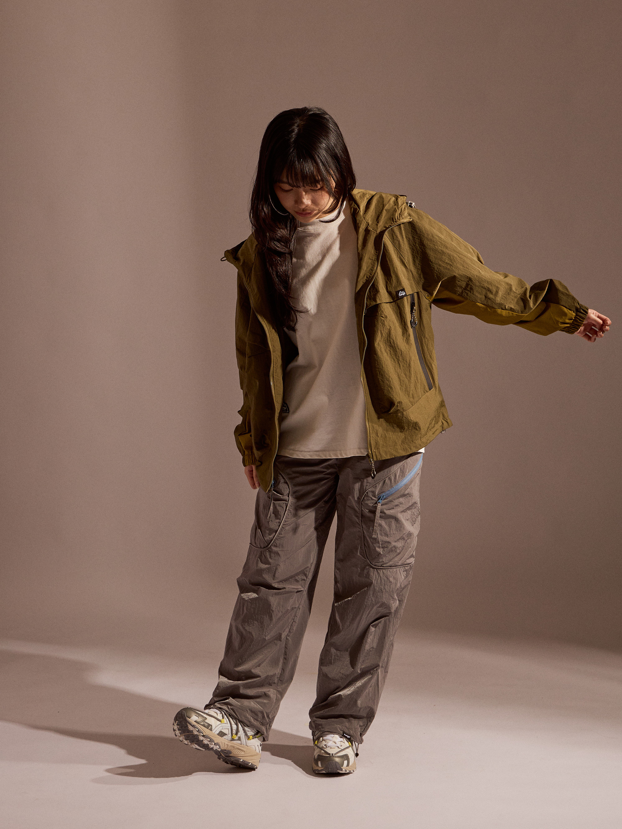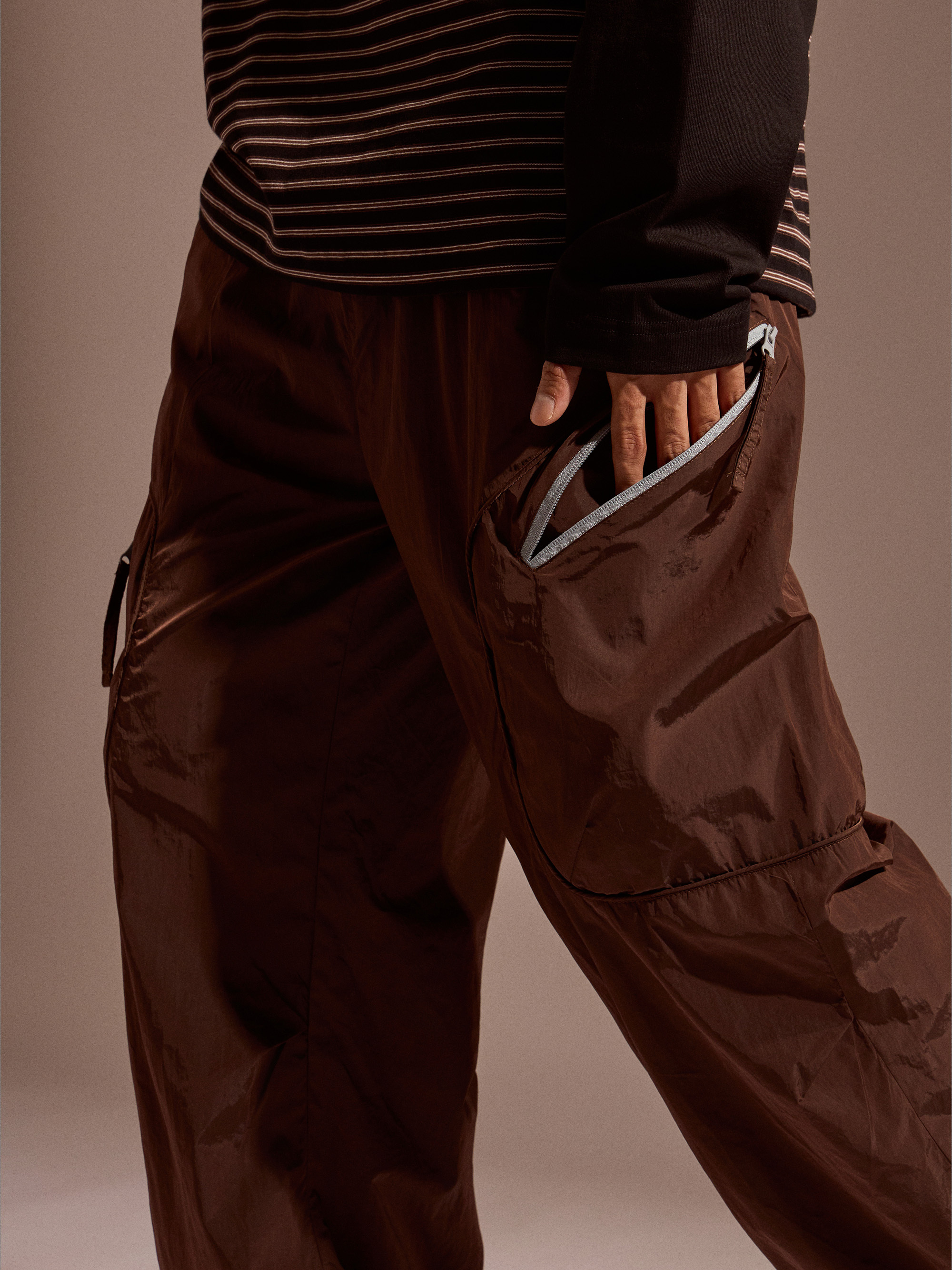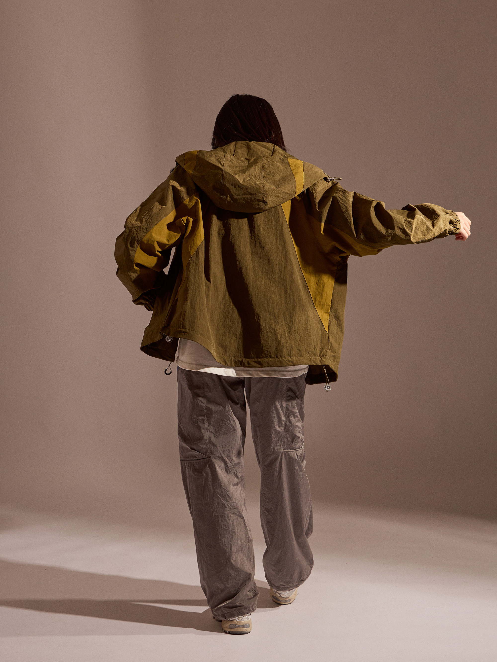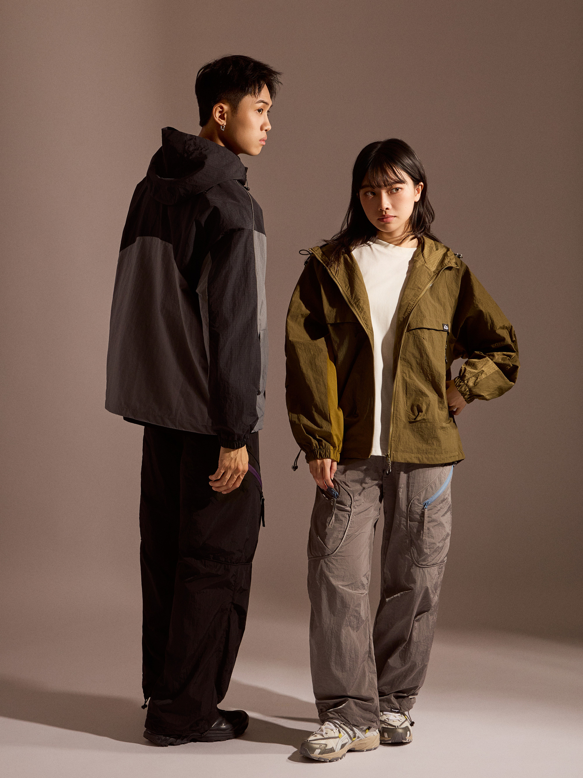 ‧金屬尼龍光感布料:表面微光澤,呈現科技感與街頭氛圍