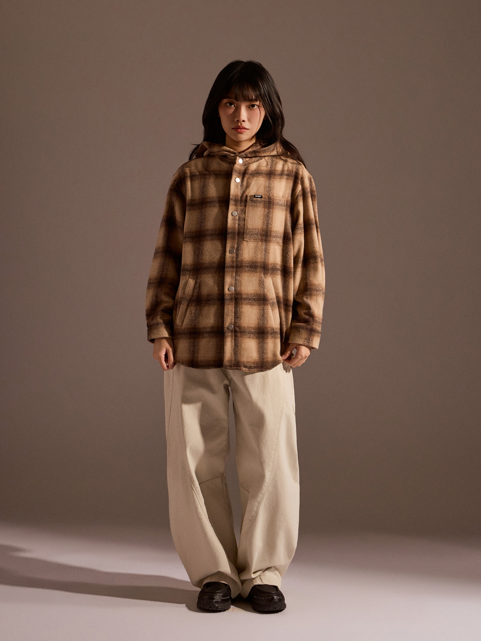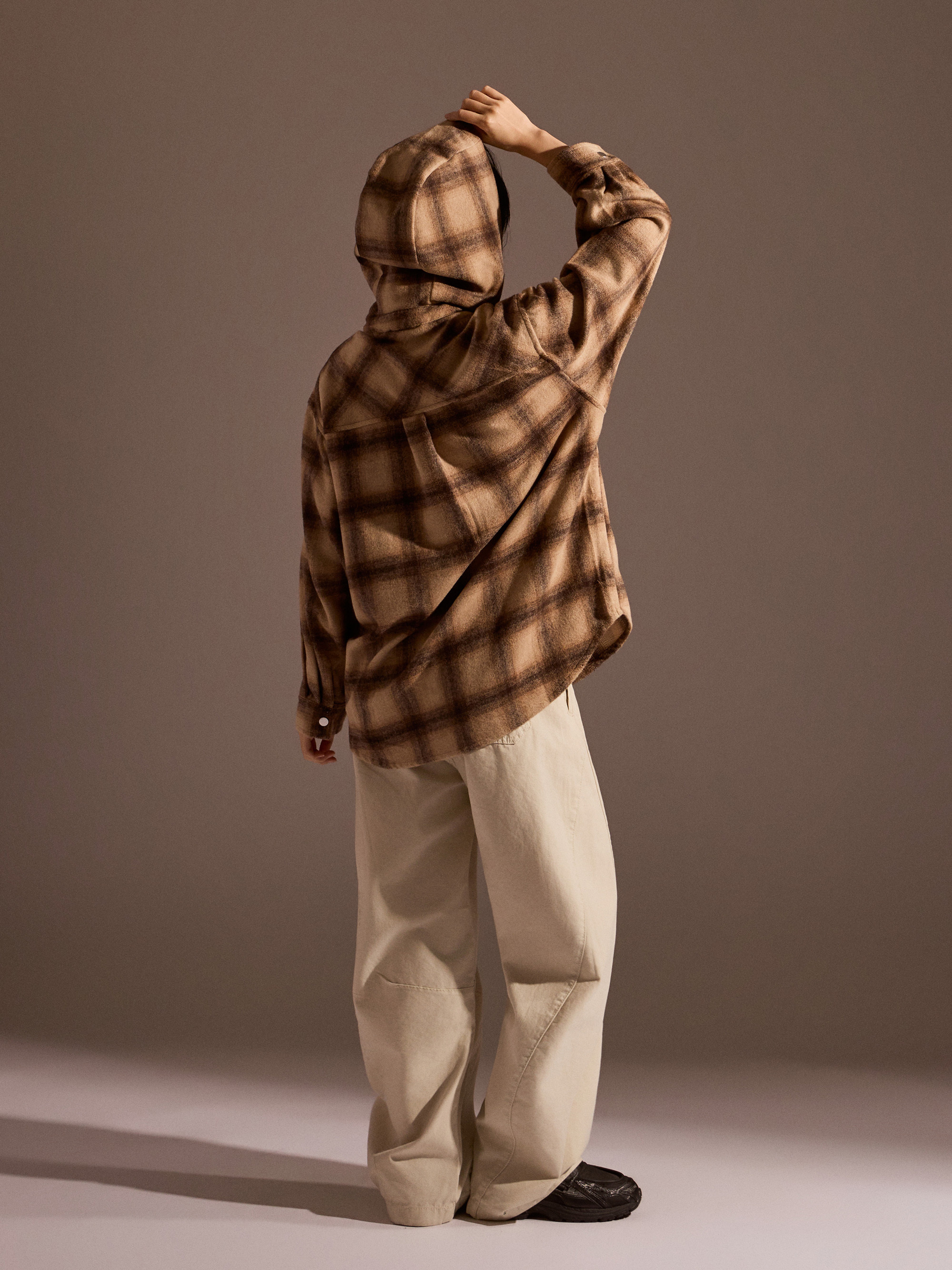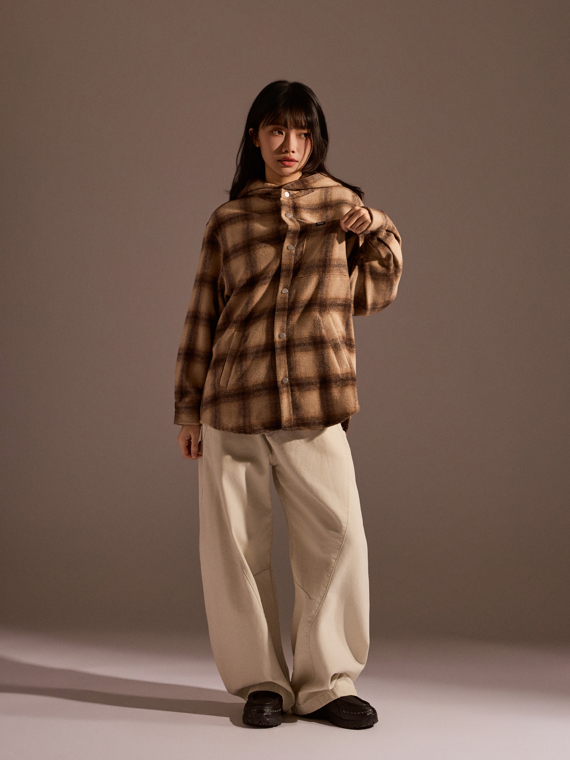 ‧ 大格紋連帽外套式襯衫設計,結合襯衫輪廓與外套實穿度,一件就能完成層次穿搭