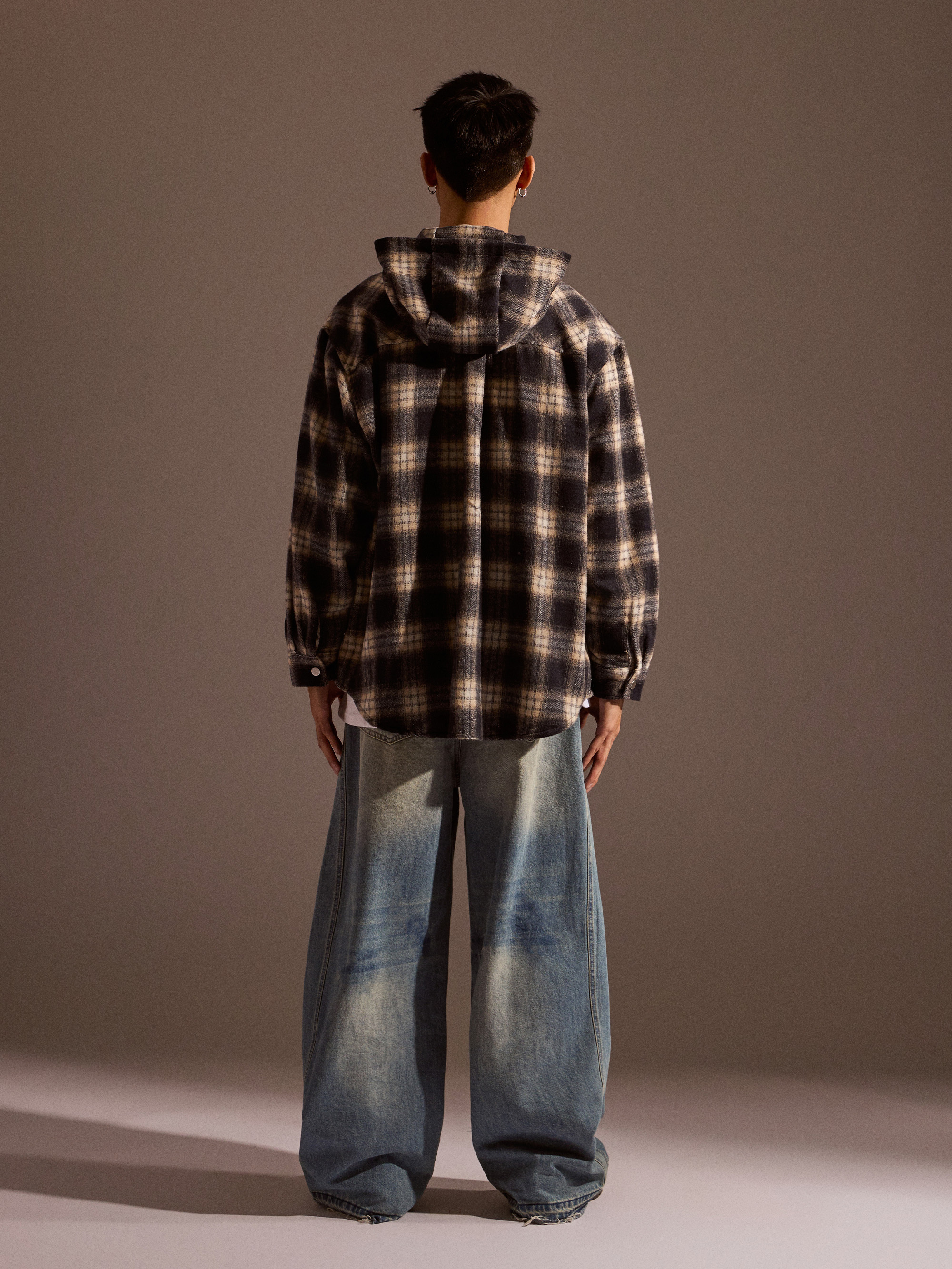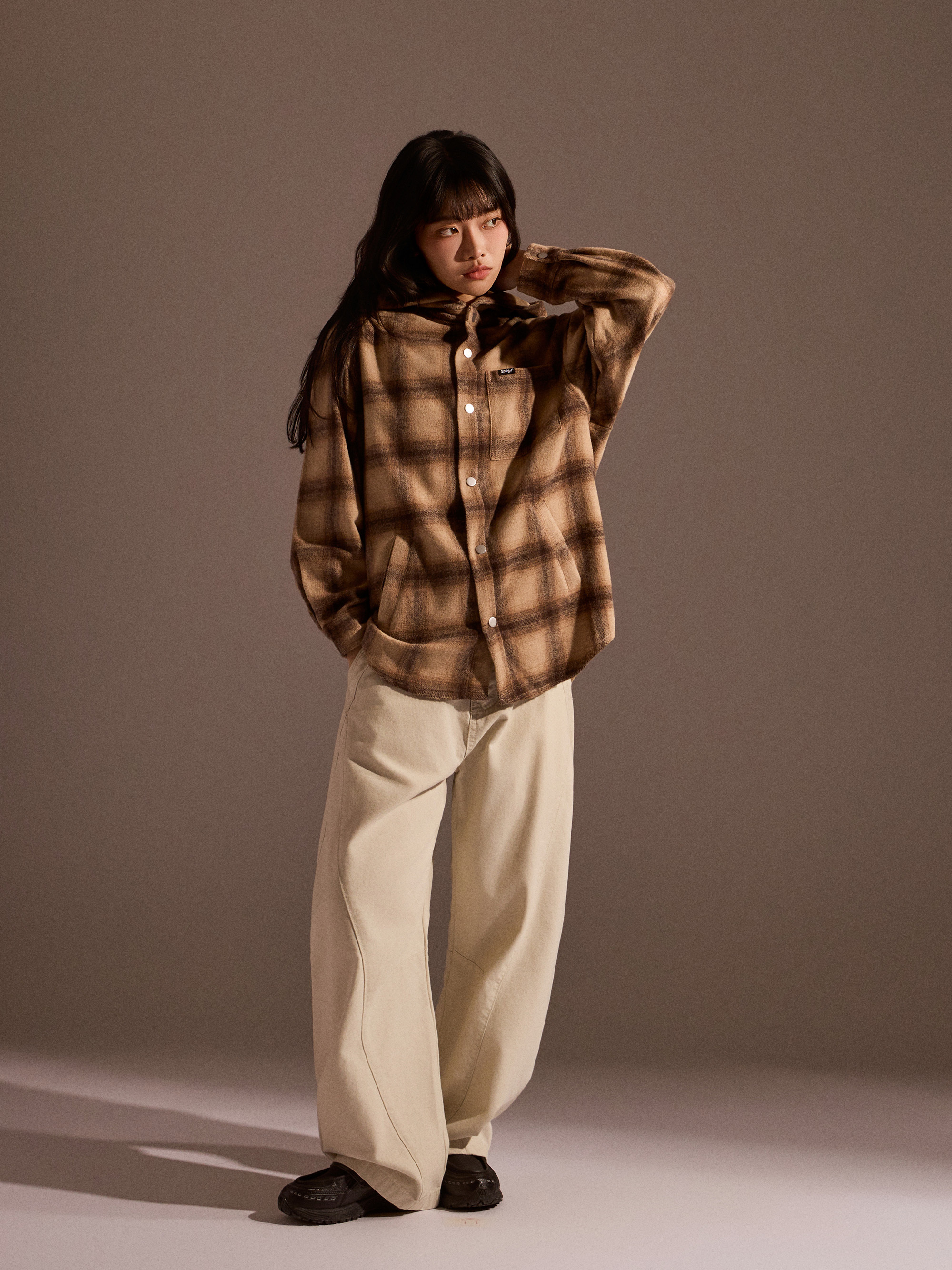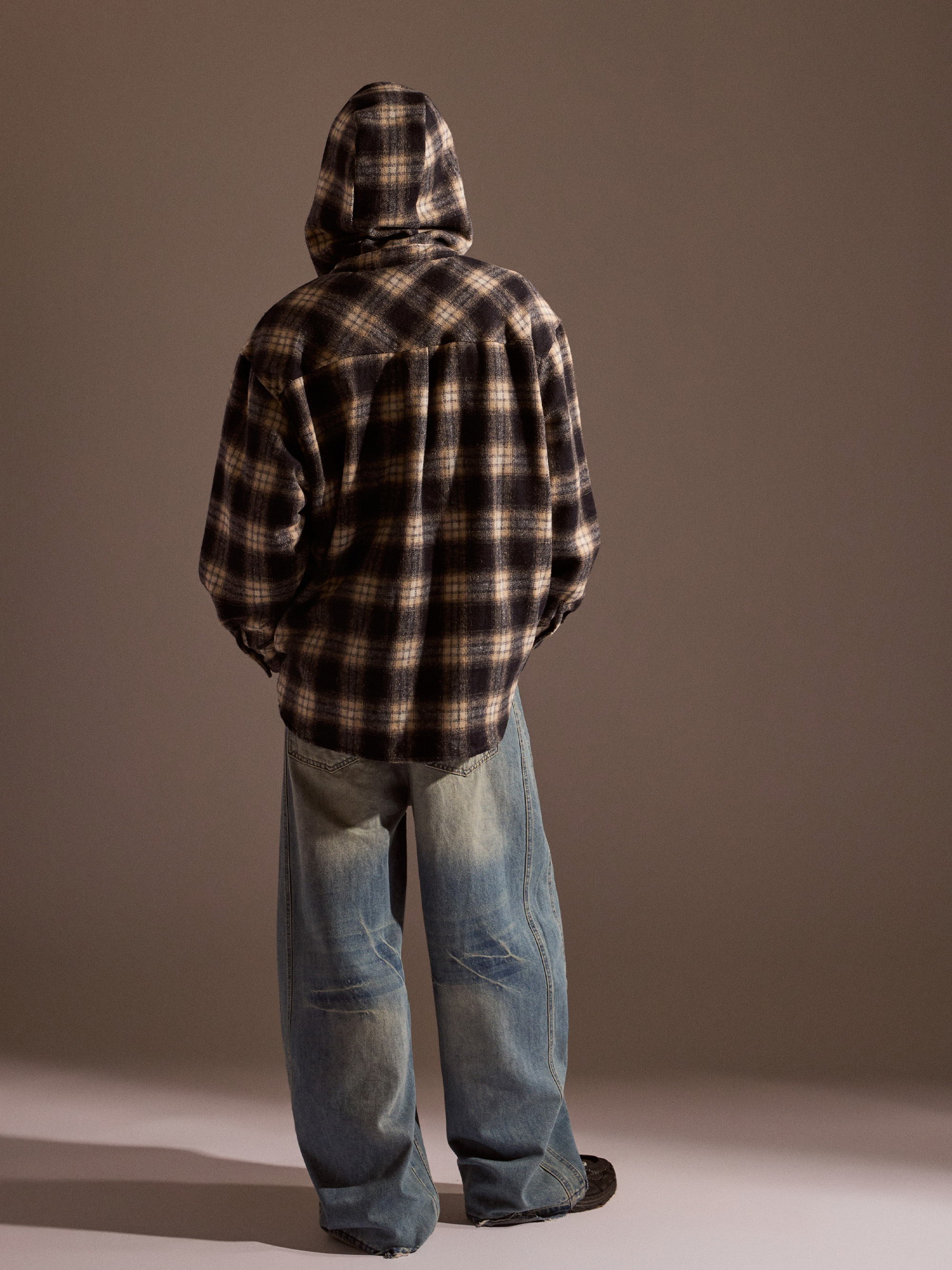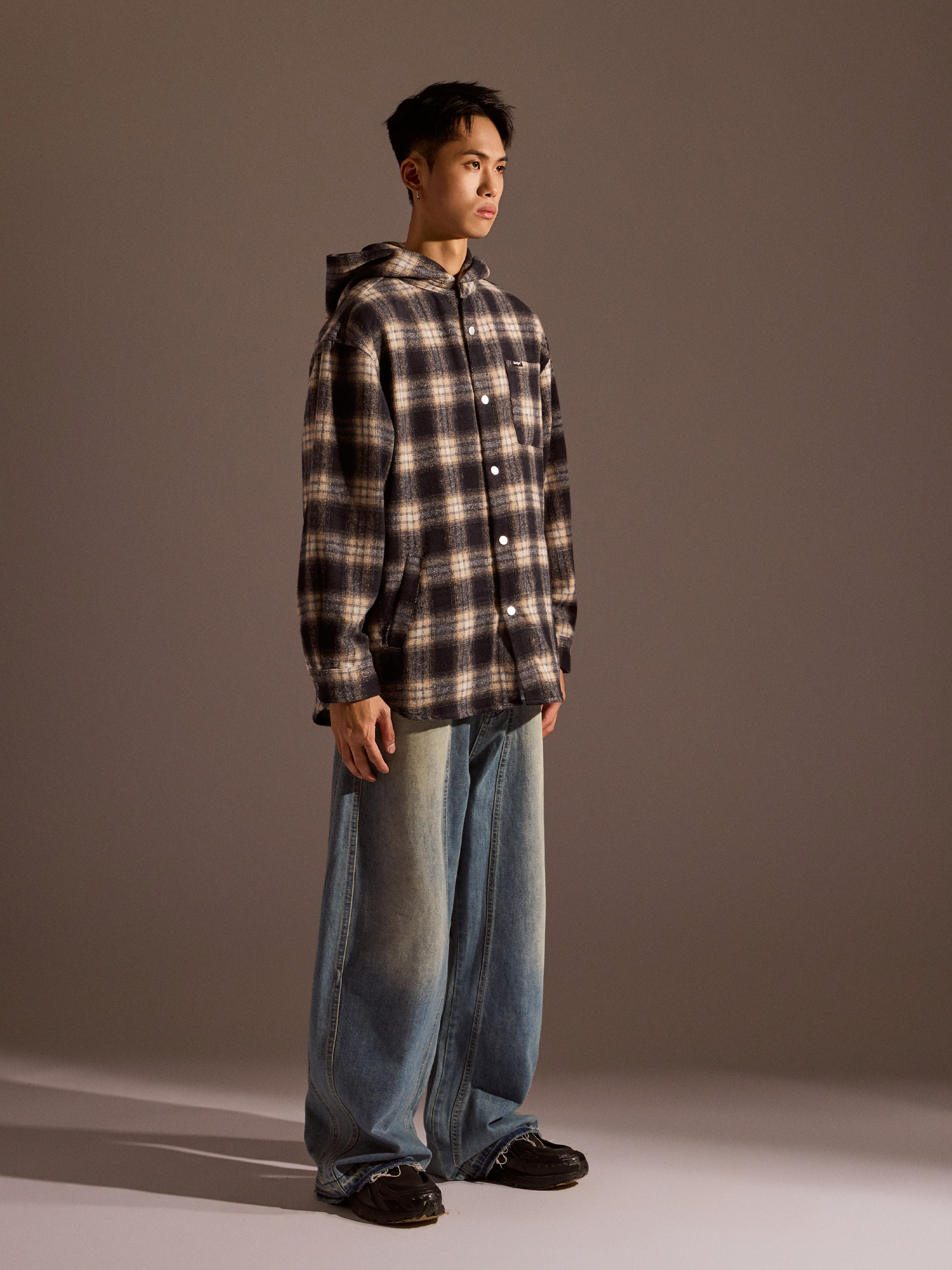 ‧ 大格紋連帽外套式襯衫設計,結合襯衫輪廓與外套實穿度,一件就能完成層次穿搭