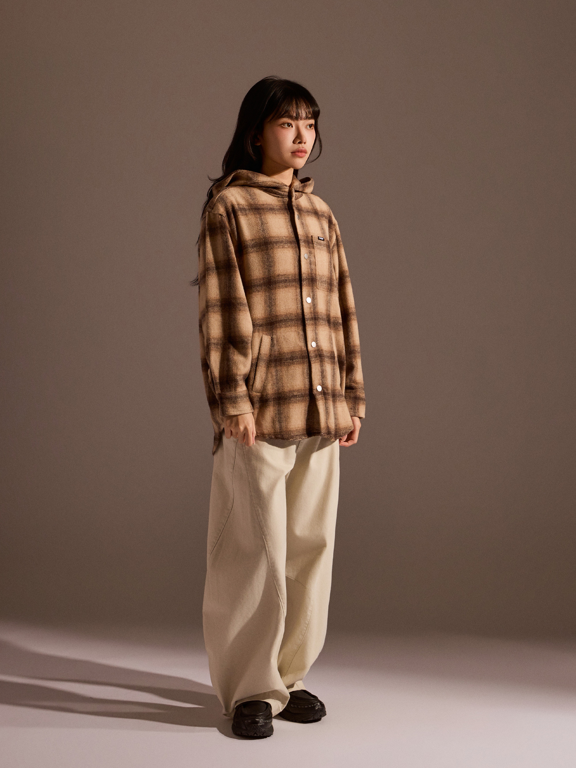從外觀設計來看,整體以大格紋外套式襯衫輪廓呈現,讓單穿就有完整造型感。刷毛格子面料帶來柔軟且具保暖度的穿著體驗,無論秋冬單穿或作為內搭外層都相當合適。連帽剪裁則為整體造型增添戶外休閒氛圍,同時兼顧防風與實用性。
