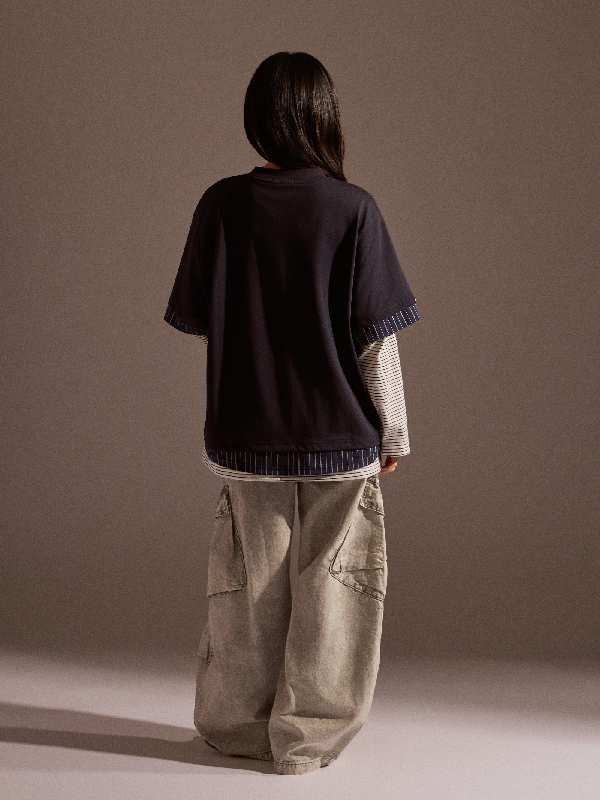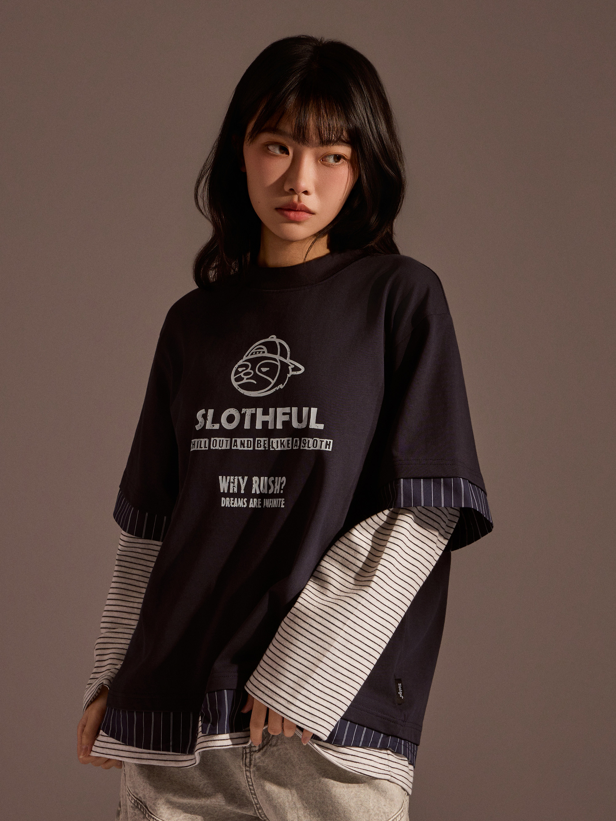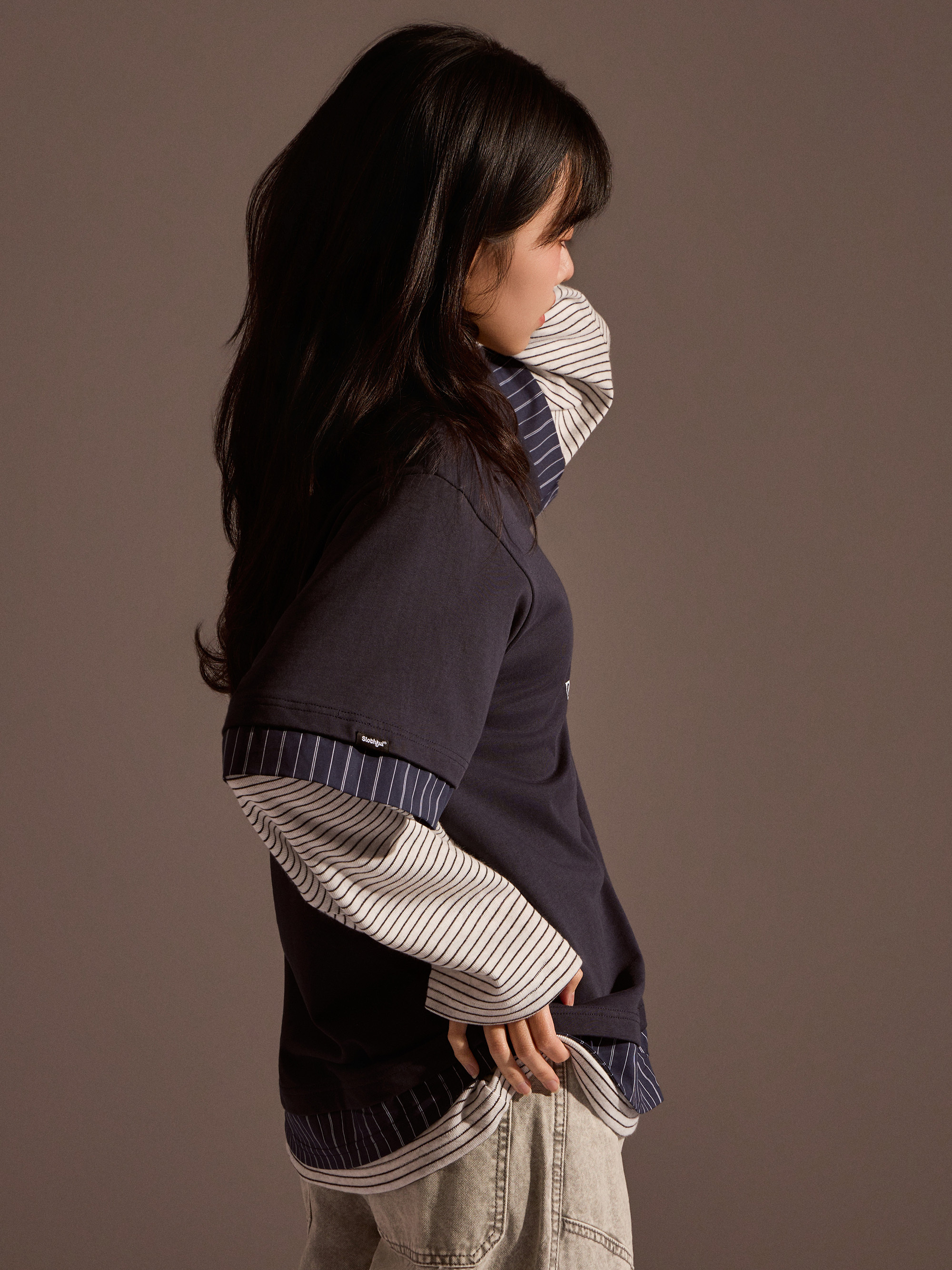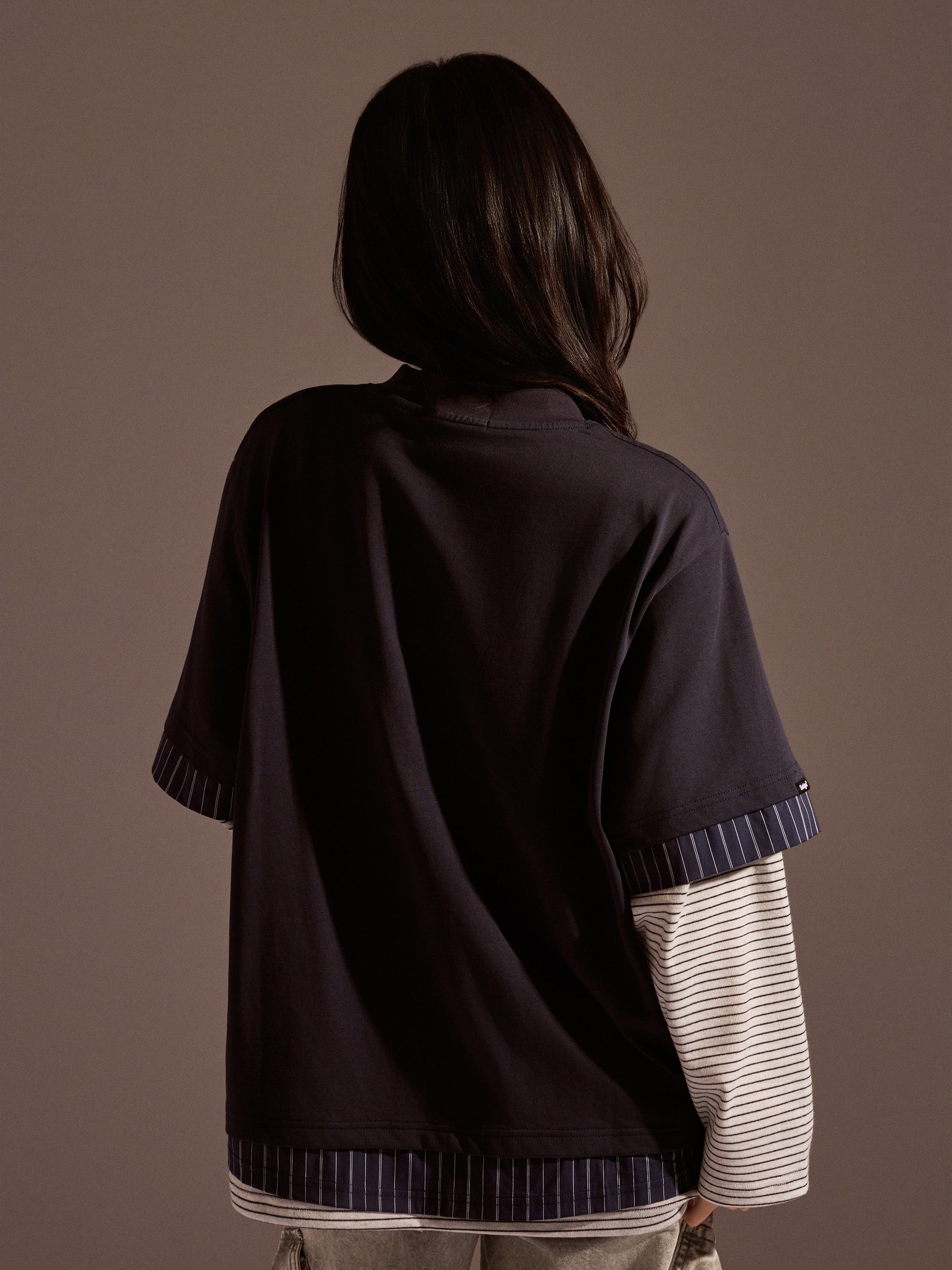 從整體設計來看,本款以素色長袖為基底,搭配條紋襯衫面料與條紋針織面料進行異材質拼接,讓視覺層次更加豐富,同時保有整體穿搭的協調感。圓領假兩件結構自然堆疊出層次效果,再加上品牌印花點綴,讓整體風格在簡約之中多了一點細節亮點。