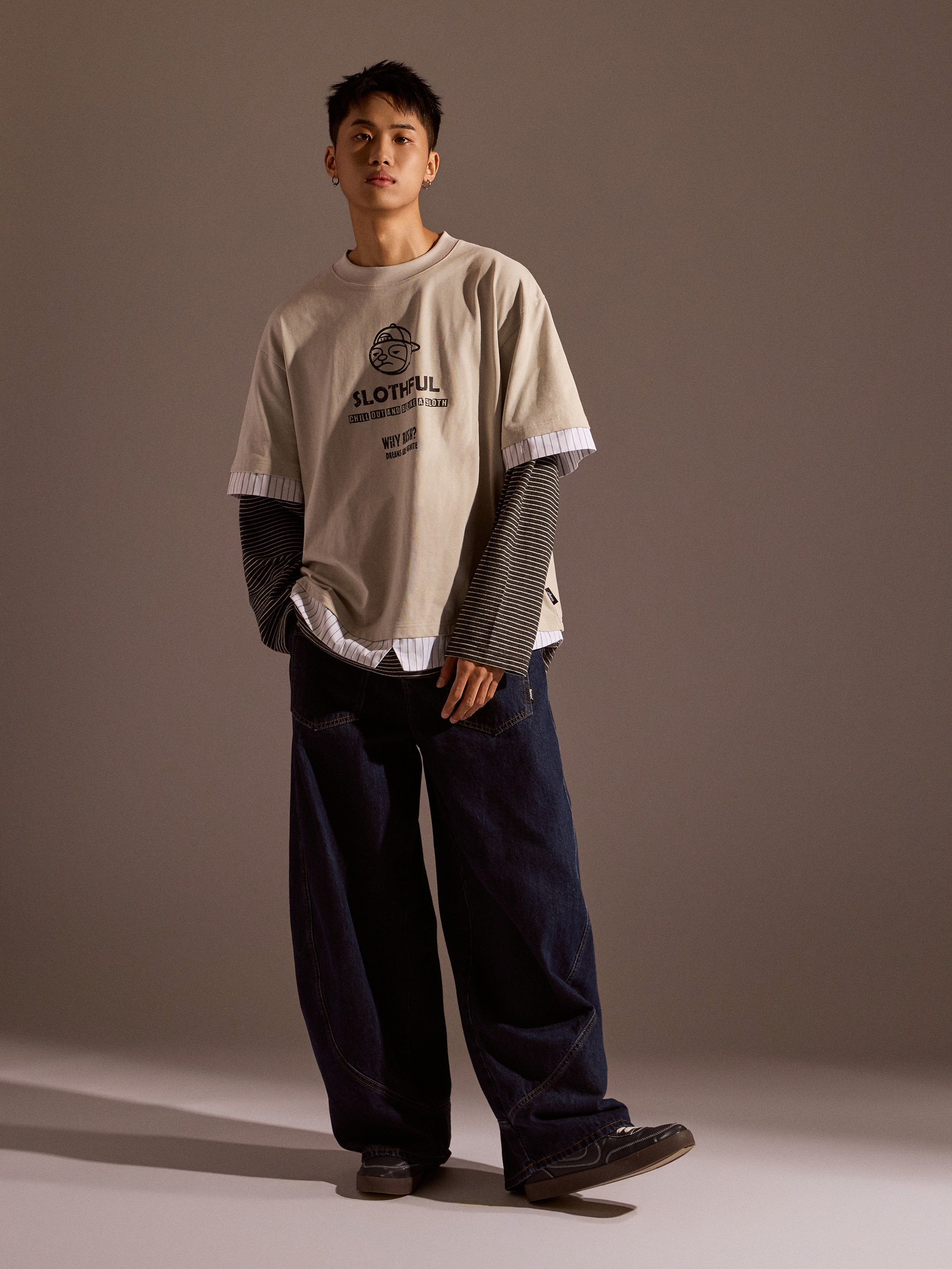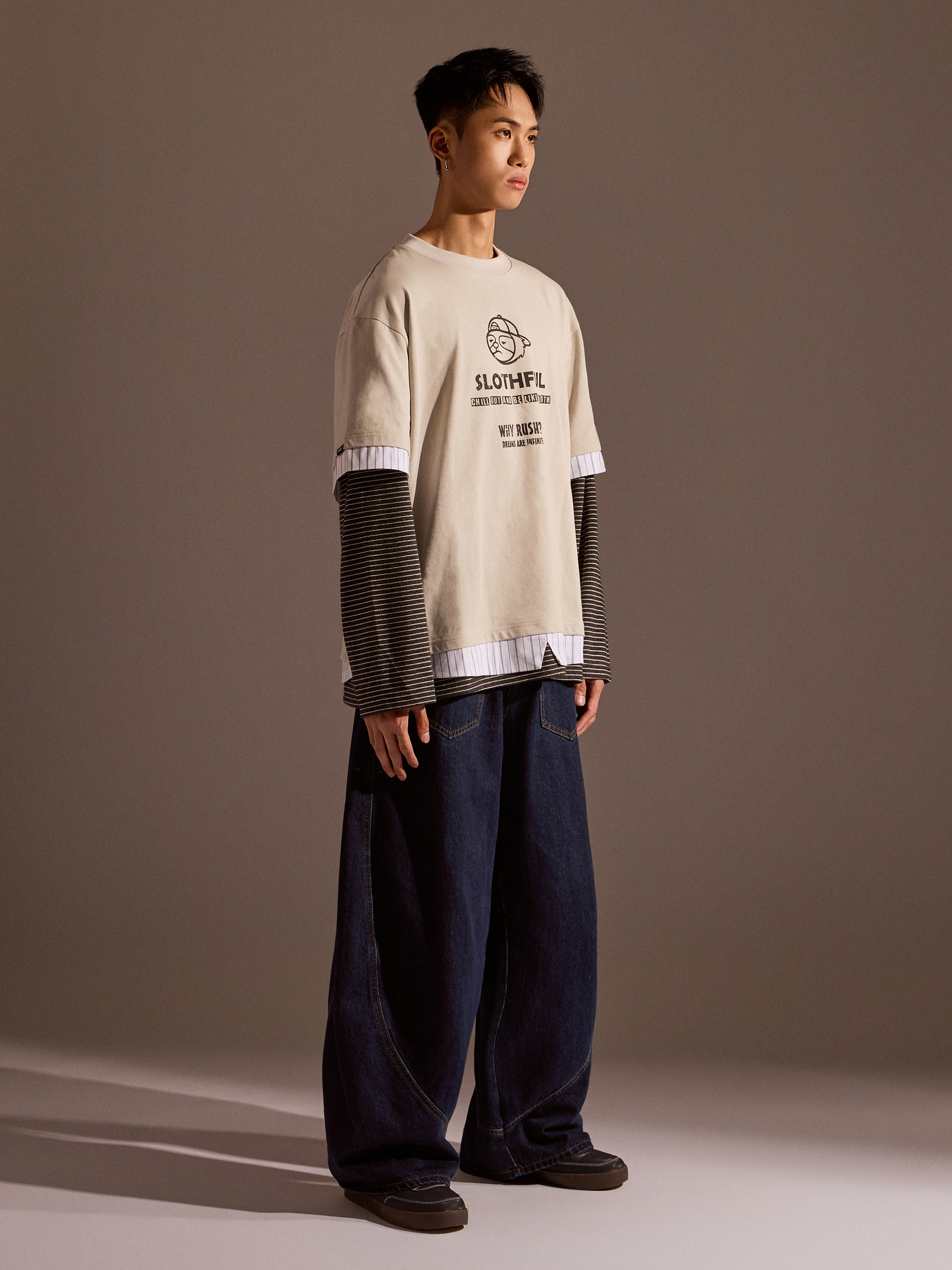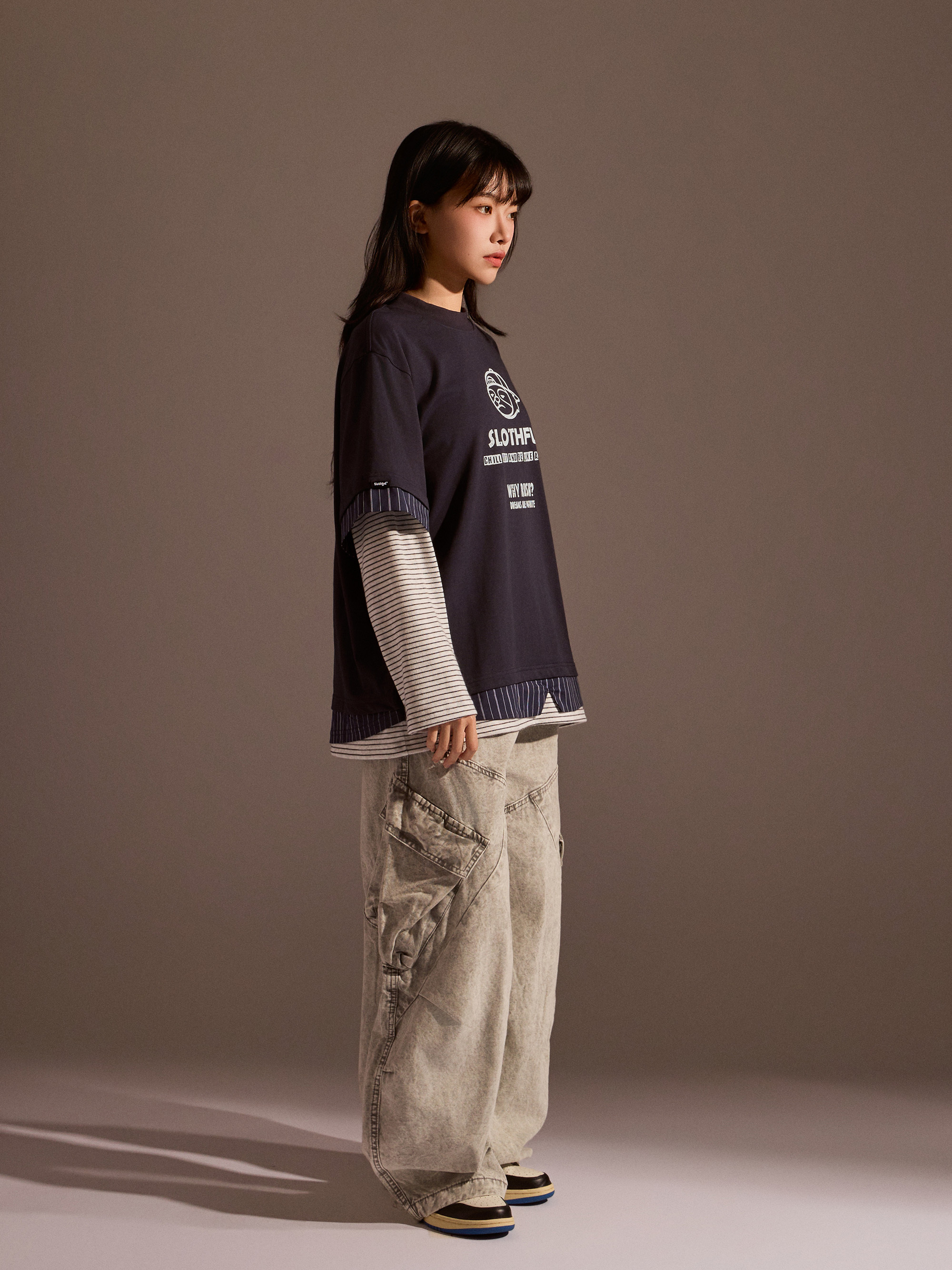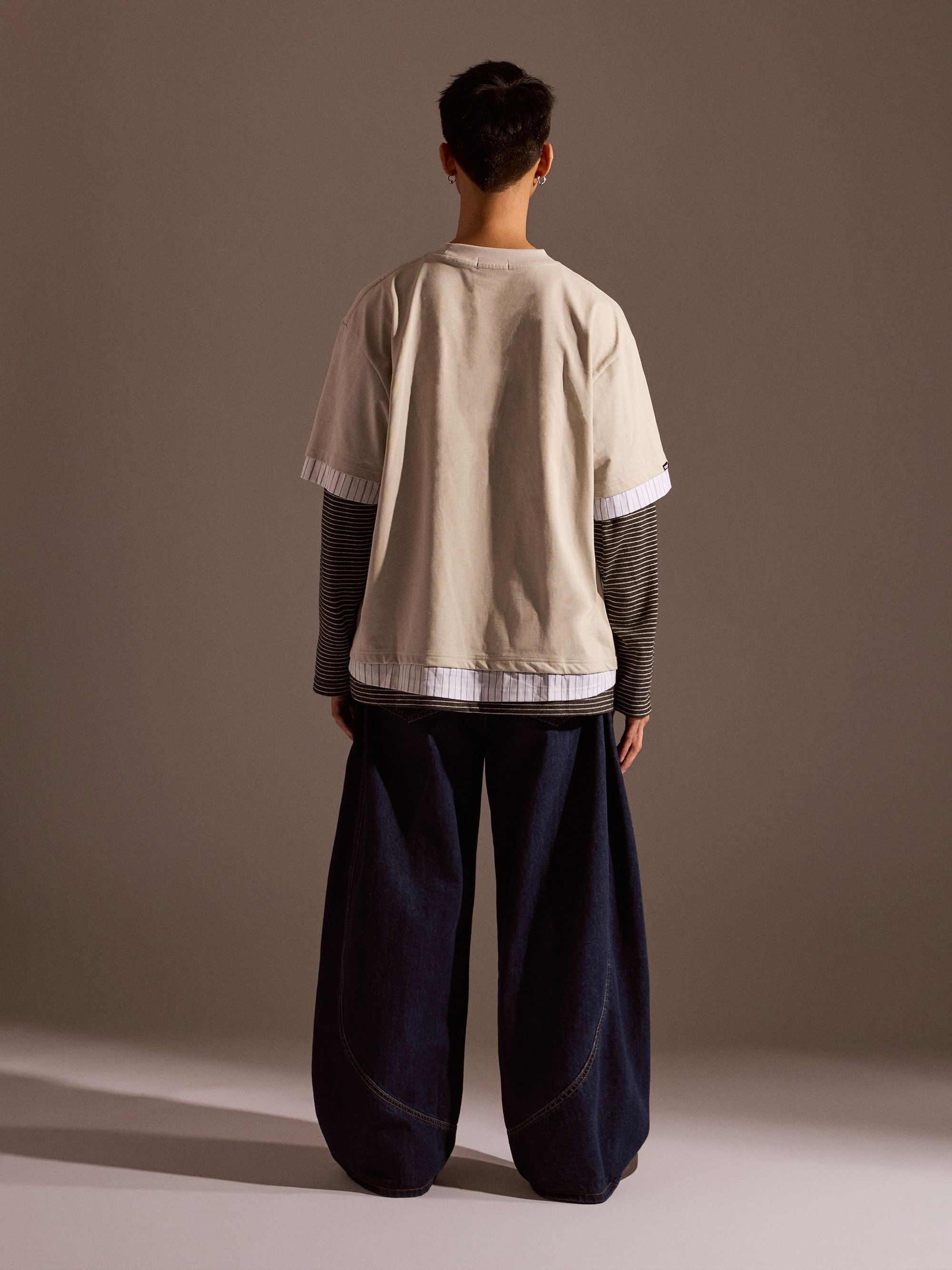 從整體設計來看,本款以素色長袖為基底,搭配條紋襯衫面料與條紋針織面料進行異材質拼接,讓視覺層次更加豐富,同時保有整體穿搭的協調感。圓領假兩件結構自然堆疊出層次效果,再加上品牌印花點綴,讓整體風格在簡約之中多了一點細節亮點。