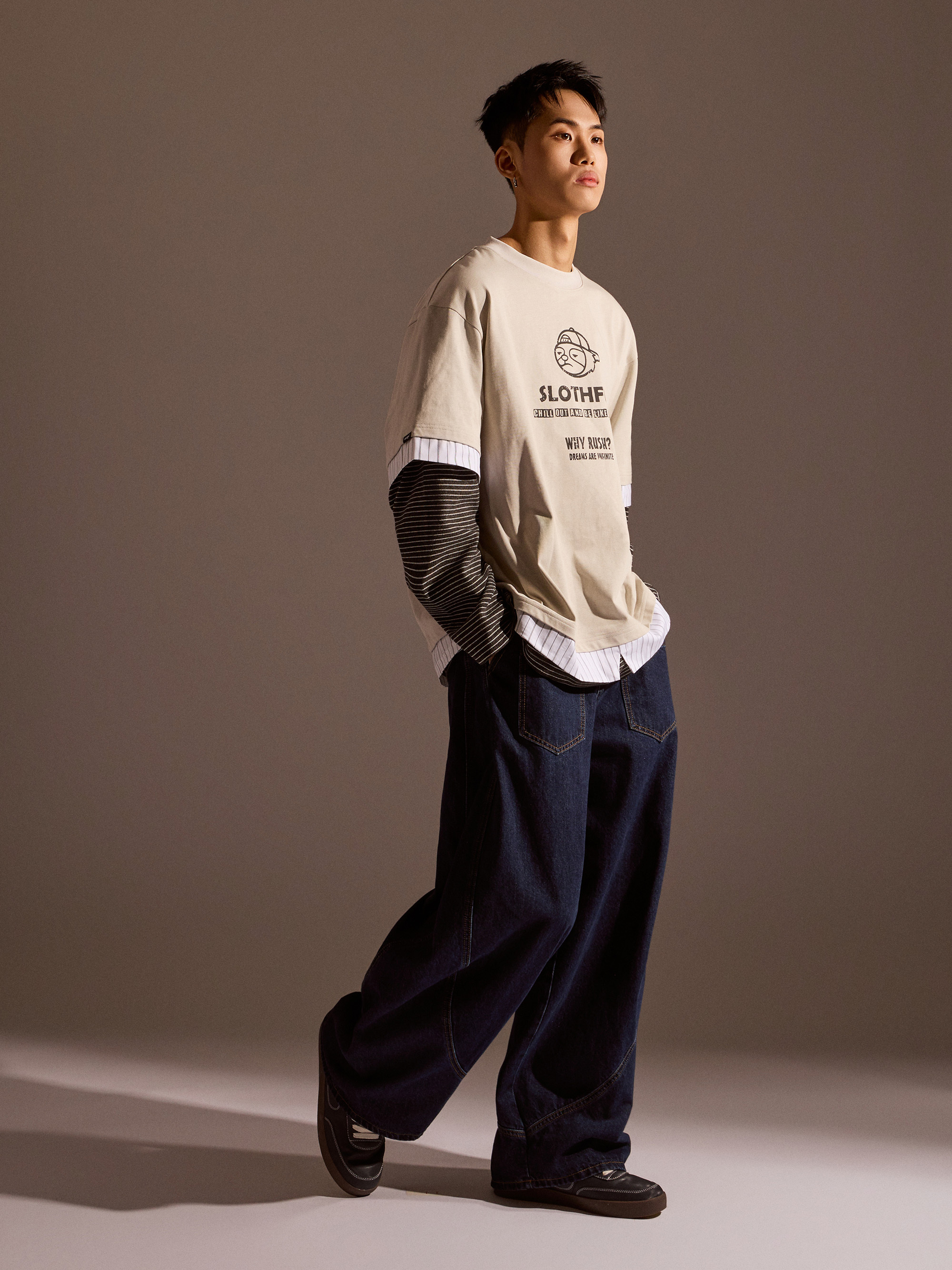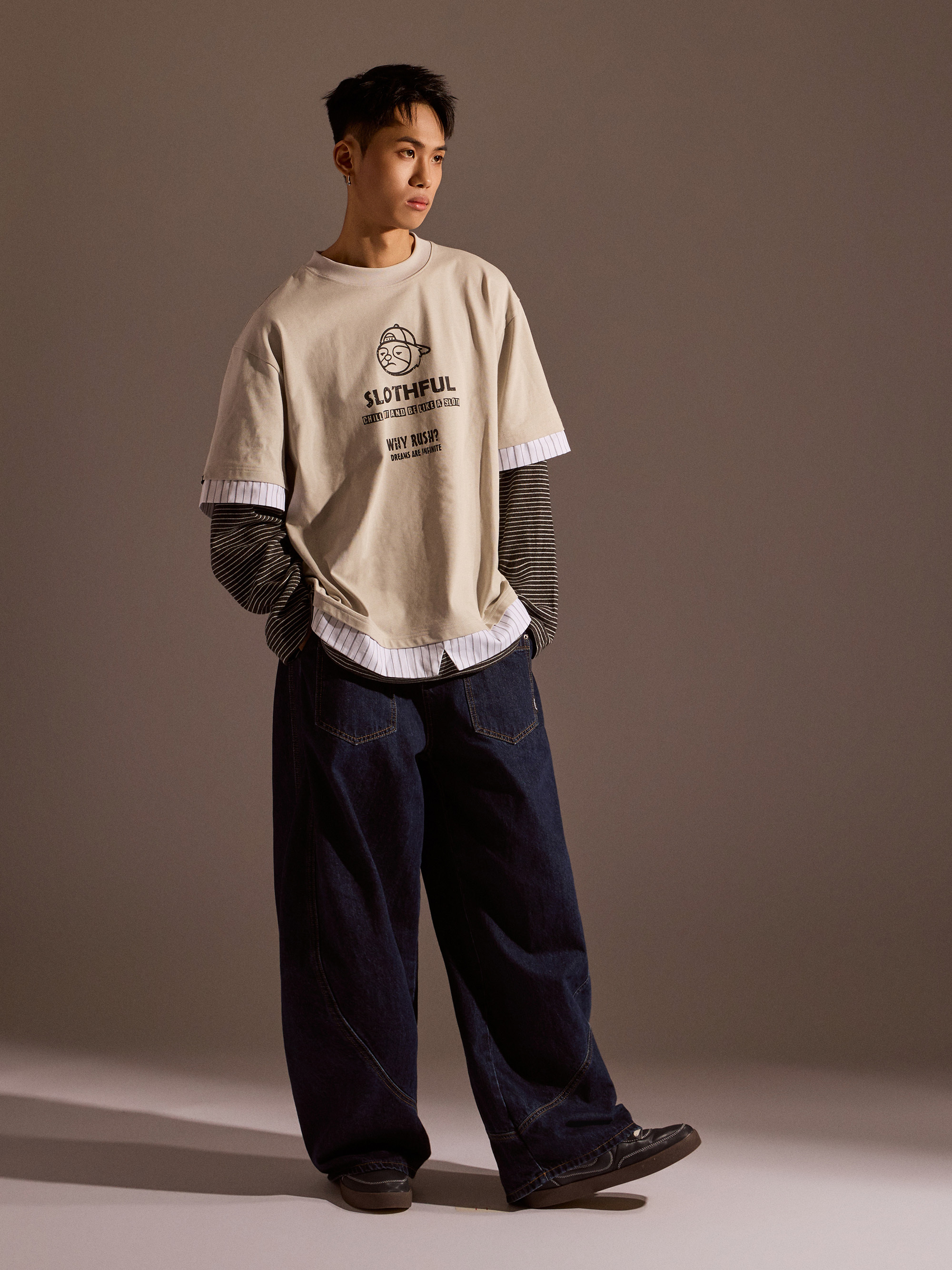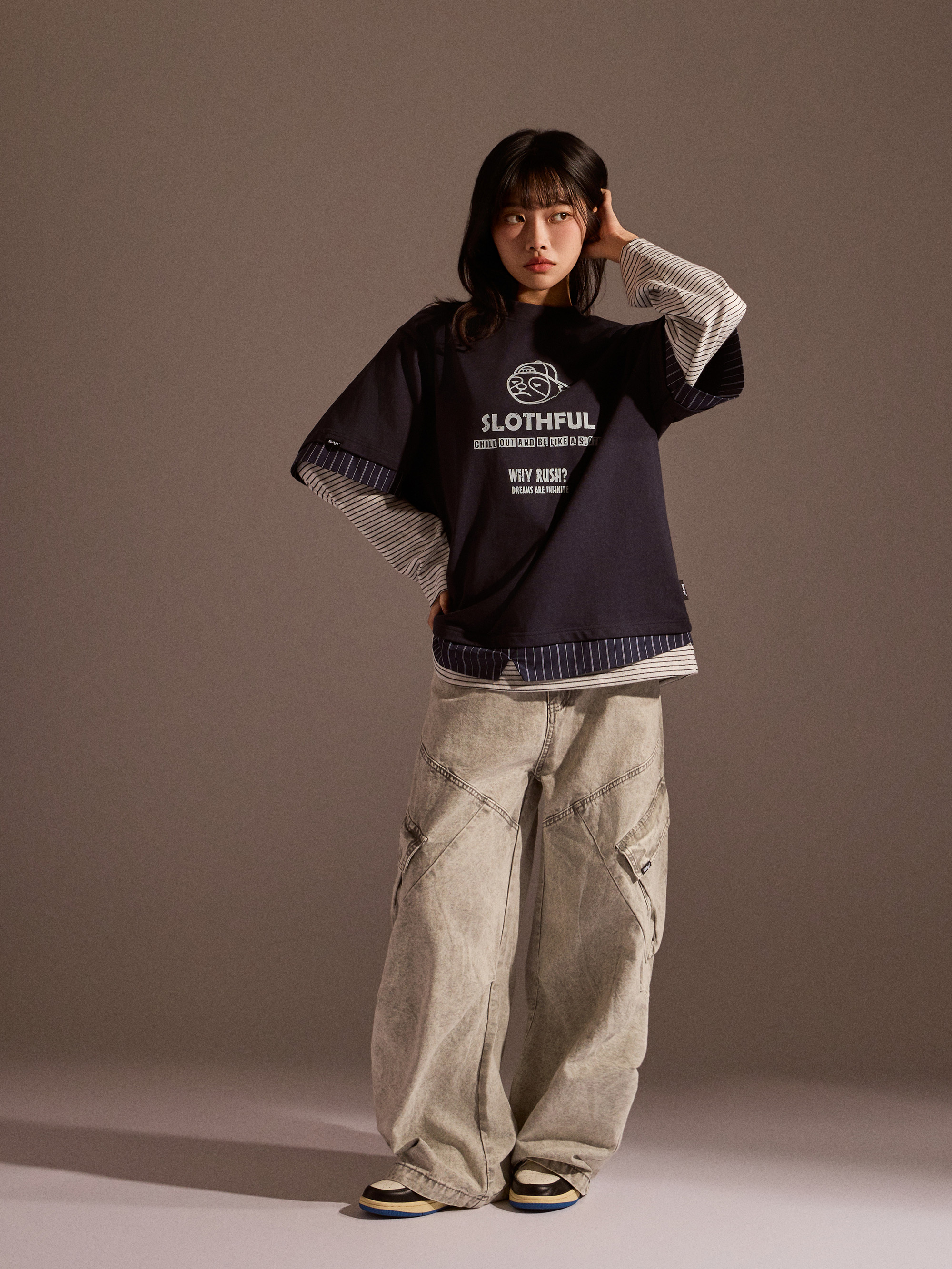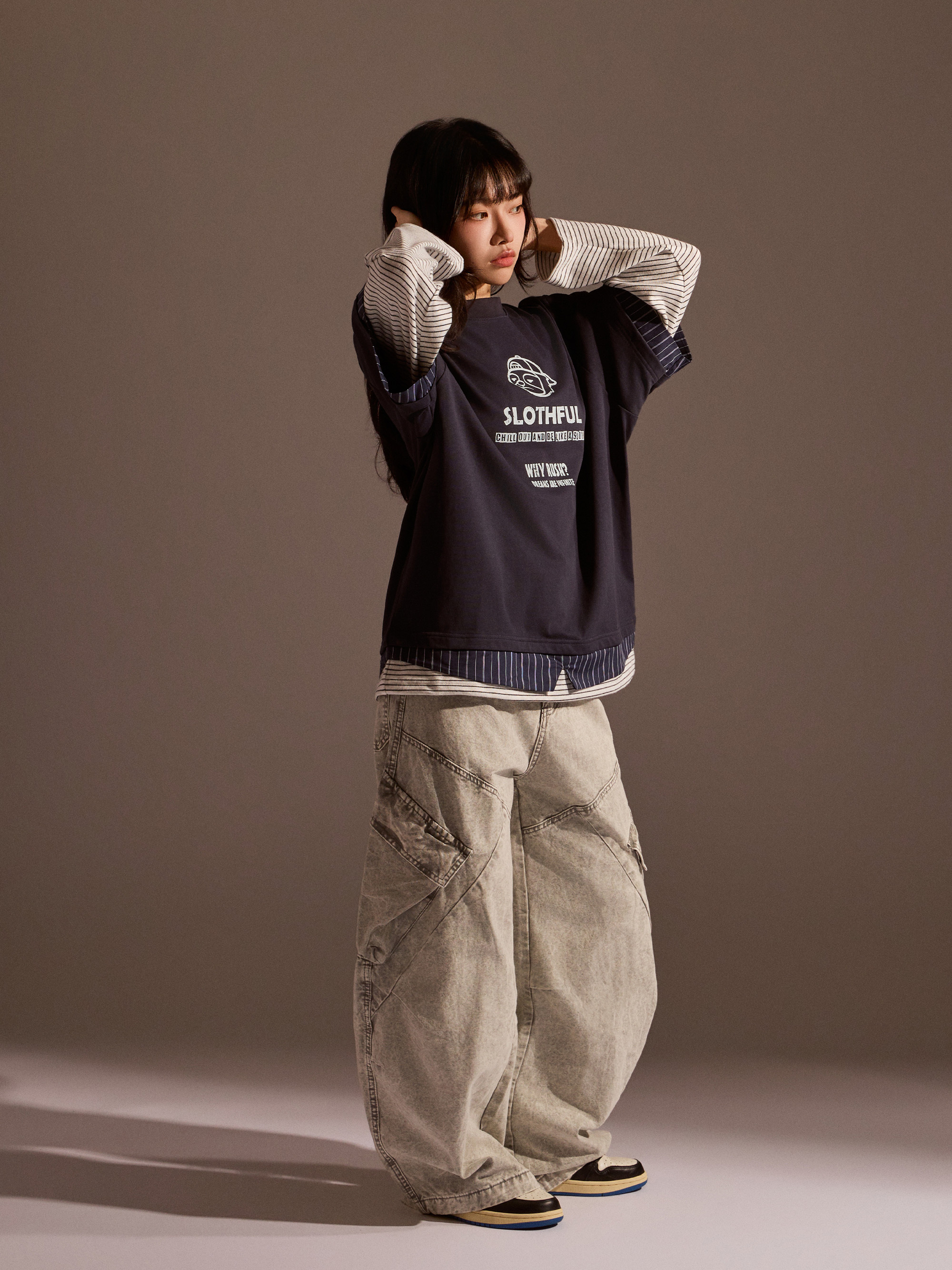 從整體設計來看,本款以素色長袖為基底,搭配條紋襯衫面料與條紋針織面料進行異材質拼接,讓視覺層次更加豐富,同時保有整體穿搭的協調感。圓領假兩件結構自然堆疊出層次效果,再加上品牌印花點綴,讓整體風格在簡約之中多了一點細節亮點。