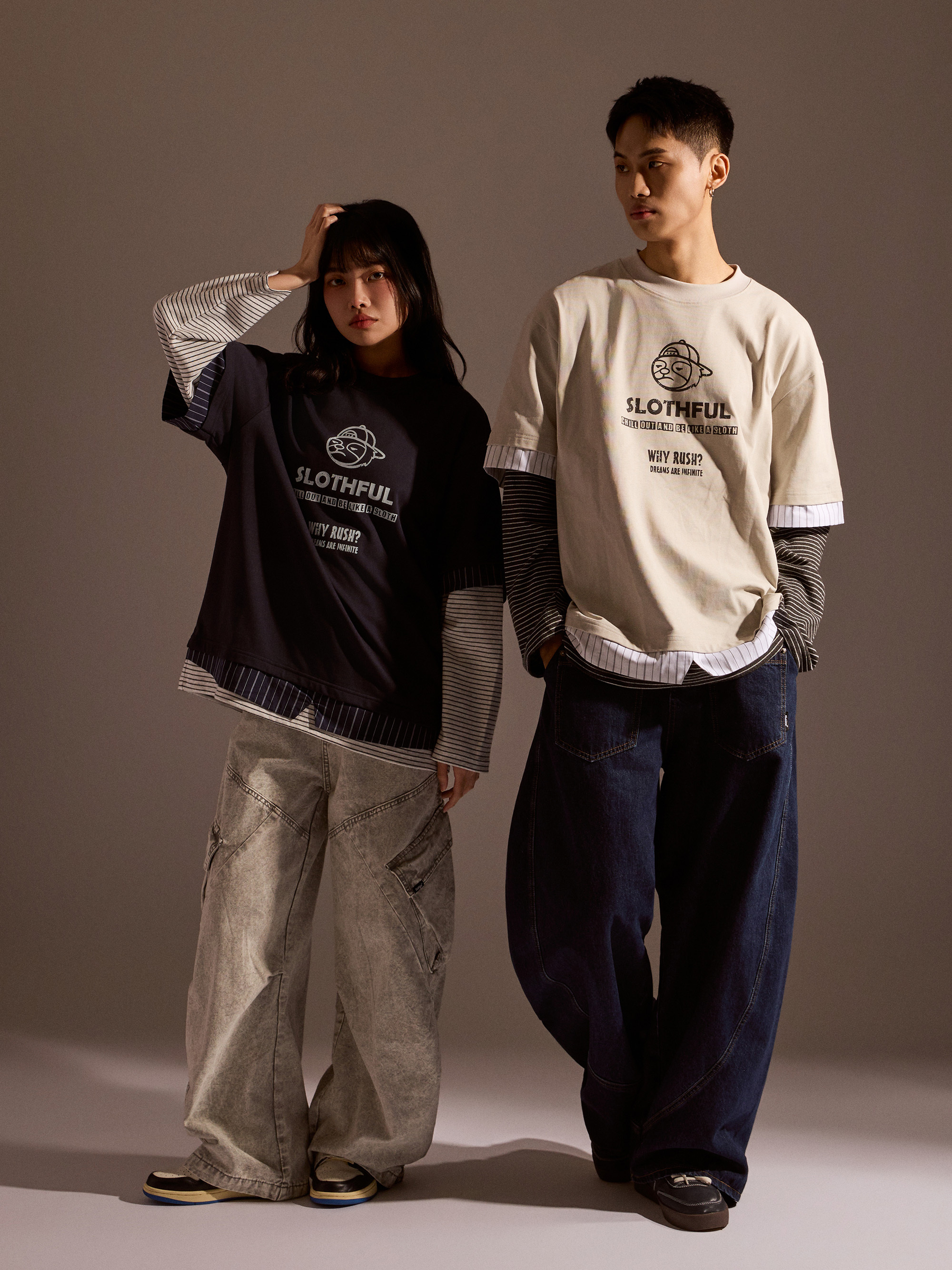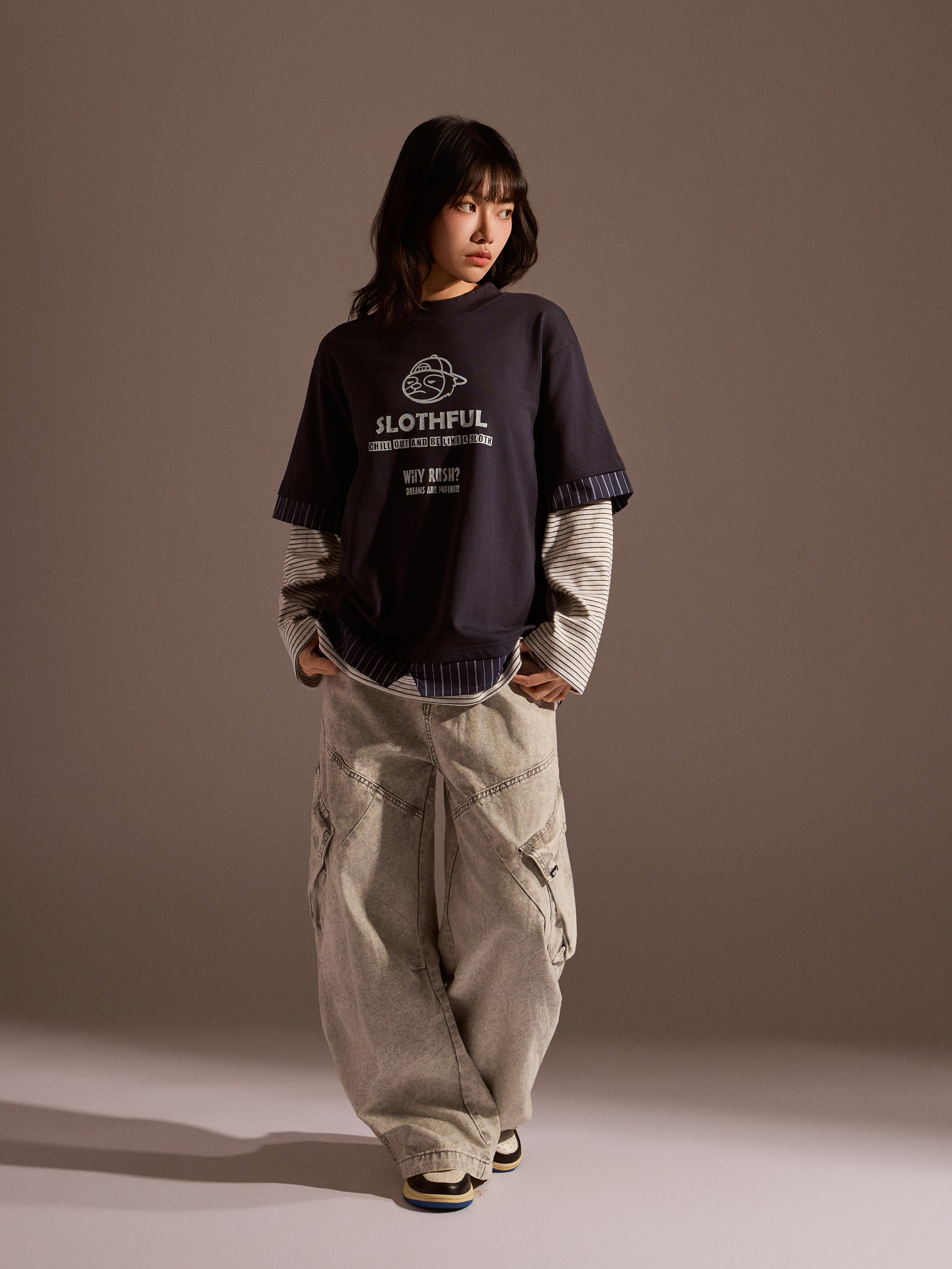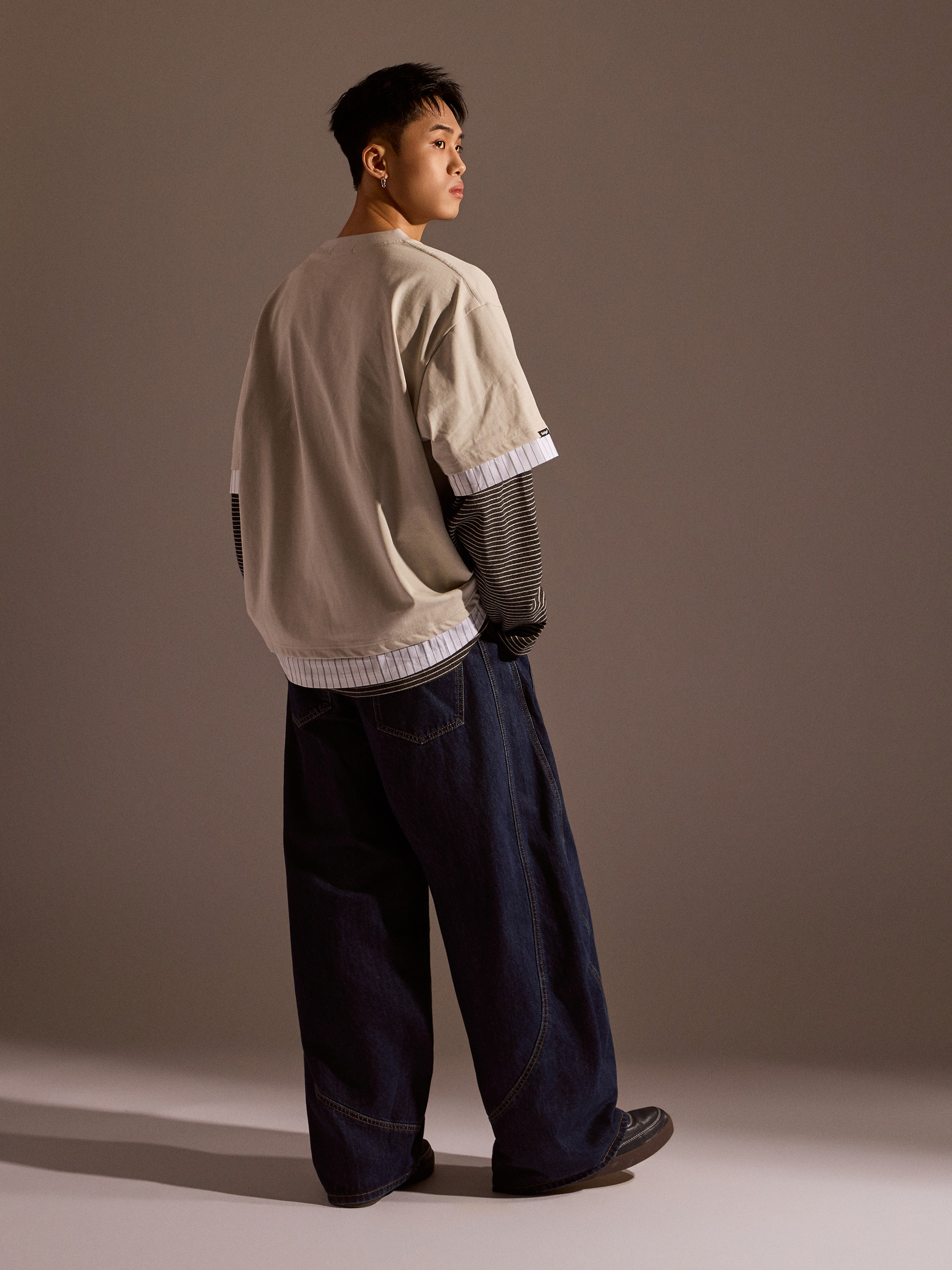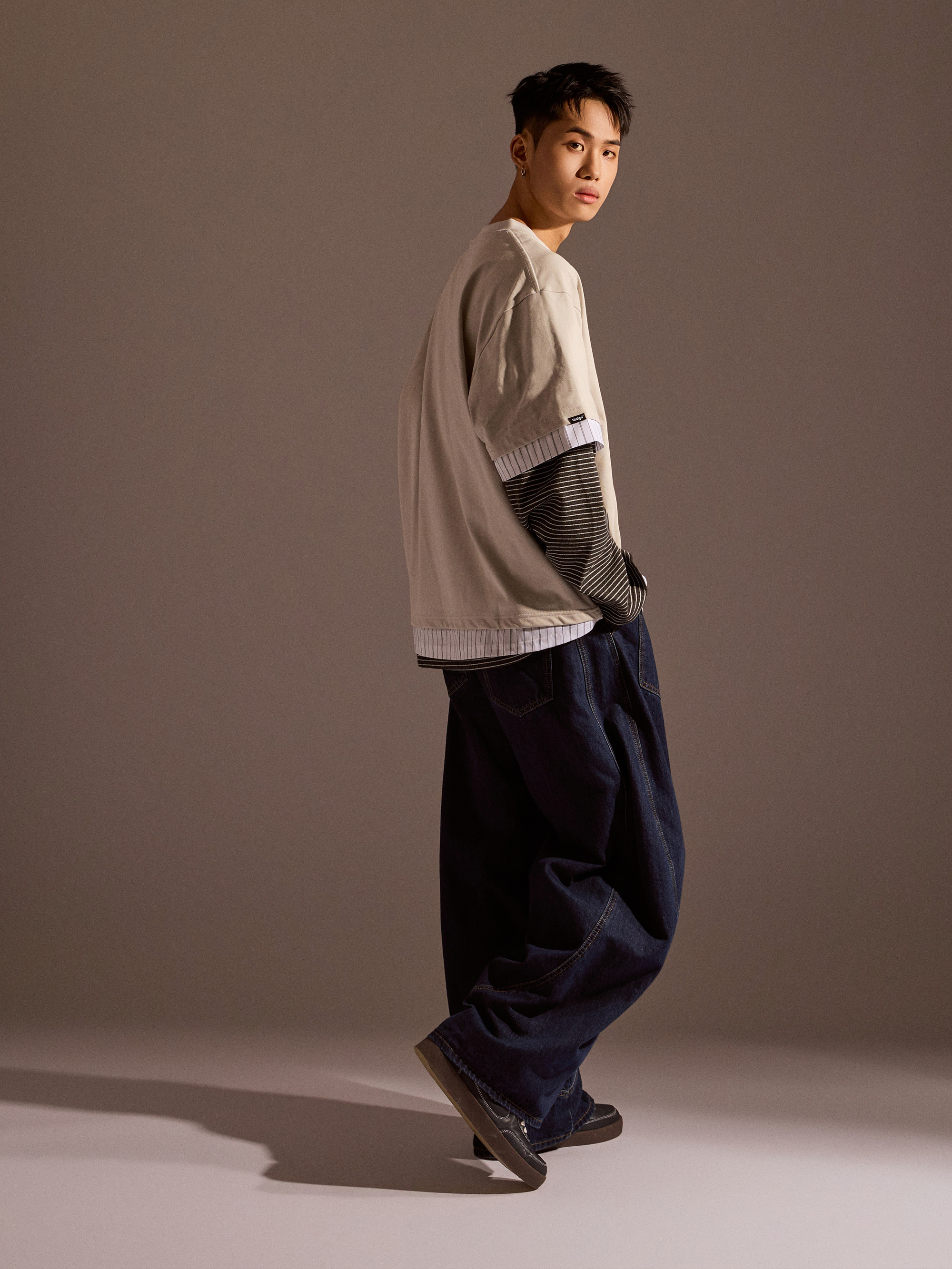 從整體設計來看,本款以素色長袖為基底,搭配條紋襯衫面料與條紋針織面料進行異材質拼接,讓視覺層次更加豐富,同時保有整體穿搭的協調感。圓領假兩件結構自然堆疊出層次效果,再加上品牌印花點綴,讓整體風格在簡約之中多了一點細節亮點。