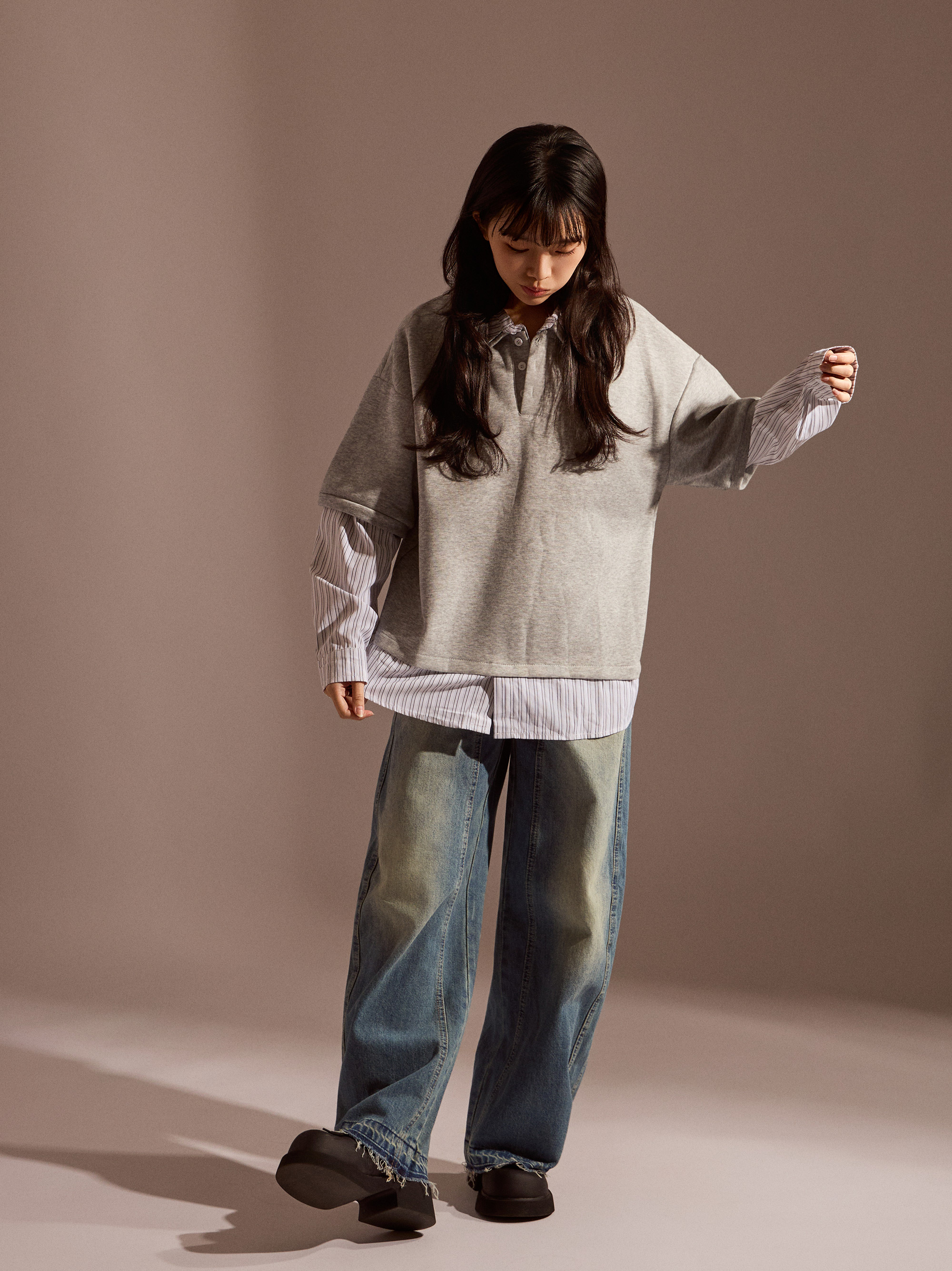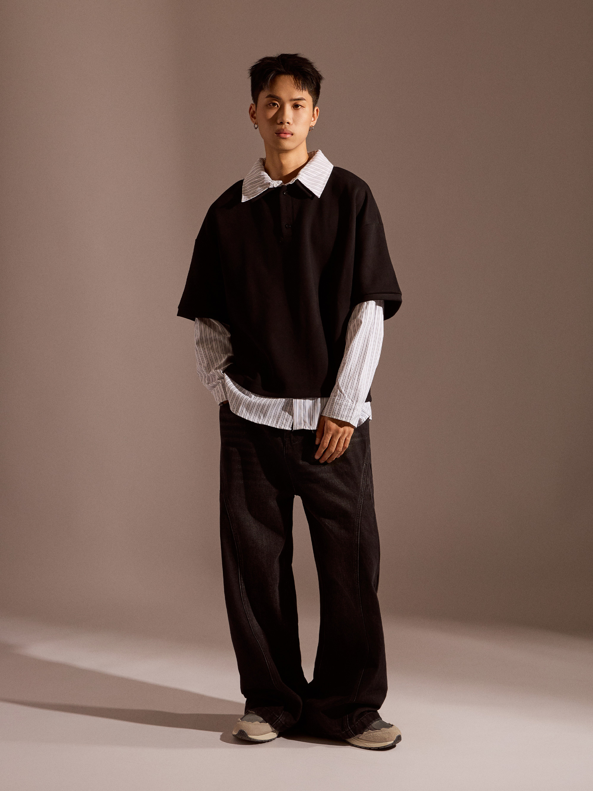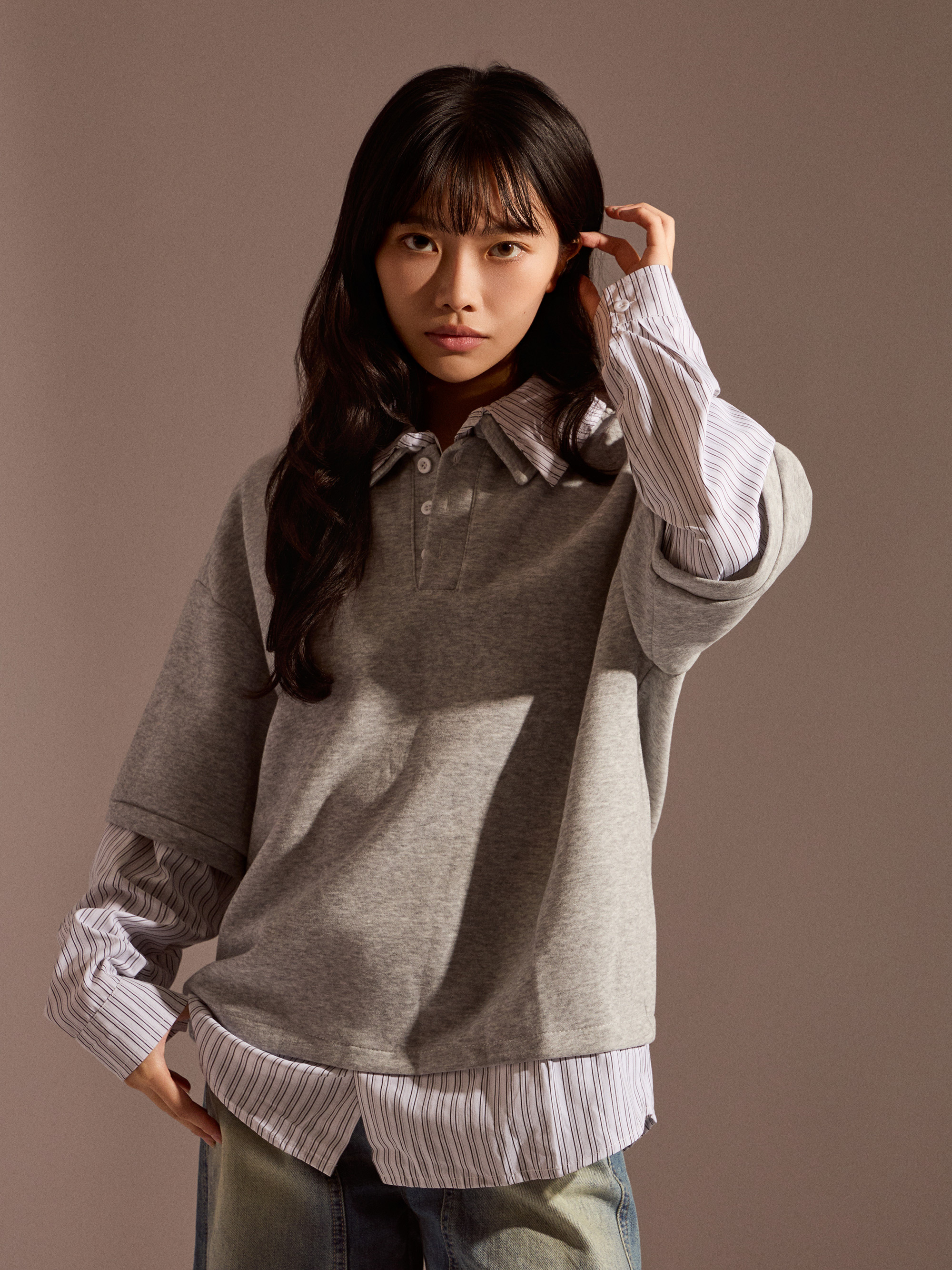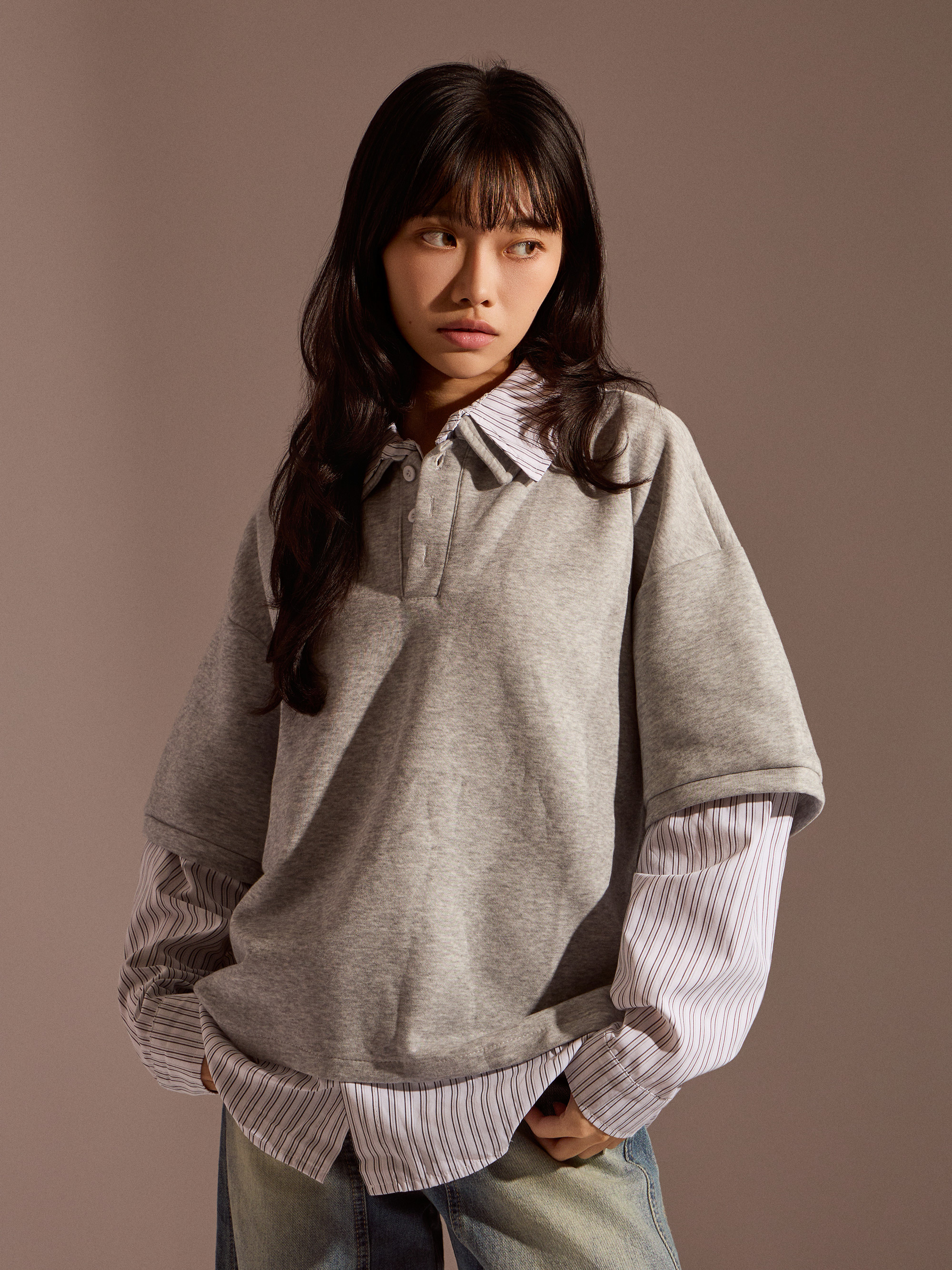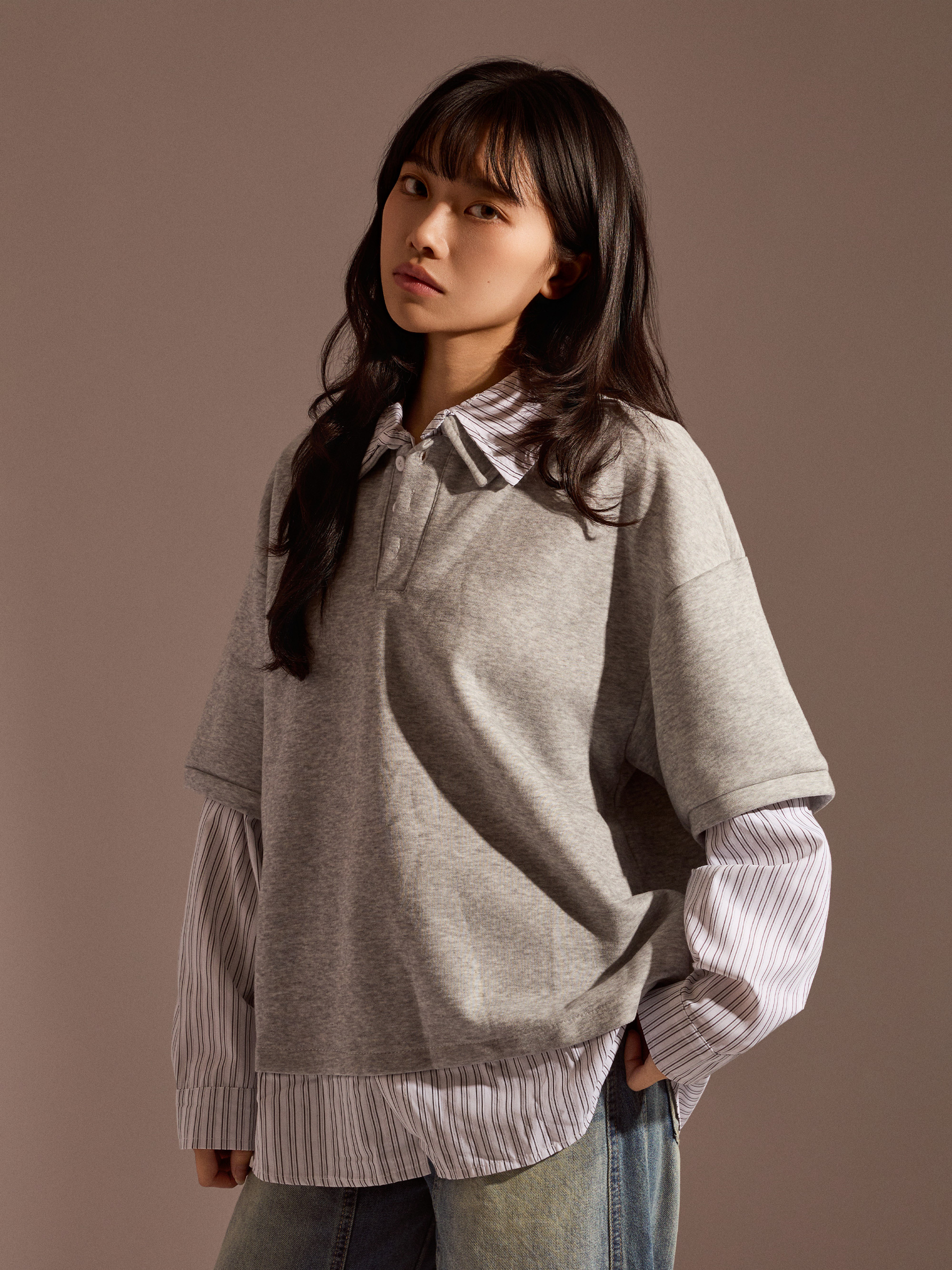 ‧假兩件設計:POLO 與條紋襯衫一體成型,層次分明、俐落有型