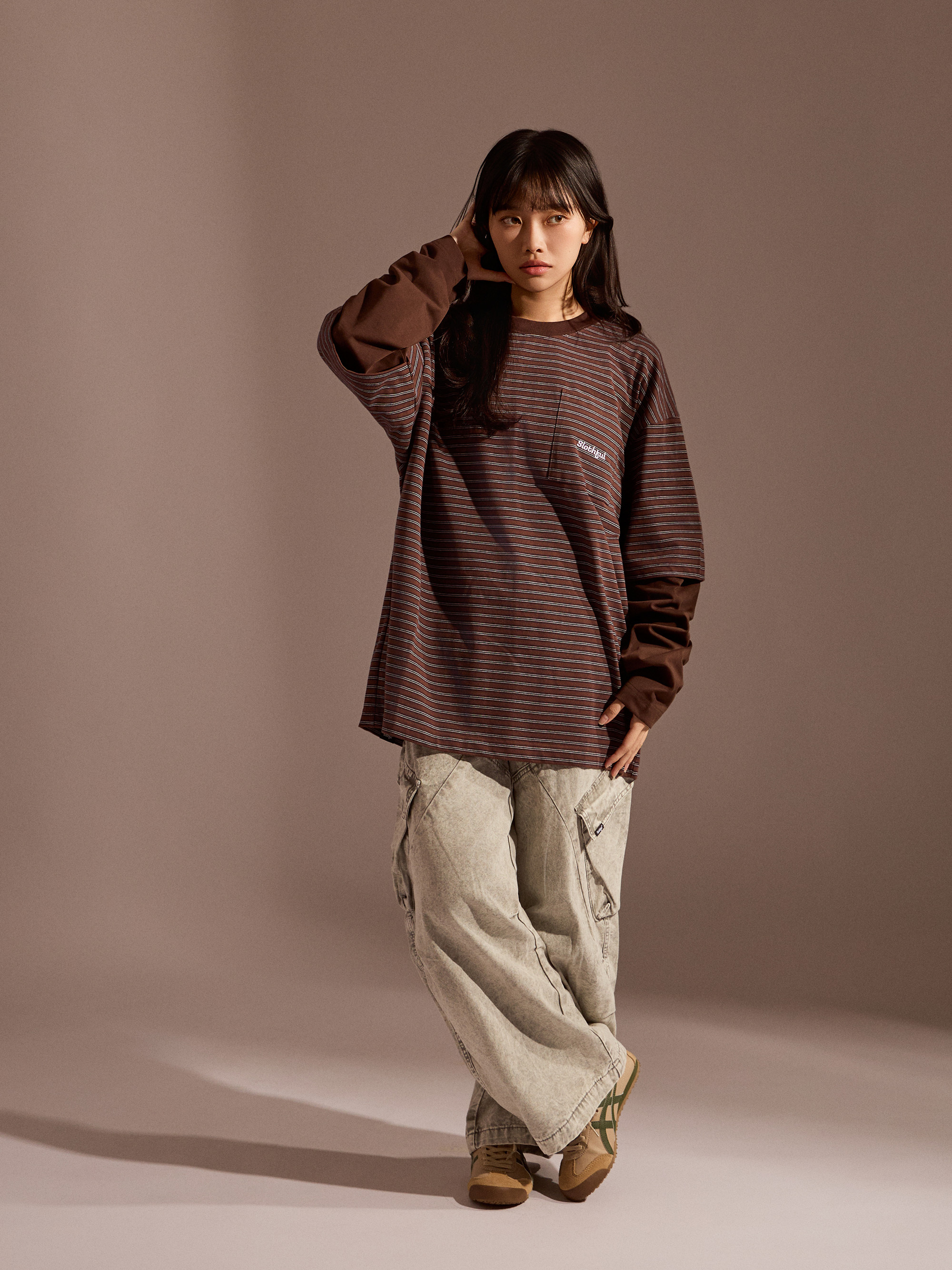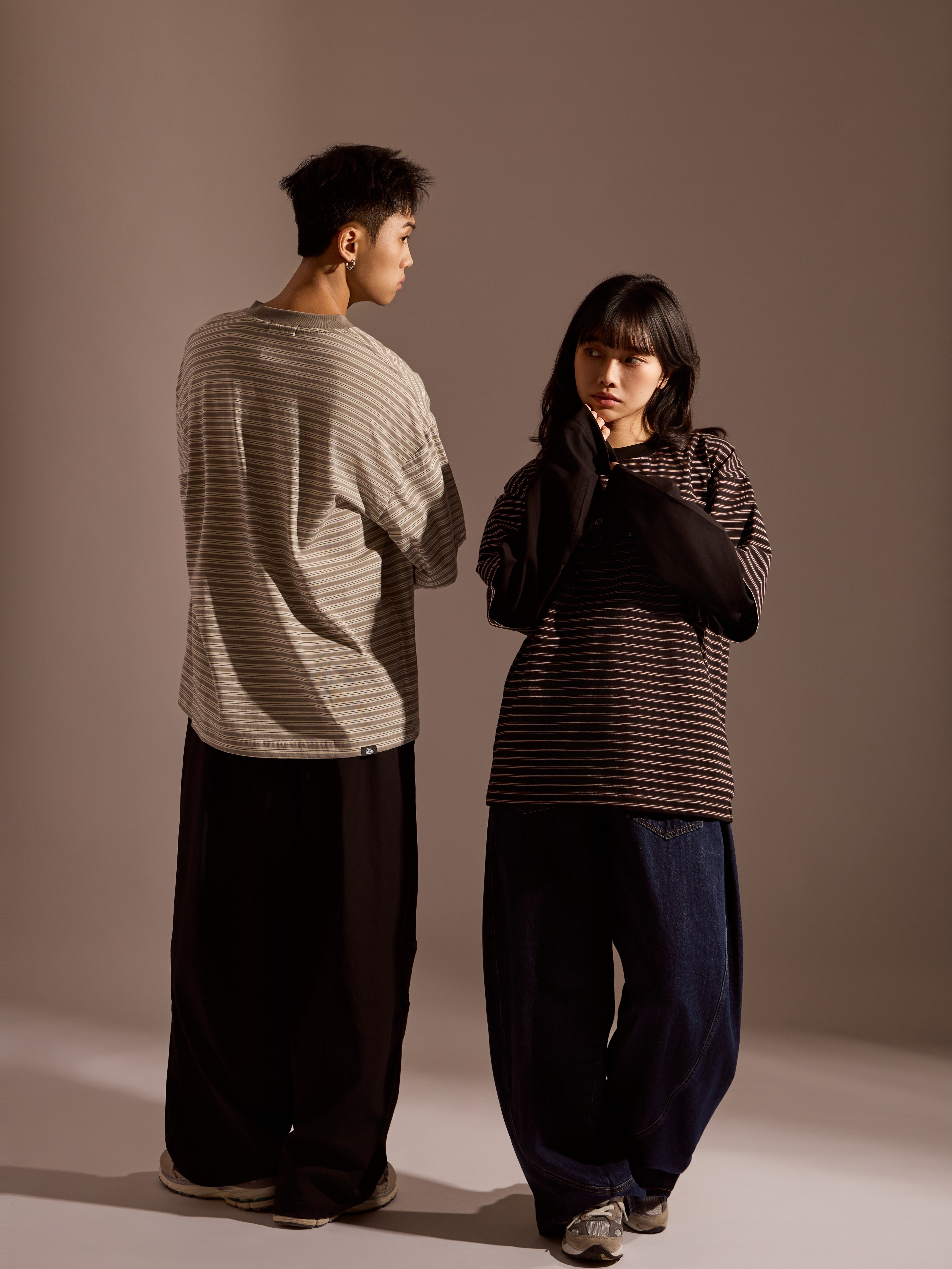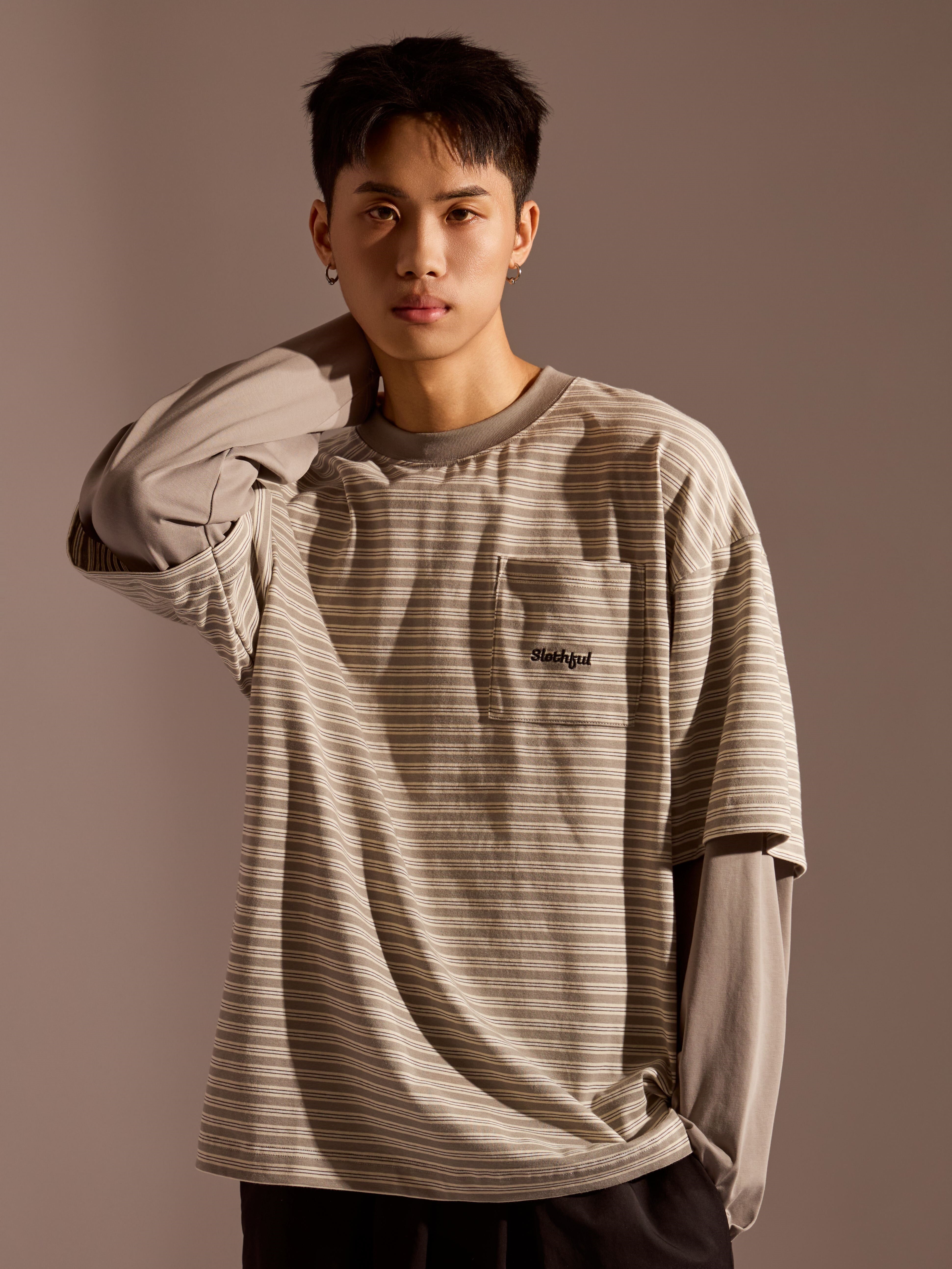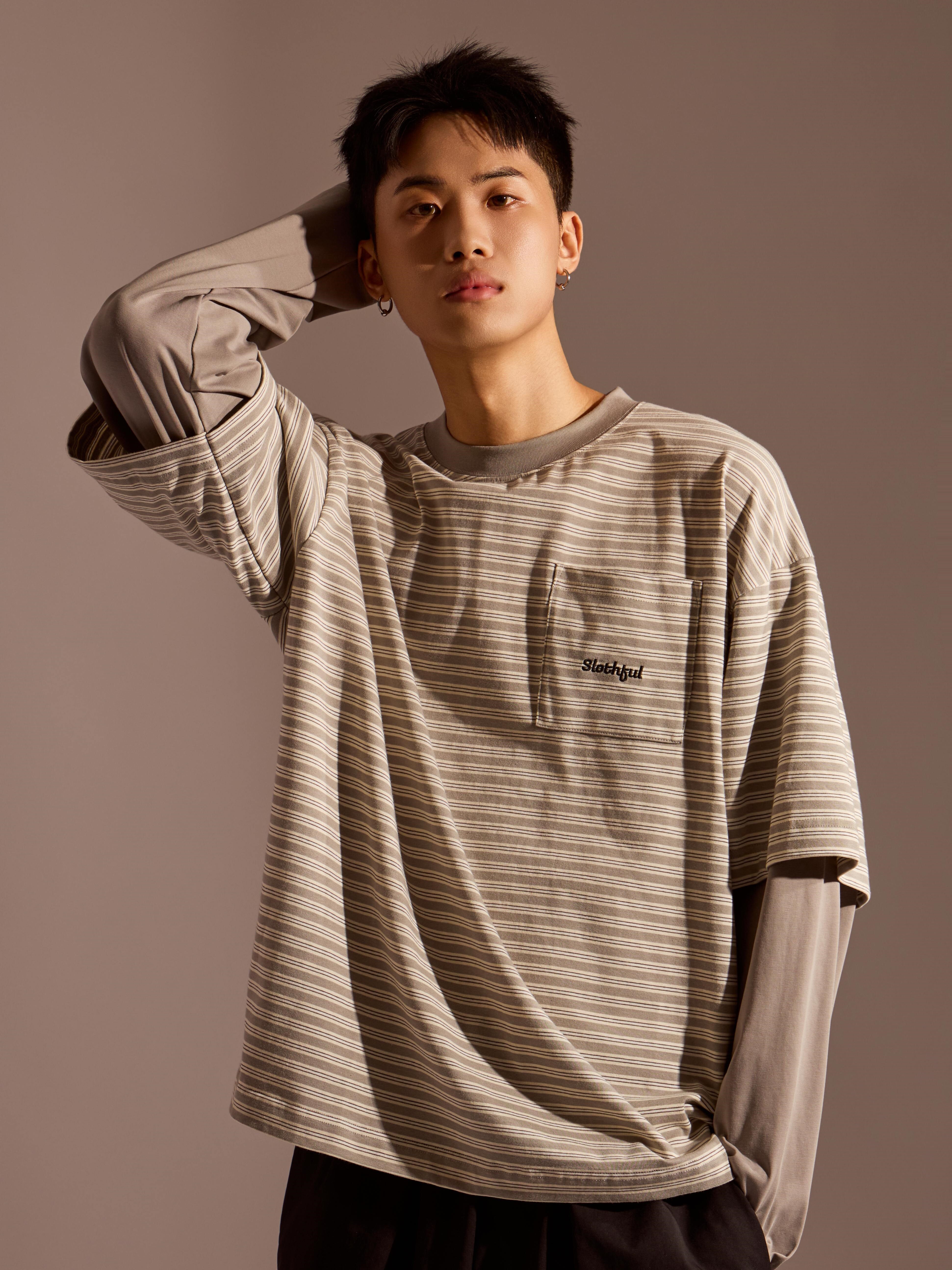 ‧條紋+素色袖子配色:大身條紋搭配素色長袖,對比更突出