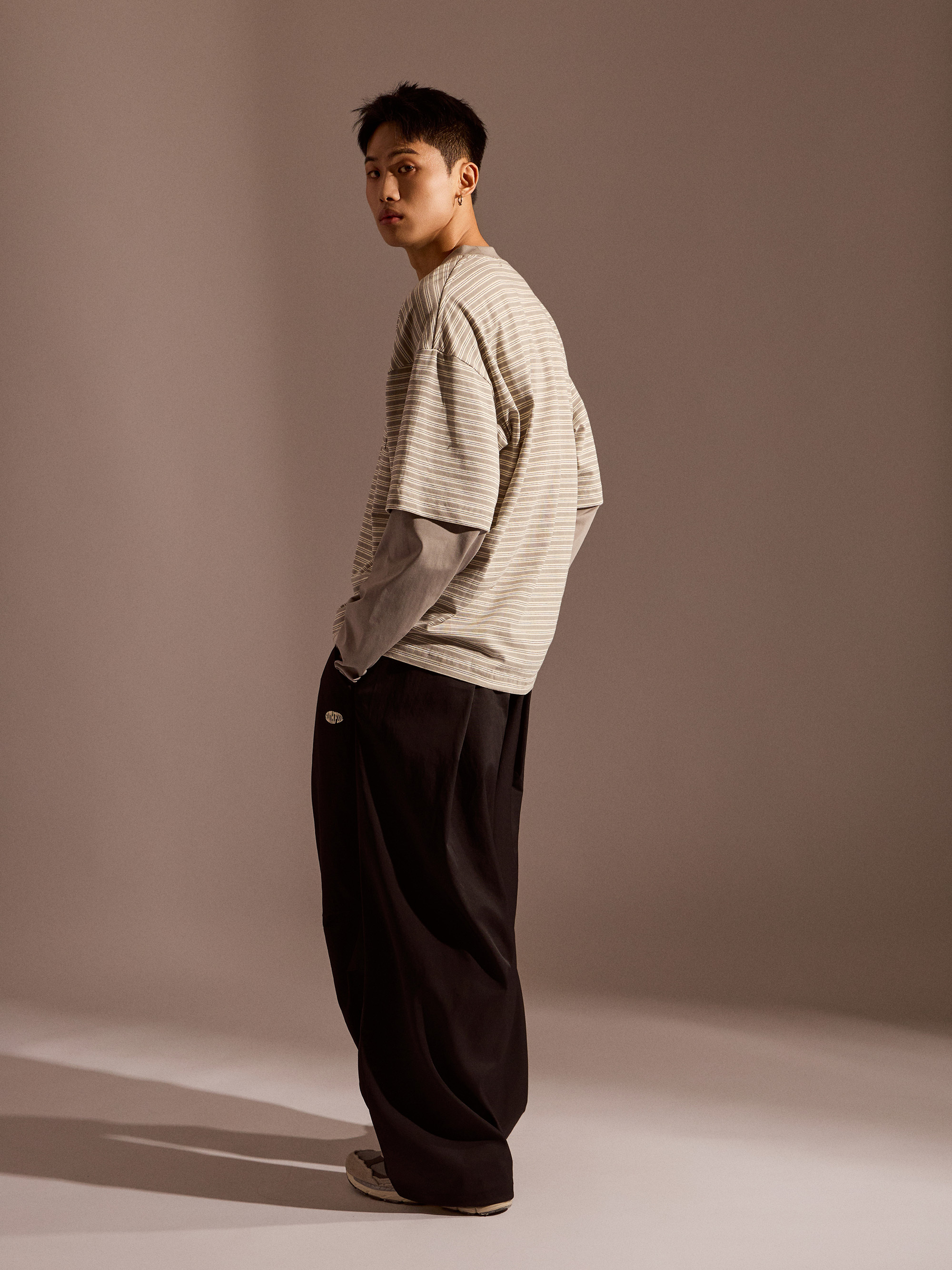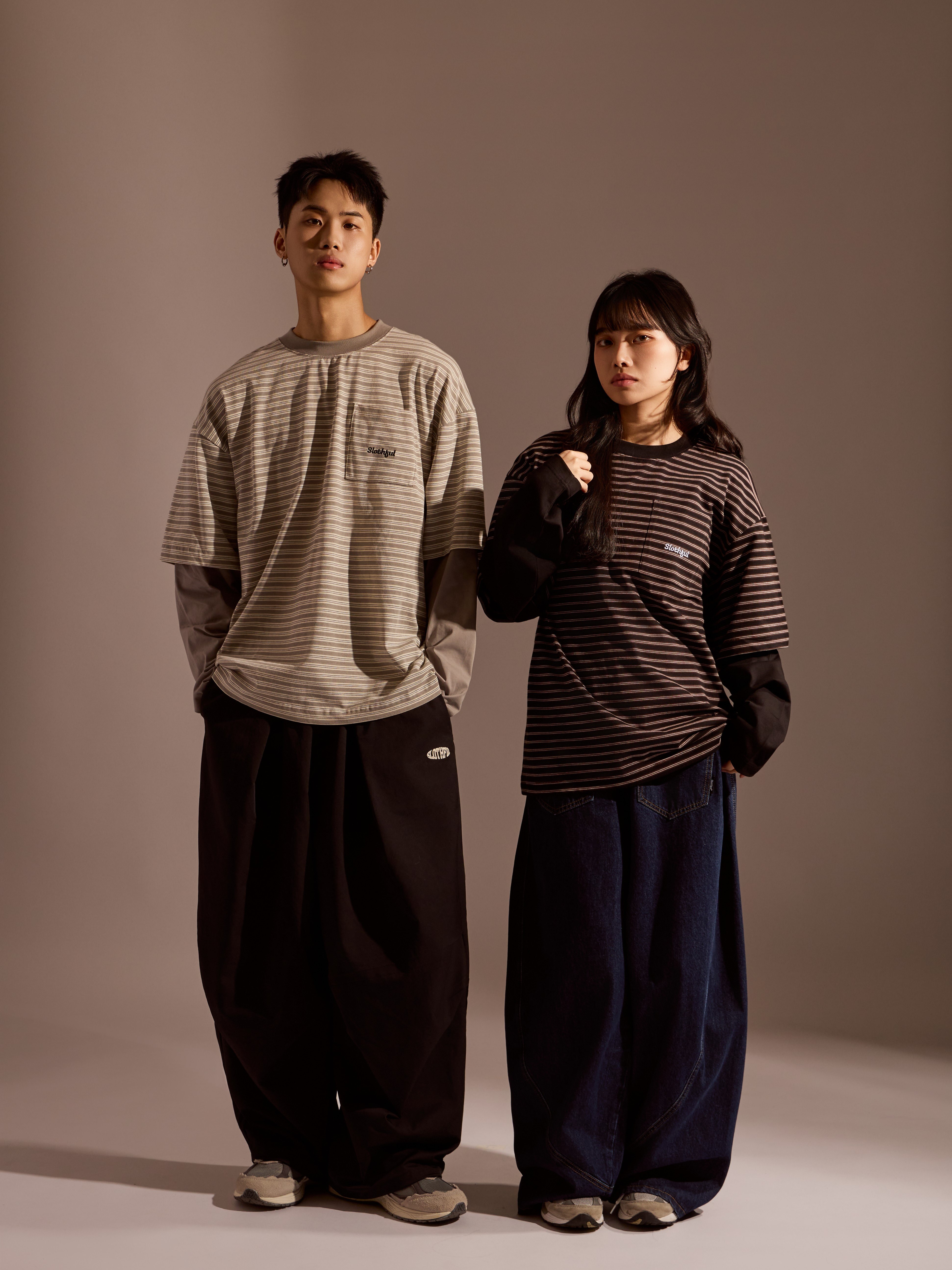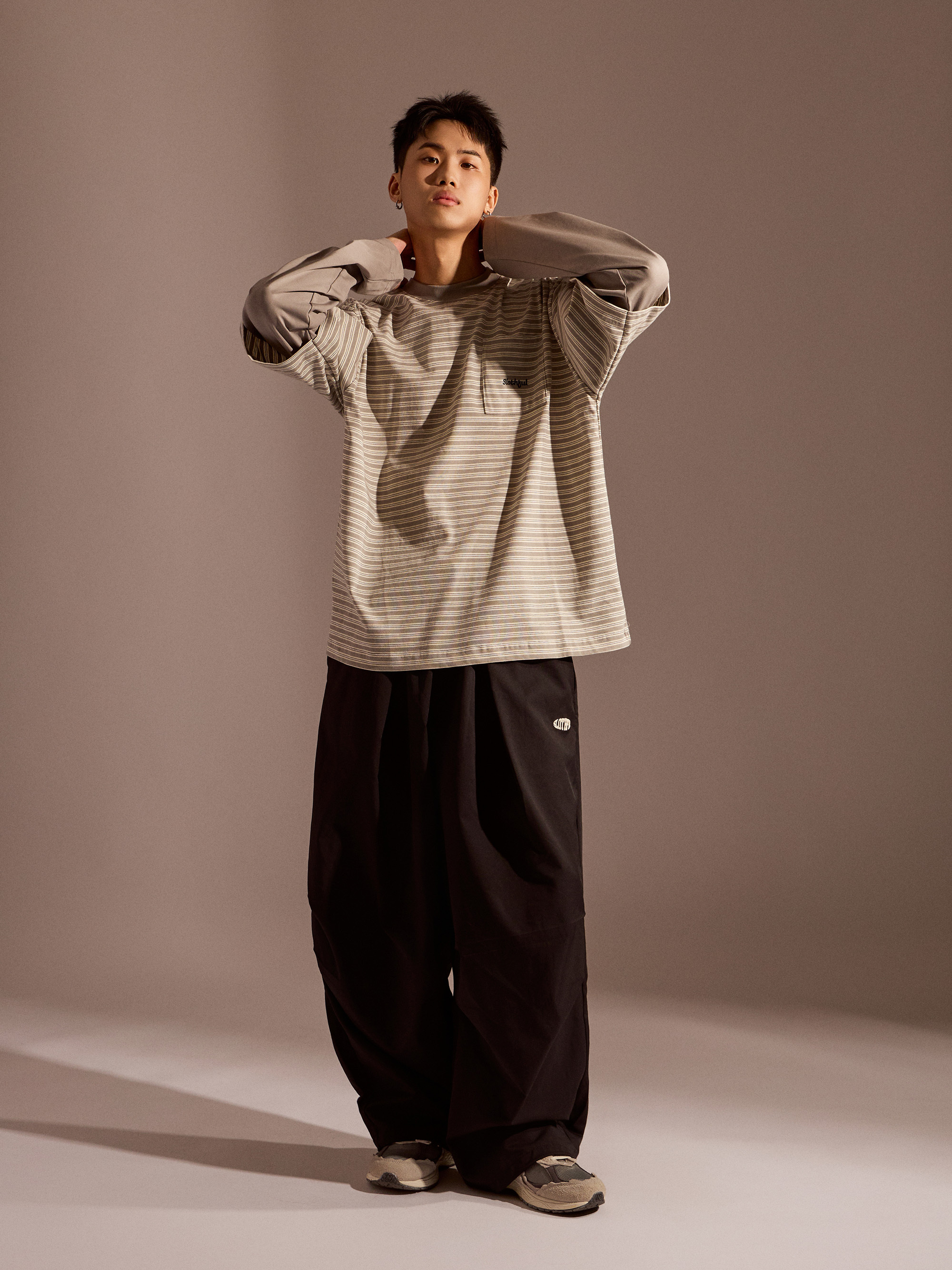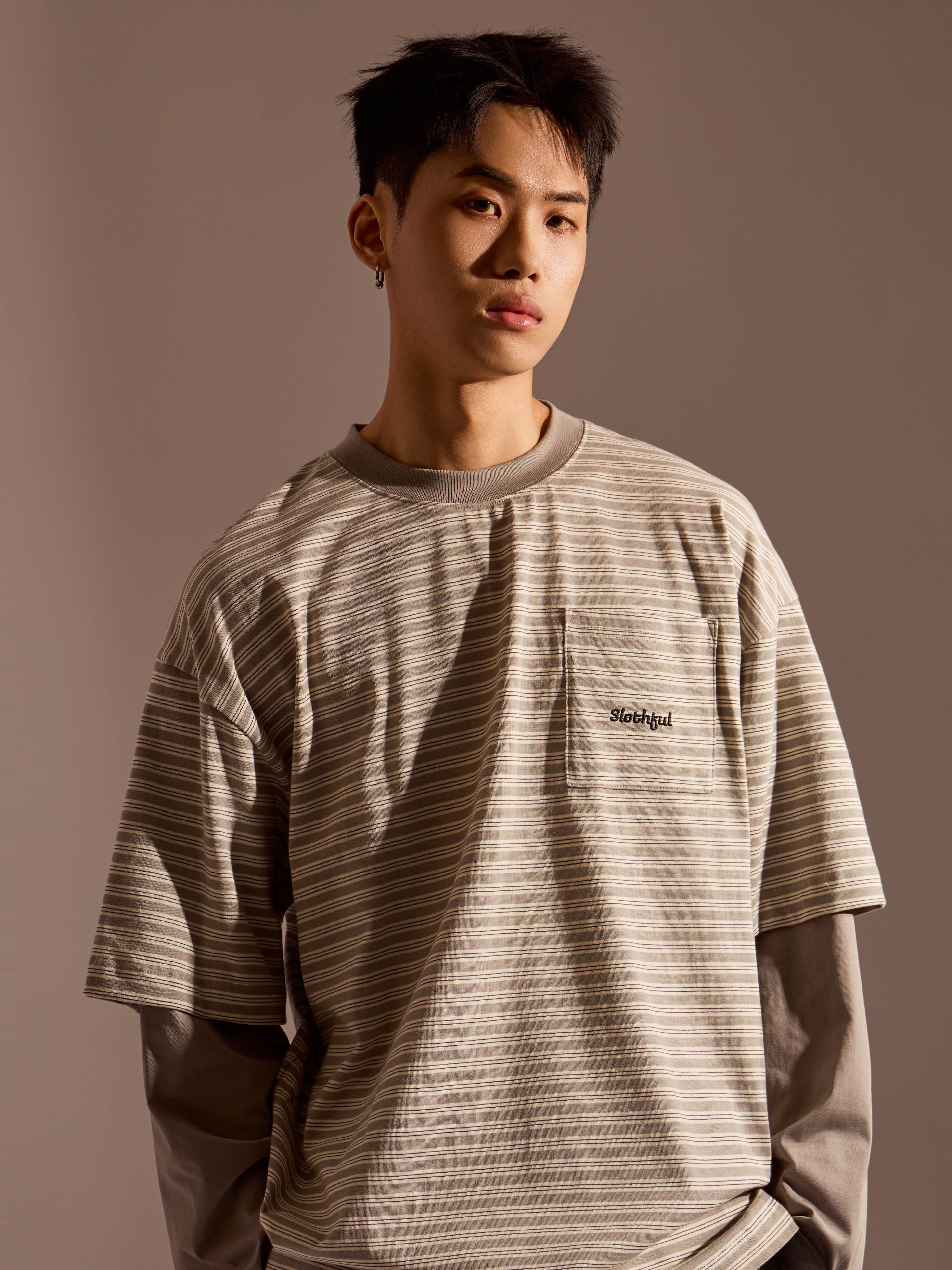 ‧條紋+素色袖子配色:大身條紋搭配素色長袖,對比更突出
